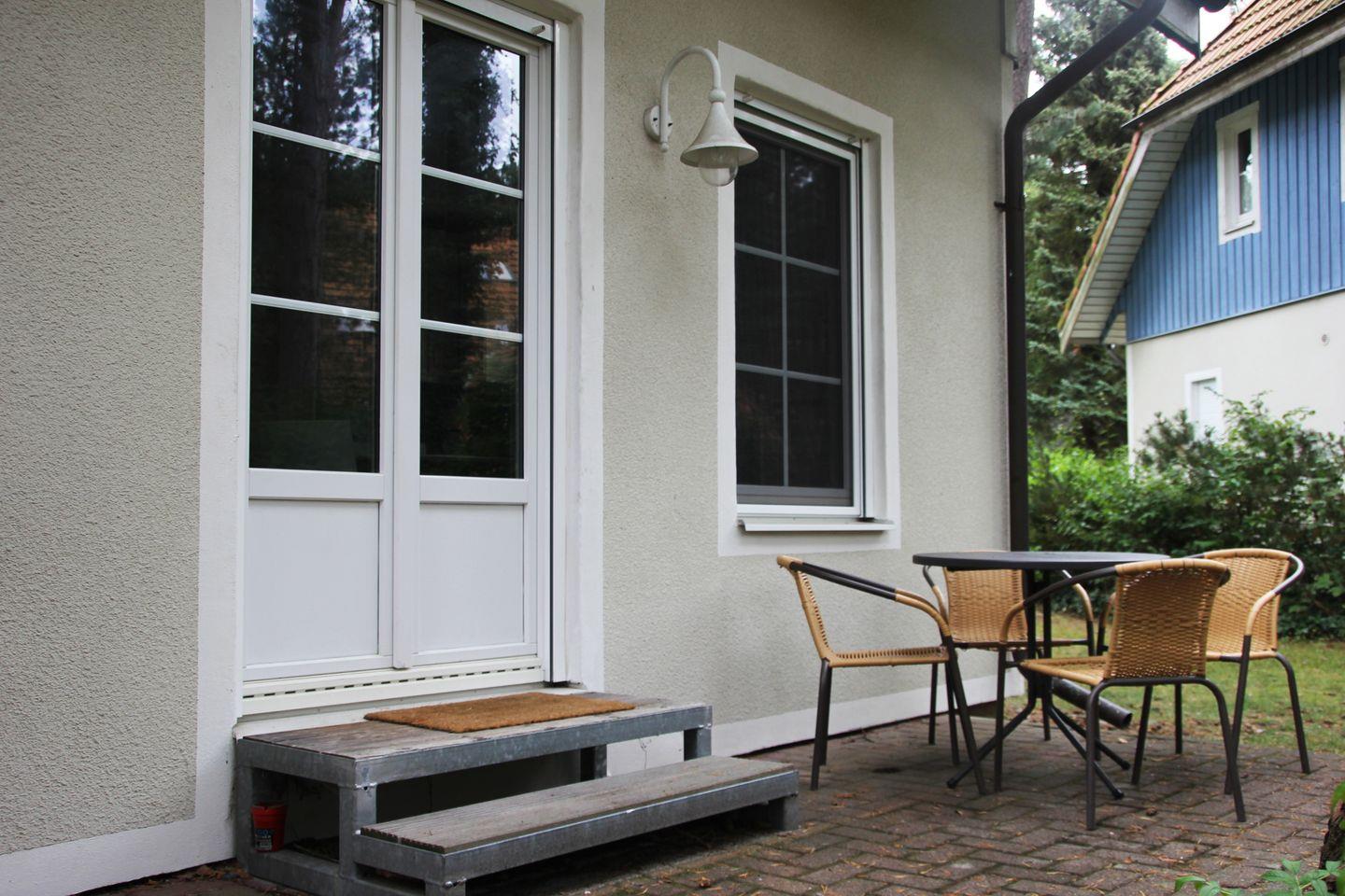 Vom Wohnzimmer gelangen Sie auf die Terrasse, welche mit Gartenmöbeln ausgestattet ist. In dem kleinen Schlafzimmer befindet sich ein gemütliches Doppelbett (160x200).