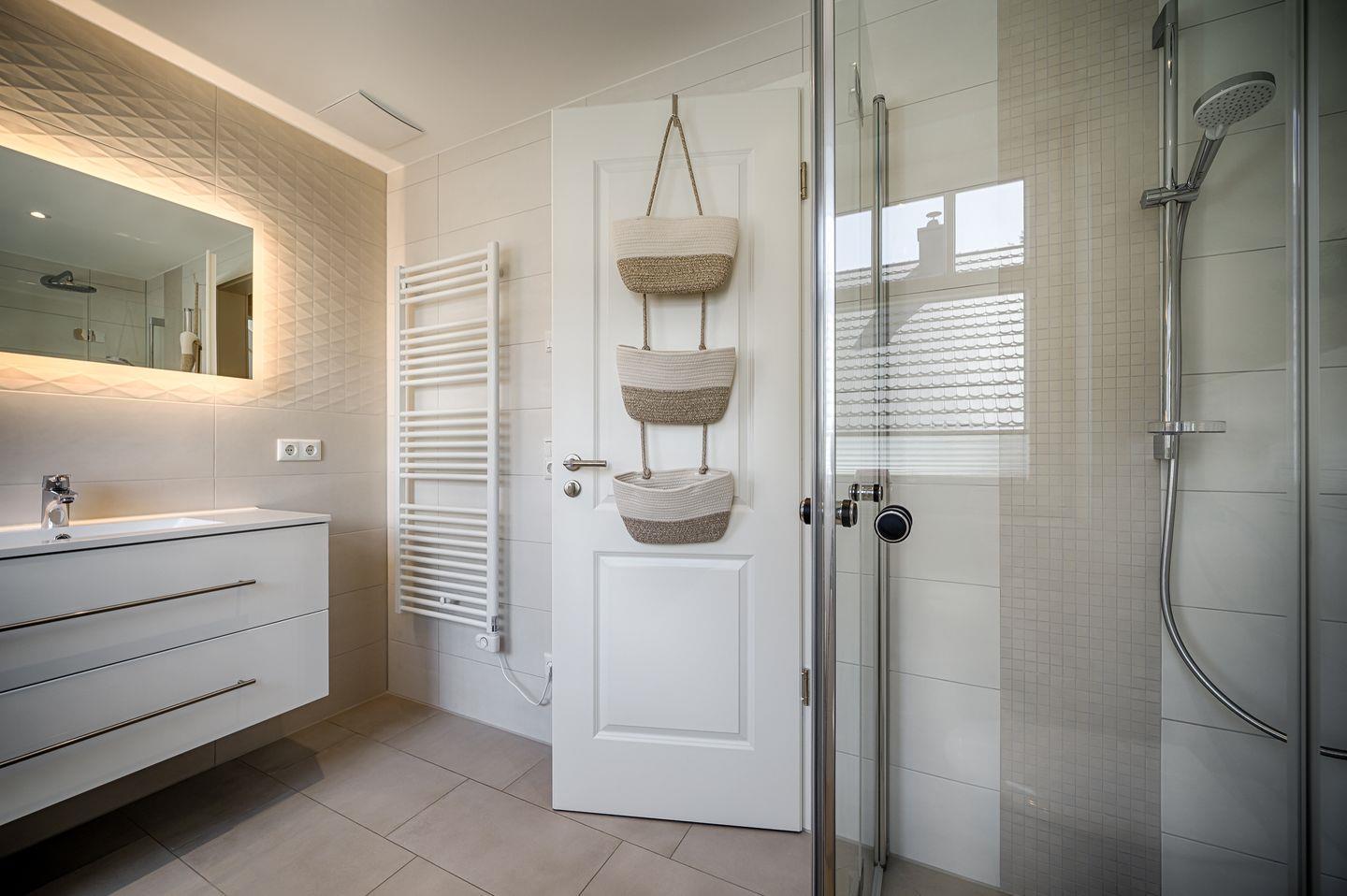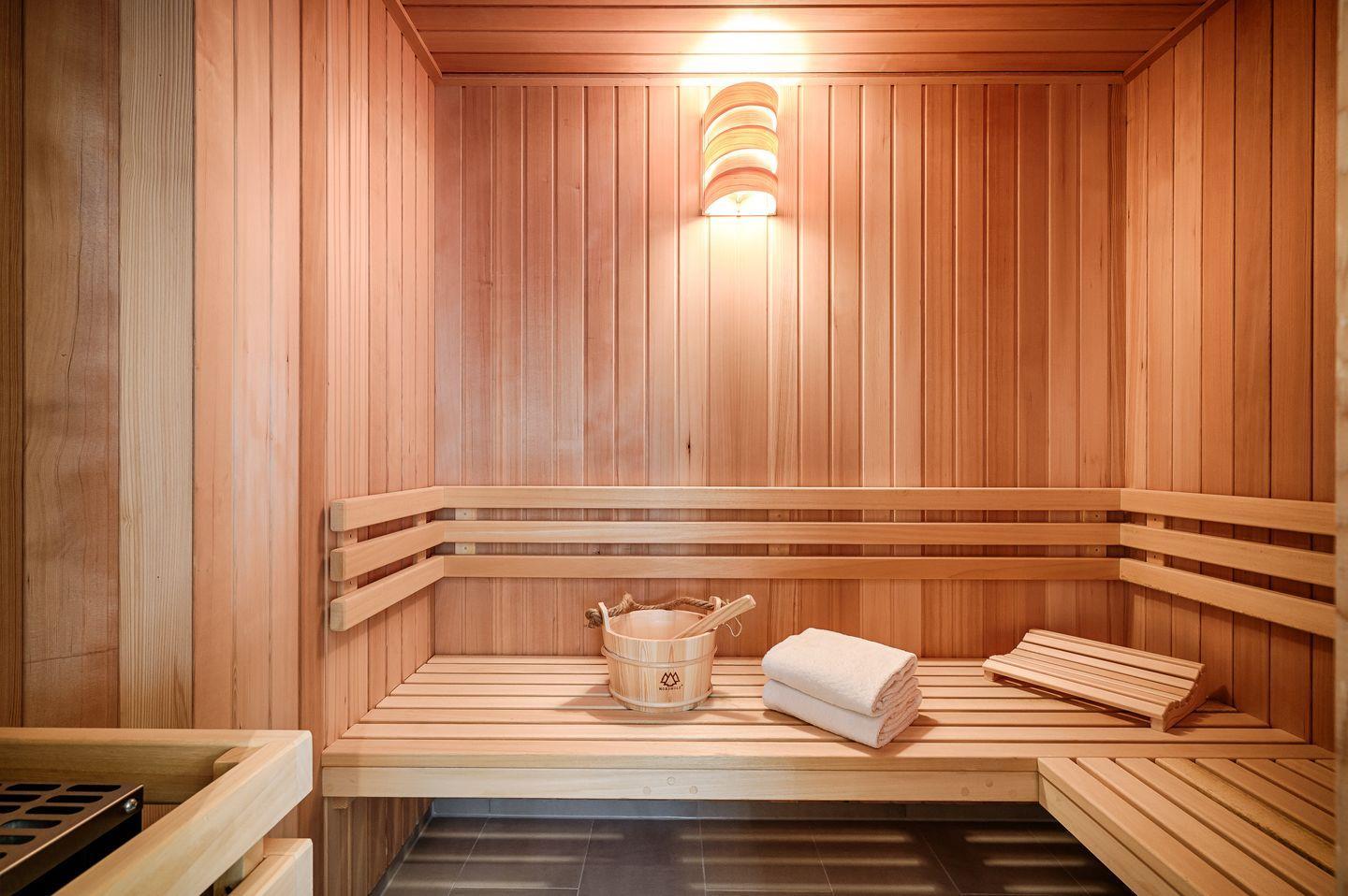 Badezimmer mit ebenerdiger Dusche und anliegender Sauna