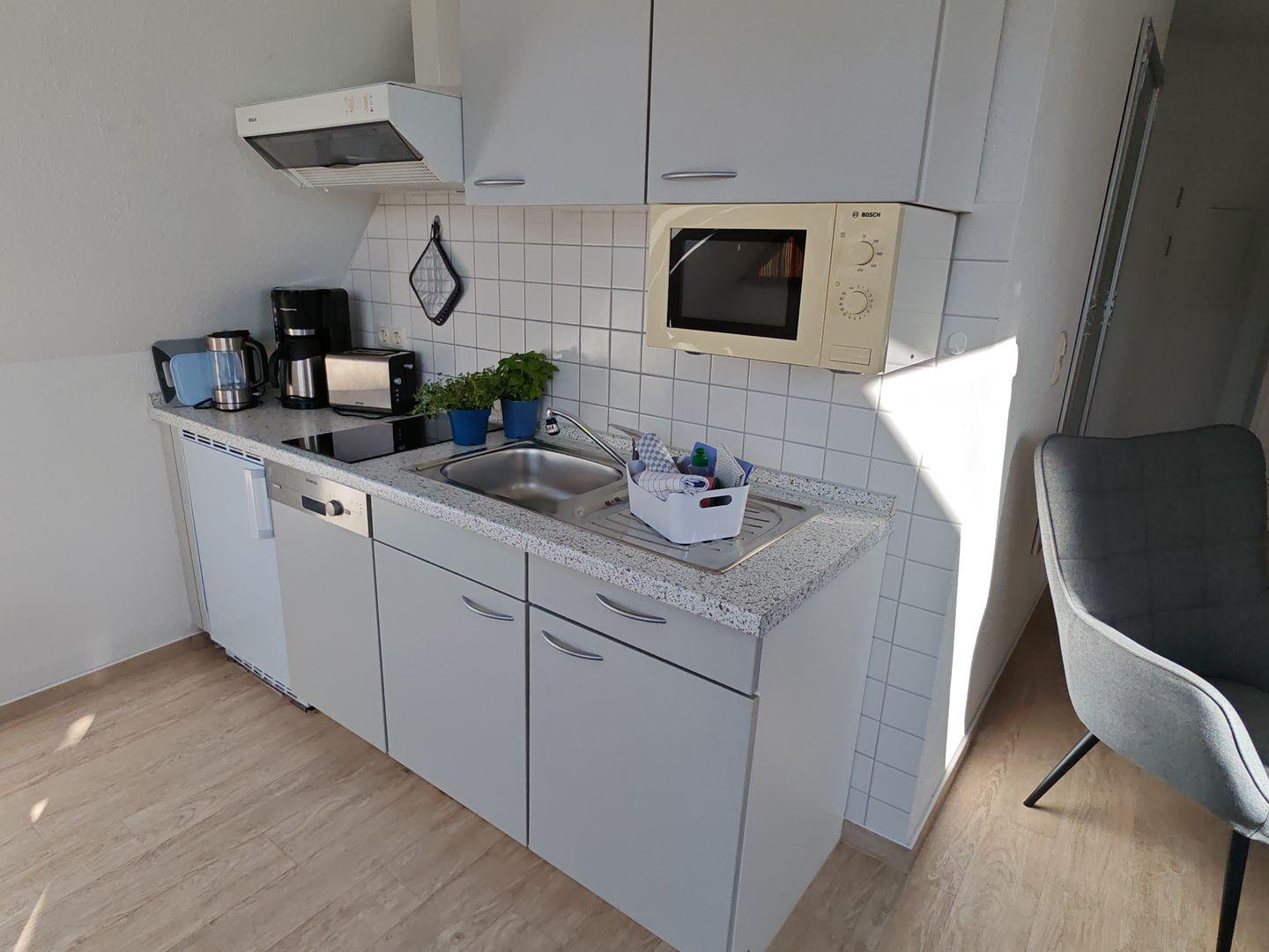 Die offene Küche ist modern und komplett ausgestattet, um Ihren kulinarischen Vorlieben gerecht zu werden. Ein geräumiges Sofa und ein gemütlicher Sessel im Wohnbereich schaffen eine behagliche Atmosphäre. Hier können Sie sich nach einem ereignisreichen Tag entspannen oder in geselliger Runde zusammenkommen.