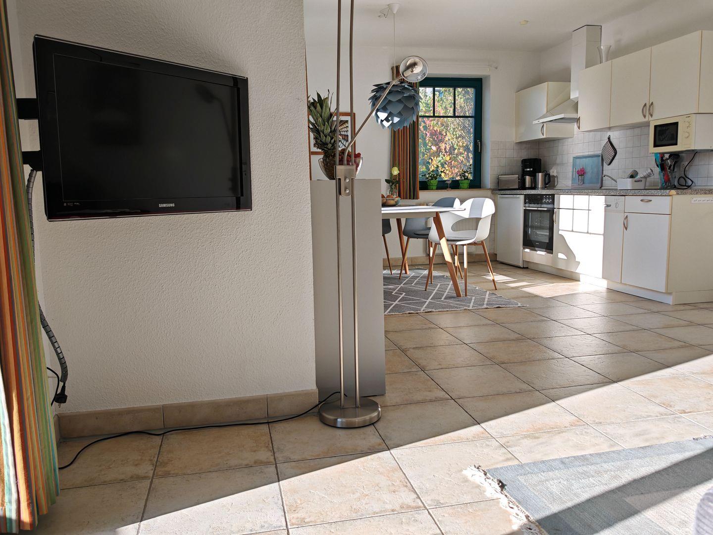 Der große Esstisch lädt dazu ein, gemeinsame Mahlzeiten in gemütlicher Runde zu genießen. Der Wohnbereich ist mit einem komfortablen Sofa, einem Sessel und einem TV ausgestattet, um Ihnen entspannte Stunden zu ermöglichen.