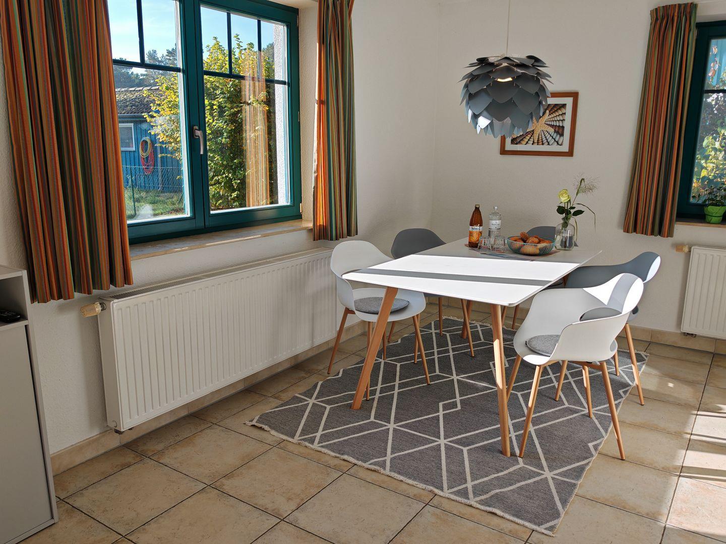 Willkommen in unserer 3-Zimmer-Ferienwohnung (ehemals "Morten") mit 56 qm. Das große Schlafzimmer und das Zimmer mit Tagesbett bieten erholsamen Schlafkomfort. Das Tageslichtbad verspricht Frische und Wohlbefinden. In der offenen Küche finden Sie moderne Annehmlichkeiten und am großen Esstisch Platz für gesellige Mahlzeiten. Die Südterrasse mit Blick auf die Wiese lädt zu entspannten Momenten ein. Genießen Sie den Wohnbereich mit Sofa, Sessel und TV. – der ideal Rückzugsort um sich wohlzufühlen.