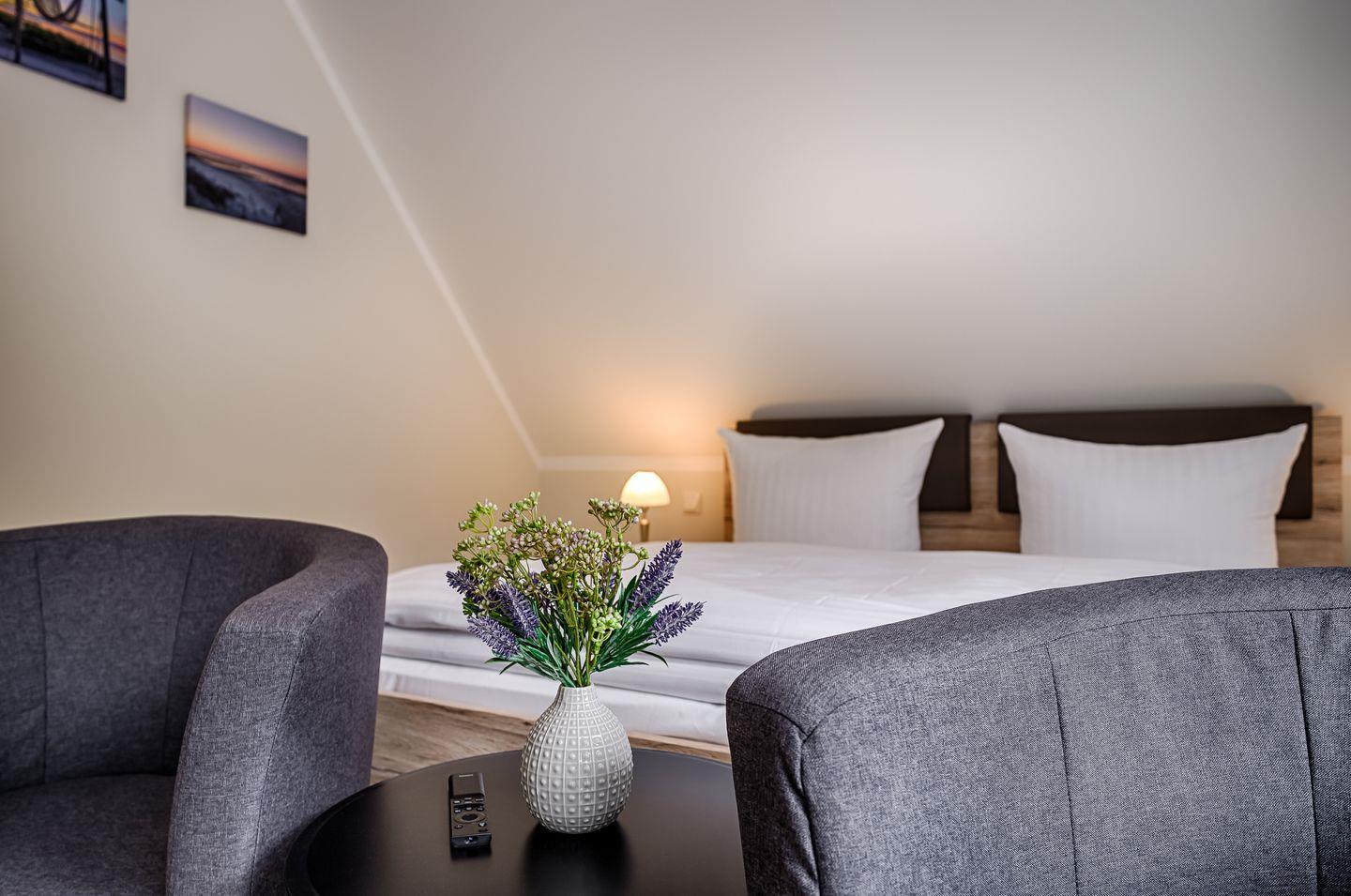 1 Schlafzimmer mit Doppelbett (1,80 x 2,00 m) und Zugang zur Dachterrasse, TV, 2 Sessel, raumanliegend eigenes Badezimmer mit DU/WC