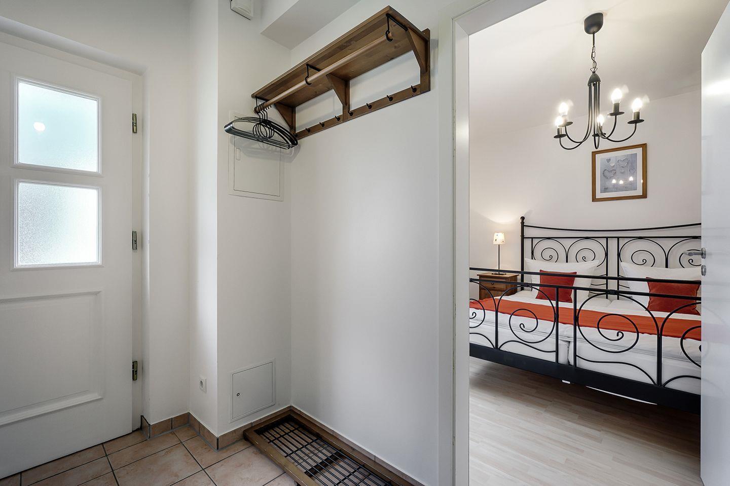 Das Schlafzimmer ist mit einem Doppelbett (180 x 200 cm) ausgestattet, und auf Wunsch können ein Reisebett (ohne Bettzeug) sowie ein Hochstuhl bereitgestellt werden.