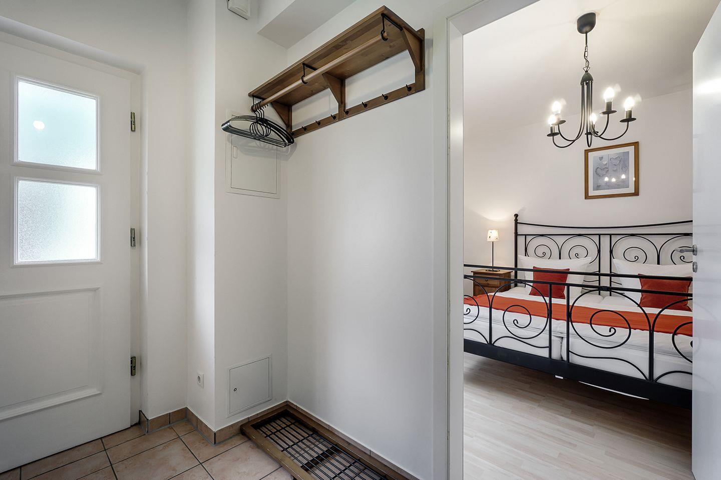 Das Schlafzimmer ist mit einem Doppelbett (180 x 200 cm; durchgehende Matratze) ausgestattet und auf Wunsch können ein Reisebett (ohne Bettzeug) sowie ein Hochstuhl bereitgestellt werden.