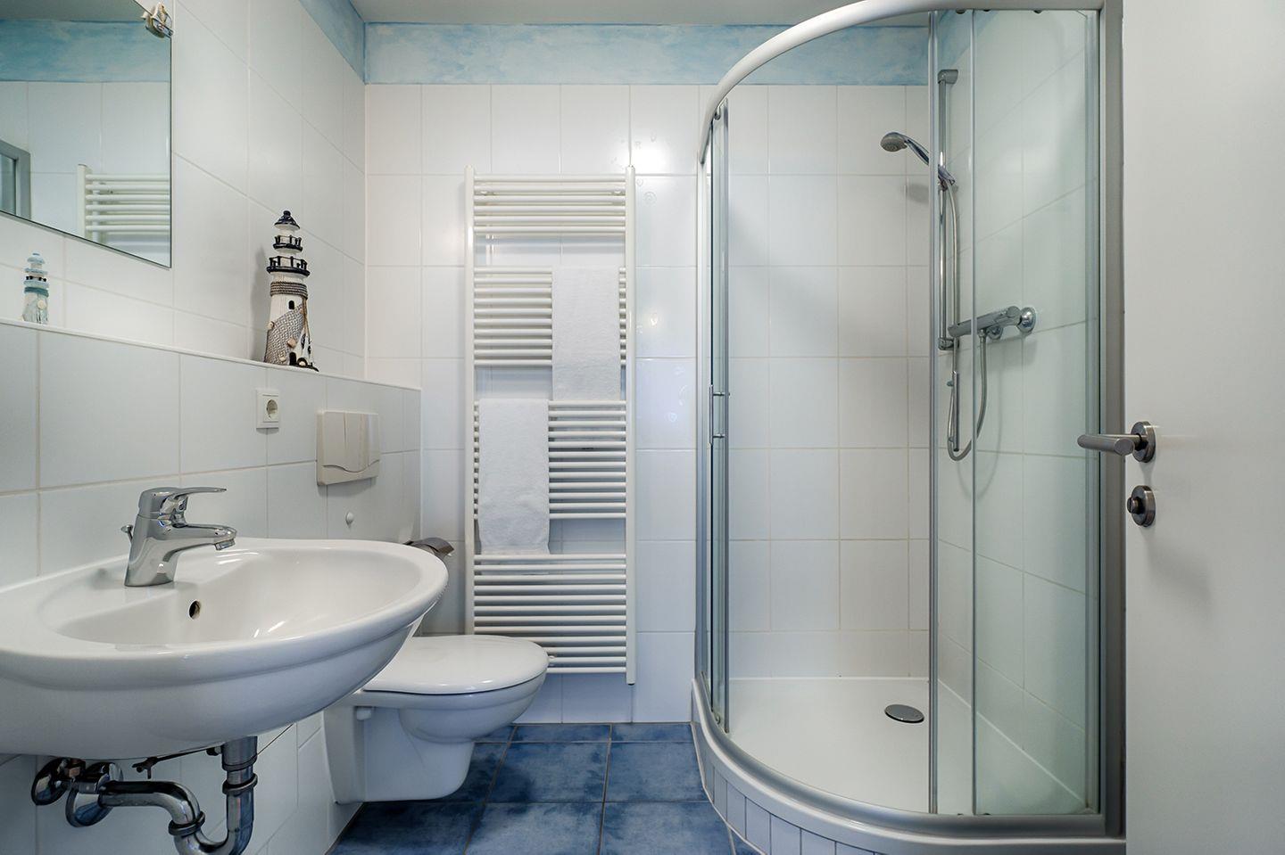 Das moderne Duschbad verfügt über eine Dusche, ein WC und ein Waschbecken. Fliegenschutzgitter sorgen für zusätzlichen Komfort.
