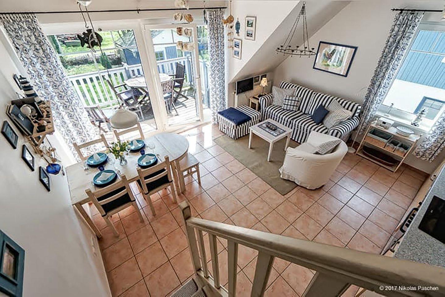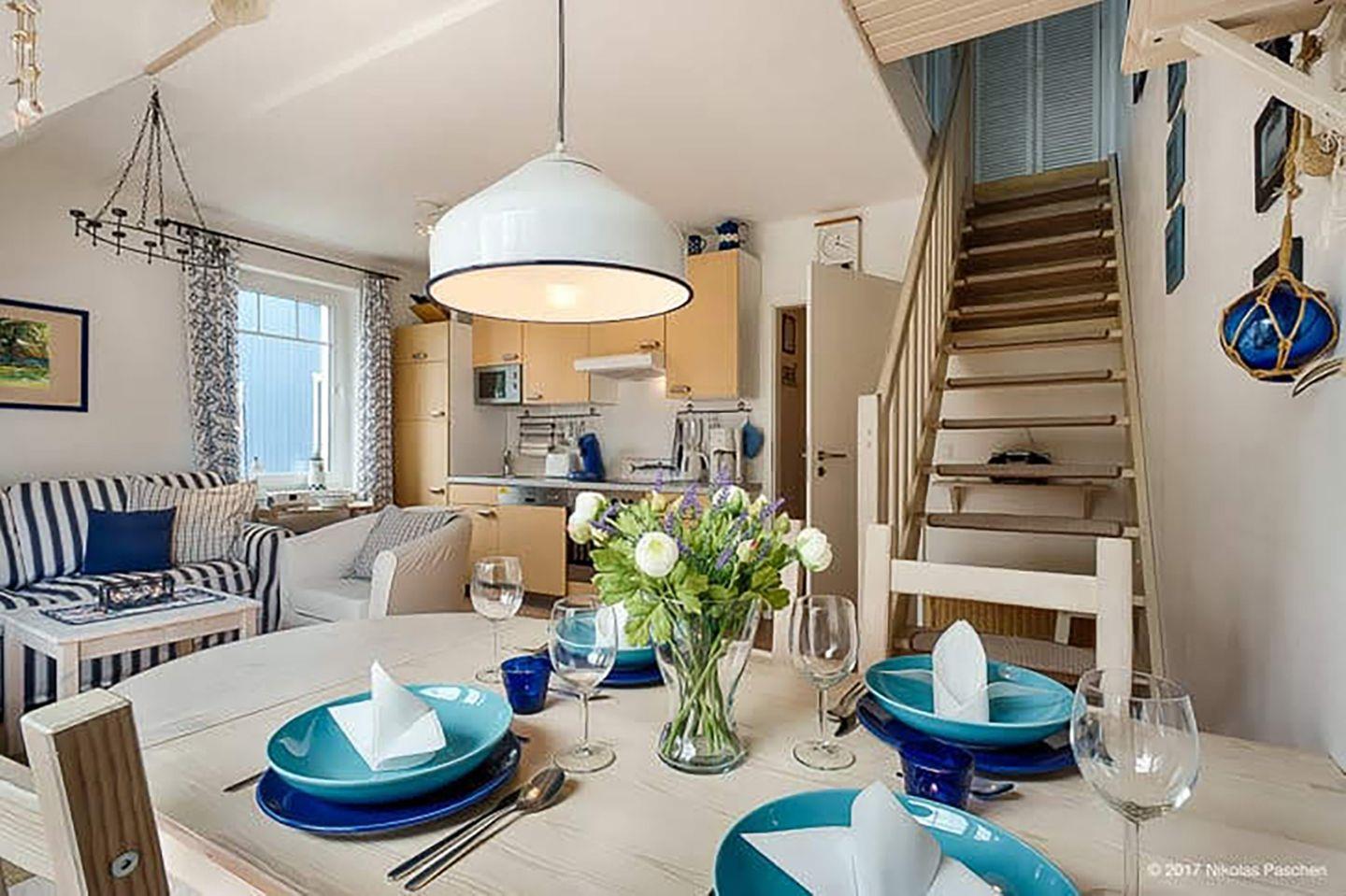 Im Obergeschoss finden Sie einen gemütlichen Wohnbereich mit Sofa und kleinem Flachbild-Sat-TV sowie einen Essbereich für vier Personen. Die offene Küche ist gut ausgestattet mit einem Kühlschrank (mit Gefrierfach), Cerankochfeld, Backofen, Geschirrspüler, Kaffeemaschine, Toaster, Wasserkocher und Mikrowelle.