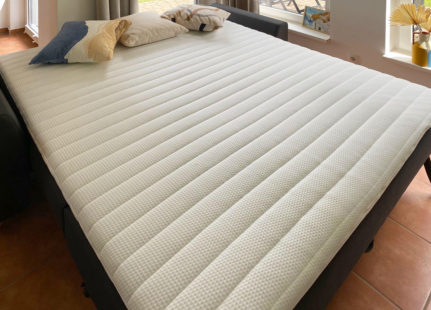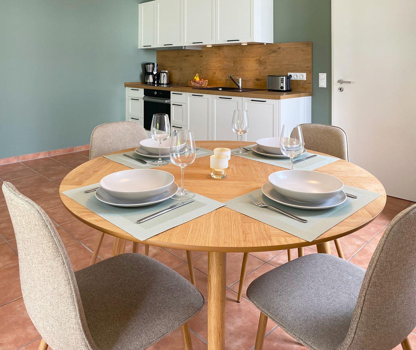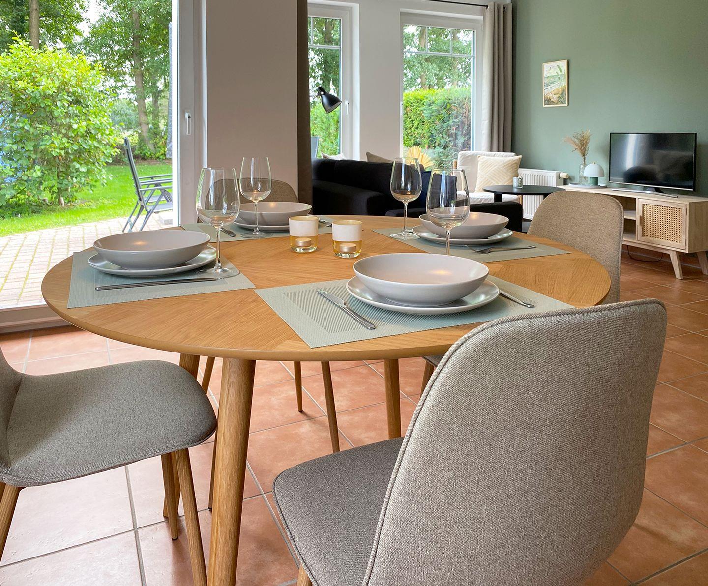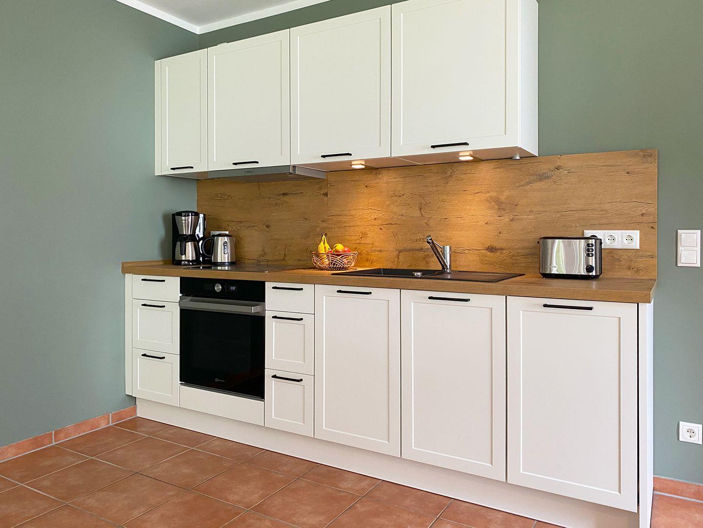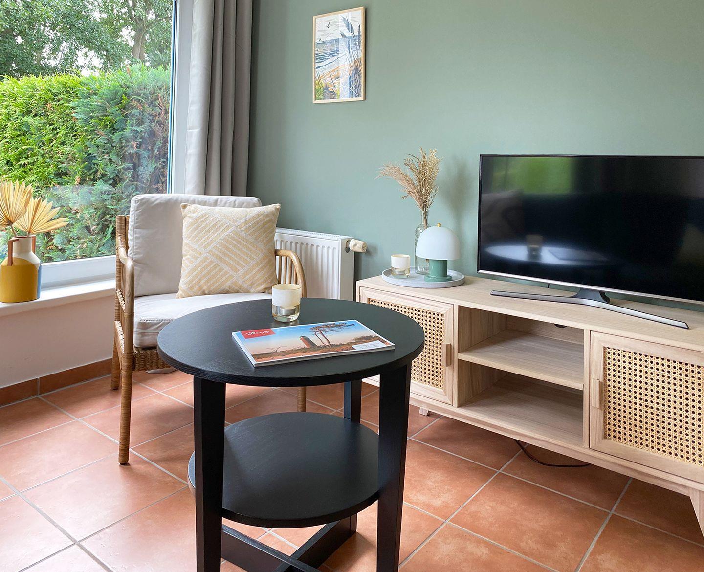 Der Wohnbereich ist mit einem komfortablen Sofa ausgestattet, das als Schlaffunktion (160 x 200 cm) mit Boxspring-Technologie genutzt werden kann. Ein Flachbild-TV sorgt für Unterhaltung, und der Essbereich bietet Platz für vier Personen. Die offene Küche ist gut ausgestattet mit einem Kühlschrank (mit Gefrierfach), Induktionskochfeld, Backofen, Geschirrspüler, Kaffeemaschine, Toaster und Wasserkocher – perfekt für die Zubereitung von Mahlzeiten.