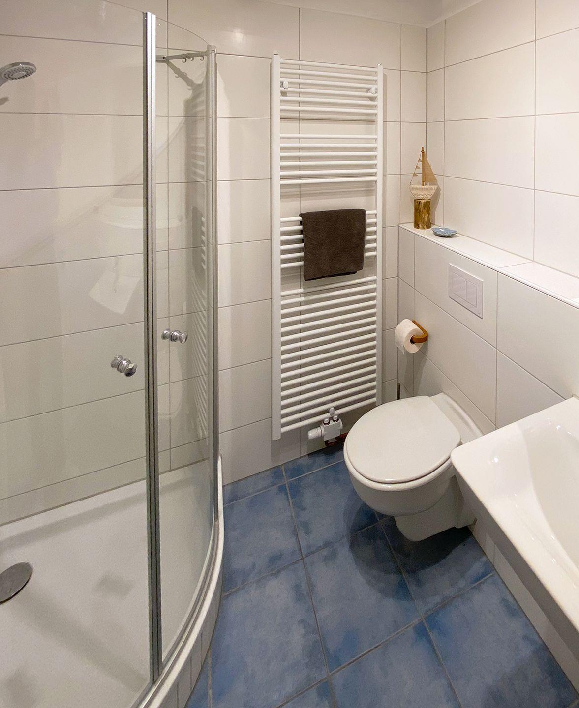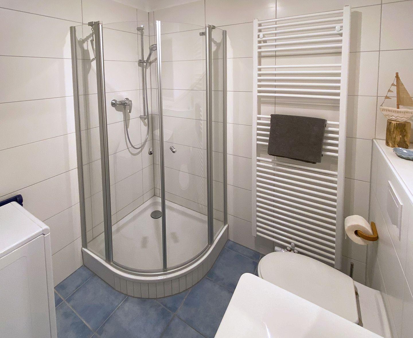 Ein modernes Duschbad mit WC, Waschbecken und Waschmaschine rundet den Wohnbereich ab. Das Schlafzimmer ist mit einem Doppelbett (160 x 200 cm, durchgehende Matratze) und einem Kleiderschrank ausgestattet. Zusätzlich gibt es eine Schlafkoje mit einem Bodenbett (120 x 200 cm), ideal für ein Kleinkind oder eine dritte Person. Ein Hochstuhl für kleine Gäste ist ebenfalls vorhanden. Fliegenschutzgitter sorgen für angenehmen Schlaf, auch bei offenen Fenstern. Die Wohnung verfügt außerdem über einen Fahrradschuppen und einen PKW-Stellplatz.