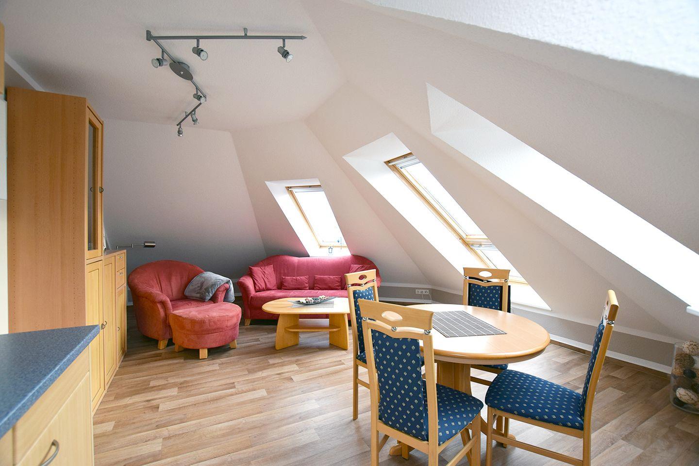 Die gemütliche Ferienwohnung für bis zu 2 Personen bietet auf ca. 35 m² Wohnfläche eine ideale Ausgangsbasis für einen erholsamen Aufenthalt. Im Dachgeschoss (DG) finden Sie den Wohn-/Essbereich, ausgestattet mit einem Esstisch, einer bequemen Sitzgarnitur, Radio mit CD und SAT-TV. Die angrenzende Küchenzeile ist mit allem ausgestattet, was Sie für Ihren Aufenthalt benötigen, darunter ein Geschirrspüler, Herd, Kaffeemaschine, Kühlschrank mit Gefrierfach, Mikrowelle, Toaster und Wasserkocher.