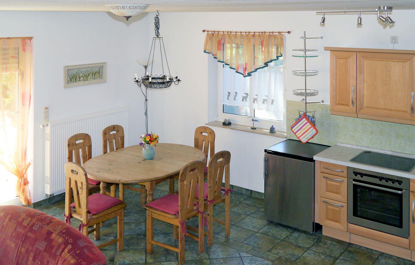 Der Wohn-/Essbereich im Erdgeschoss ist mit einem Esstisch, einer Couchecke, einem Kaminofen und einem Radio mit CD-Player ausgestattet. Eine gut ausgestattete Einbauküche mit Backofen, Geschirrspüler, Herd (Cerankochfeld), Kaffeemaschine, Kühlschrank mit Gefrierfach, Toaster und Wasserkocher bietet alles, was Sie für Ihren Aufenthalt benötigen.