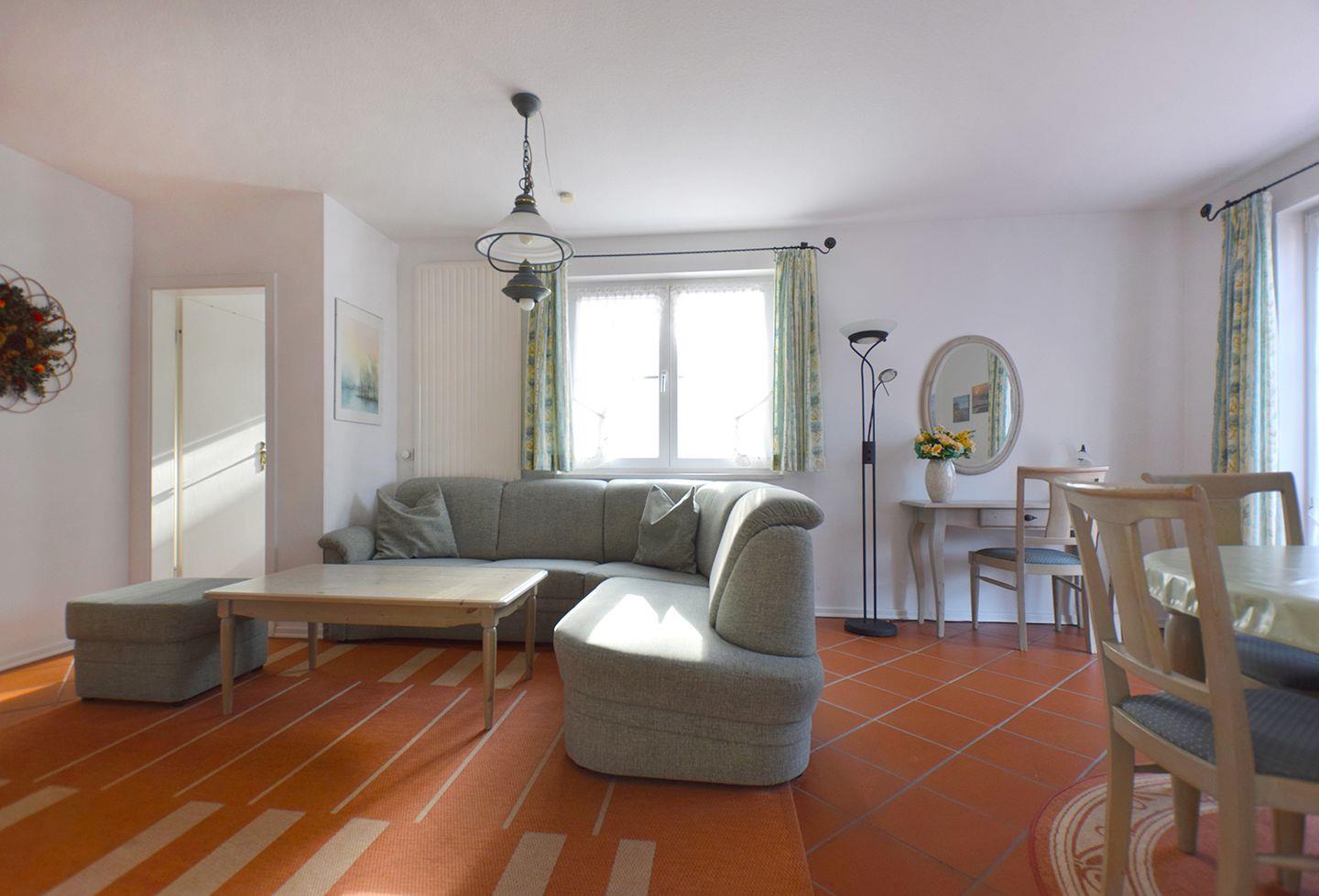 Der Wohn-/Essbereich ist komfortabel eingerichtet mit einer gemütlichen Sitzgarnitur, einem Flachbild-SAT-TV, einem CD-Player sowie einem Esstisch mit Stühlen, an dem alle Gäste Platz finden.