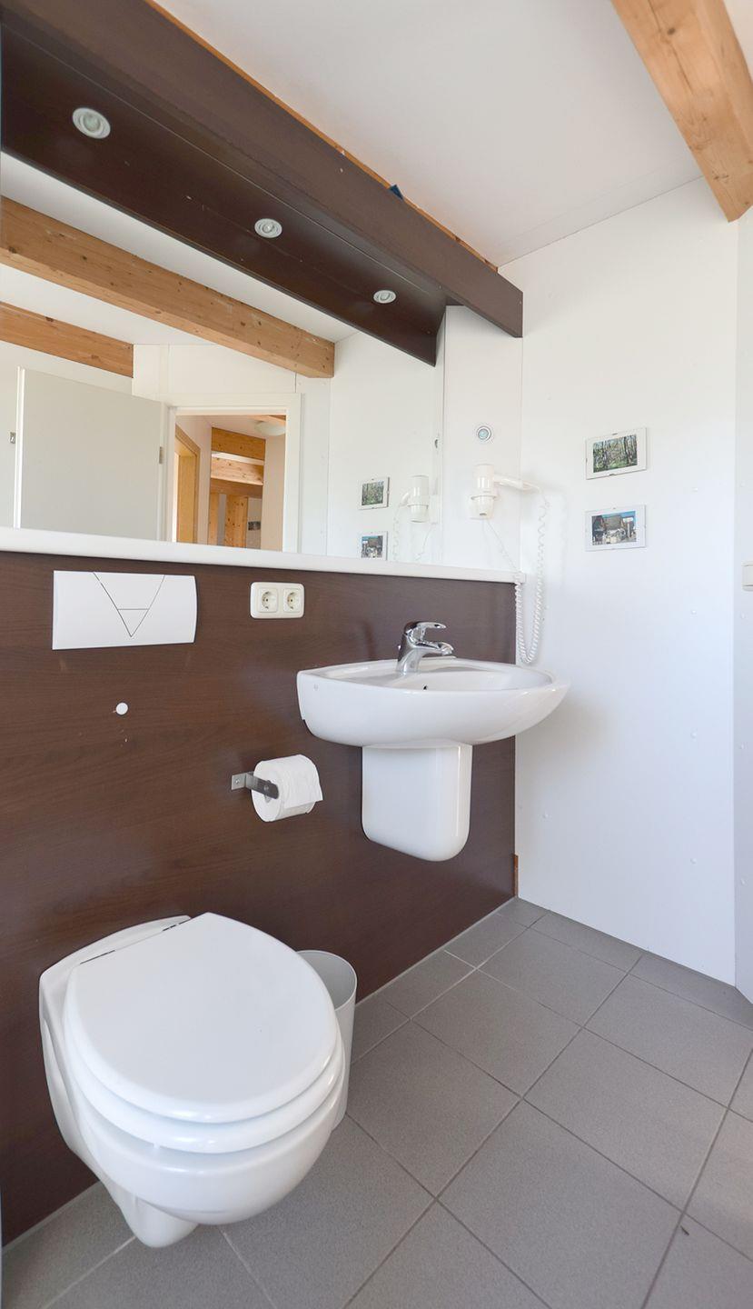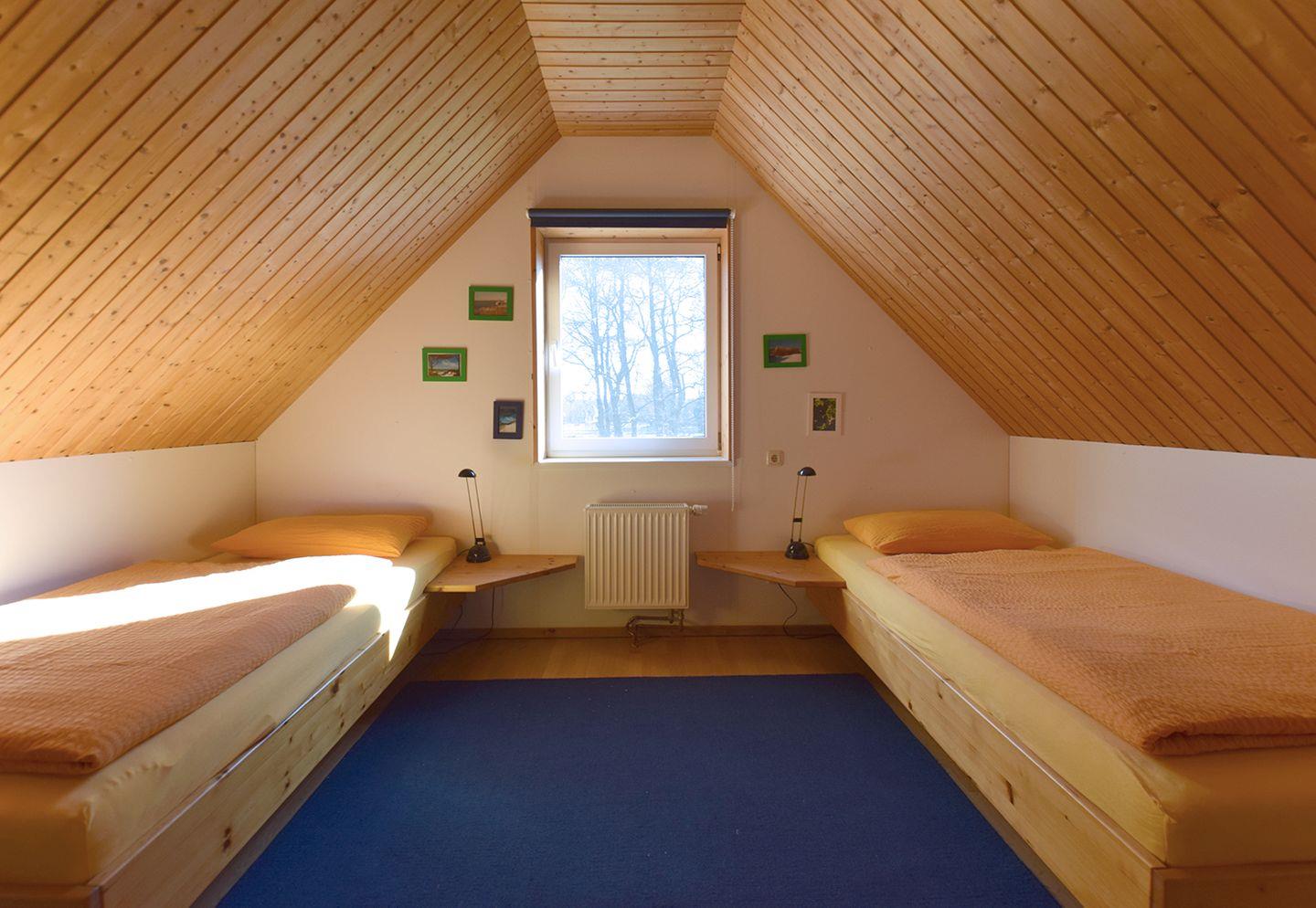Das Obergeschoss ist mit zwei Schlafzimmern ausgestattet, die über eine Treppe mit Kindersicherung erreichbar sind. Ein Schlafzimmer verfügt über ein Familienbett (270 x 200 cm) und das zweite über zwei Einzelbetten (90 x 200 cm).