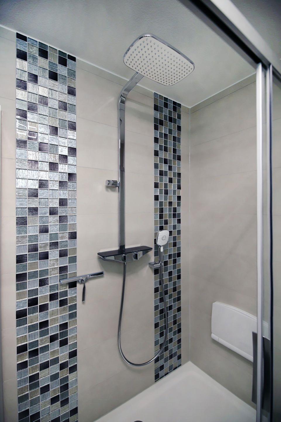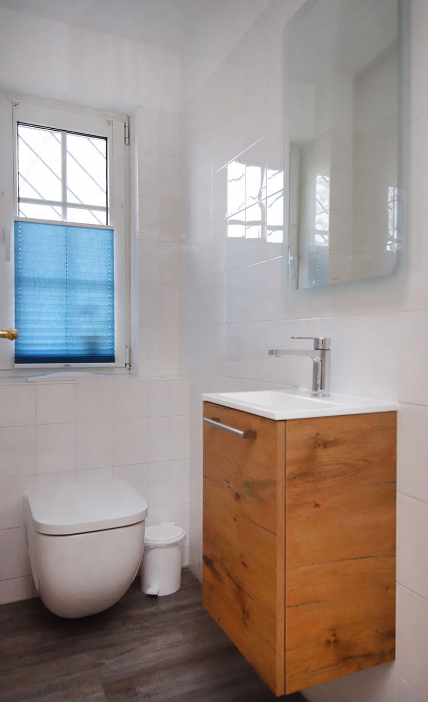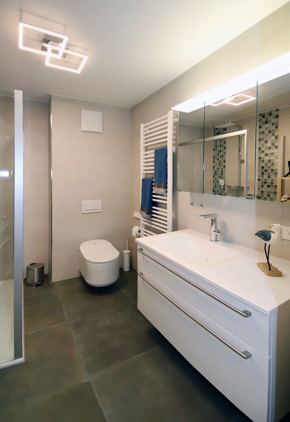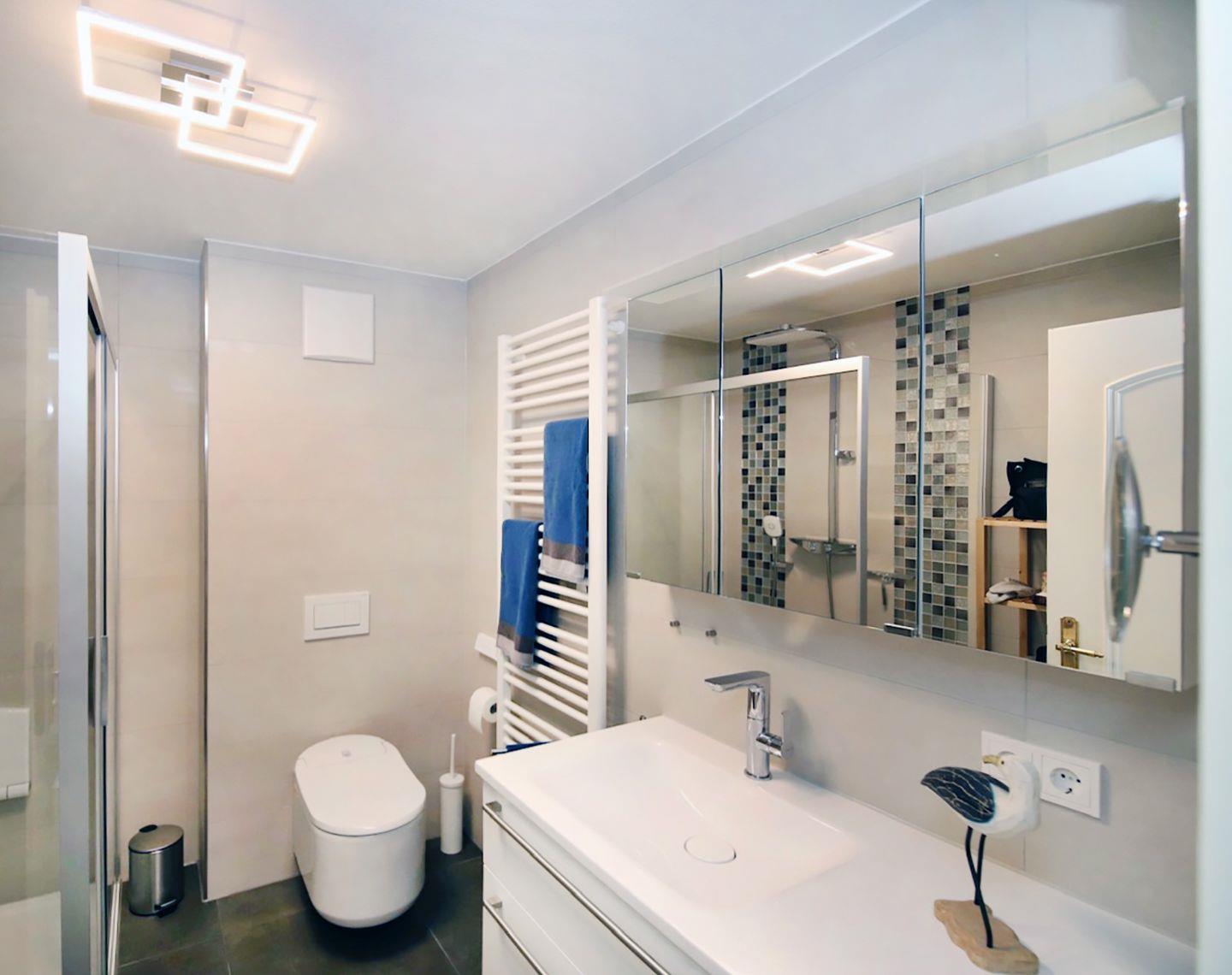 Das Badezimmer verfügt über eine bodengleiche Dusche mit Wandsitz, ein Dusch-WC, einen Kosmetikspiegel und eine Waschmaschine – ideal für längere Aufenthalte. Zusätzlich gibt es ein Gäste-WC.