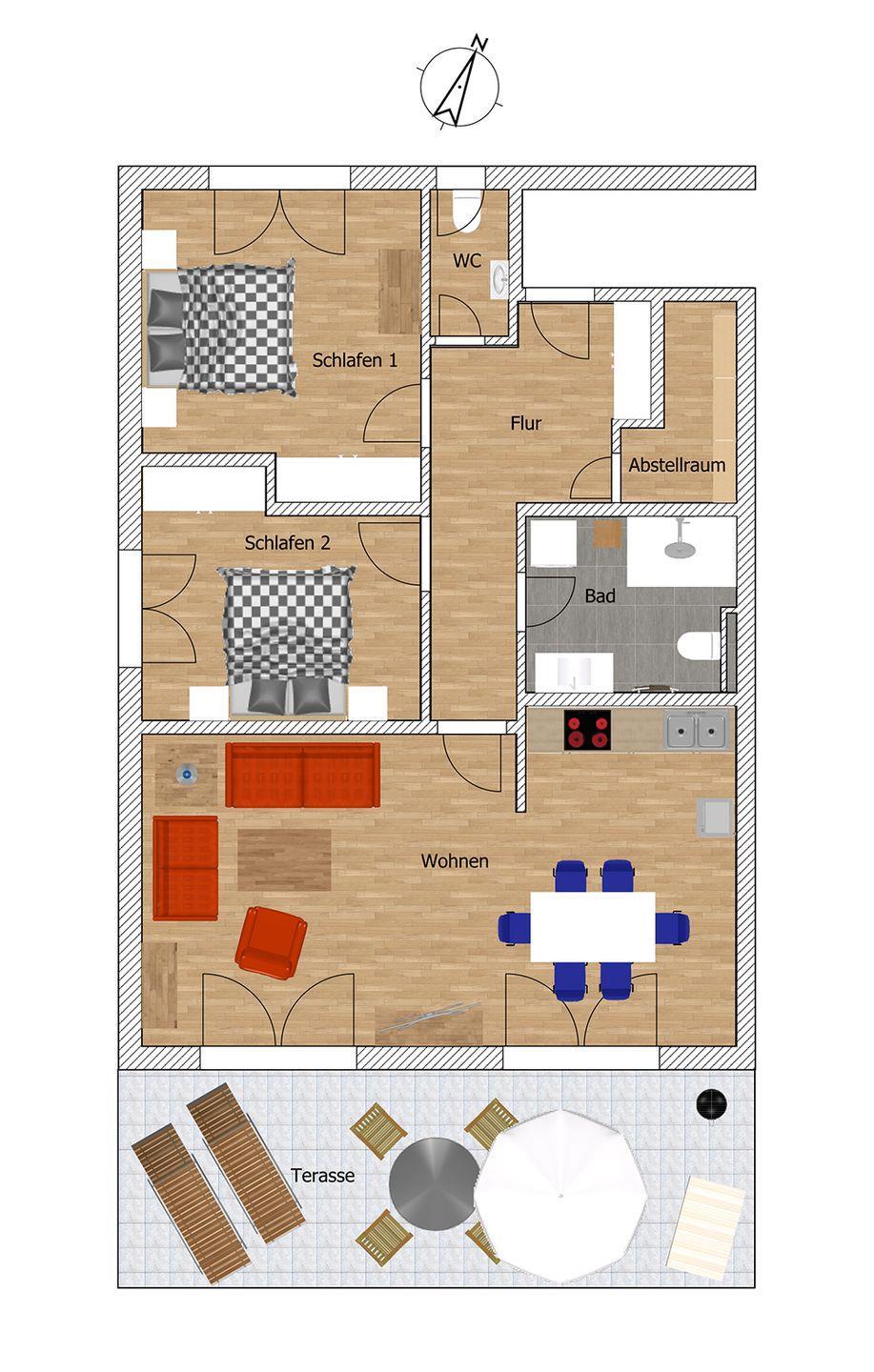 Die Ferienwohnung mit ca. 84 m² Wohnfläche bietet Platz für bis zu 4 Personen und befindet sich im Erdgeschoss eines gepflegten Hauses. Der großzügige Wohnbereich ist mit einem gemütlichen Ecksofa (mit Schlaffunktion) und einem Esstisch ausgestattet. Zur Unterhaltung stehen ein Radio mit CD-Player sowie ein SAT-TV zur Verfügung. Die moderne Küchenzeile lässt keine Wünsche offen: Sie ist mit einem Backofen, Herd, Geschirrspüler, Kühlschrank mit Gefrierfach, Kaffeemaschine, Toaster, Wasserkocher und Mikrowelle bestens ausgestattet. Hier können Sie Ihre Mahlzeiten nach Belieben zubereiten.