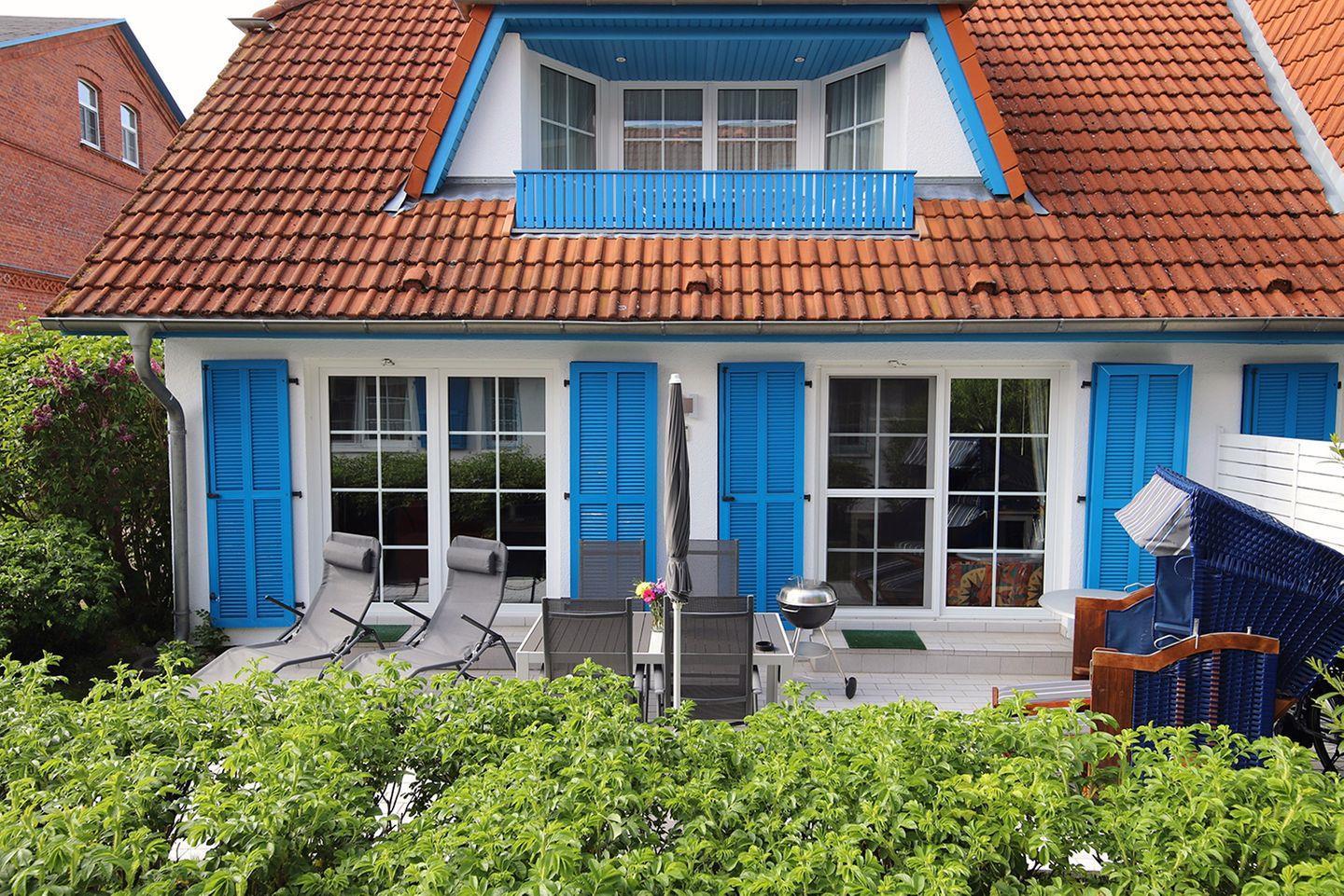 Genießen Sie Ihre Freizeit auf der Süd-Terrasse mit Gartenmöbeln und einem Strandkorb. Ein Kugelgrill lädt zu geselligen Grillabenden ein. Weitere Annehmlichkeiten wie eine Fahrradbox, WLAN und ein Parkplatz unmittelbar vor dem Haus runden das Angebot ab.