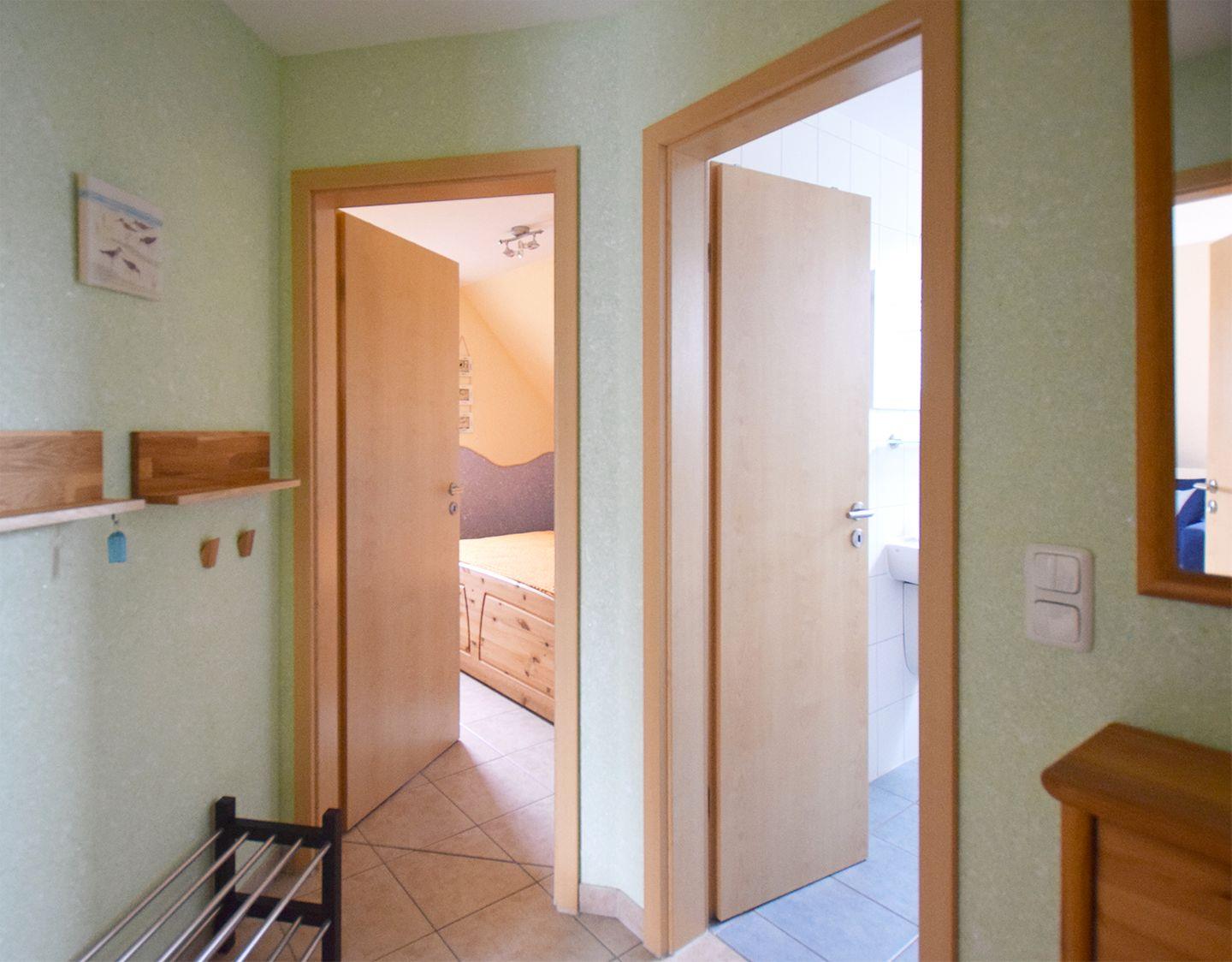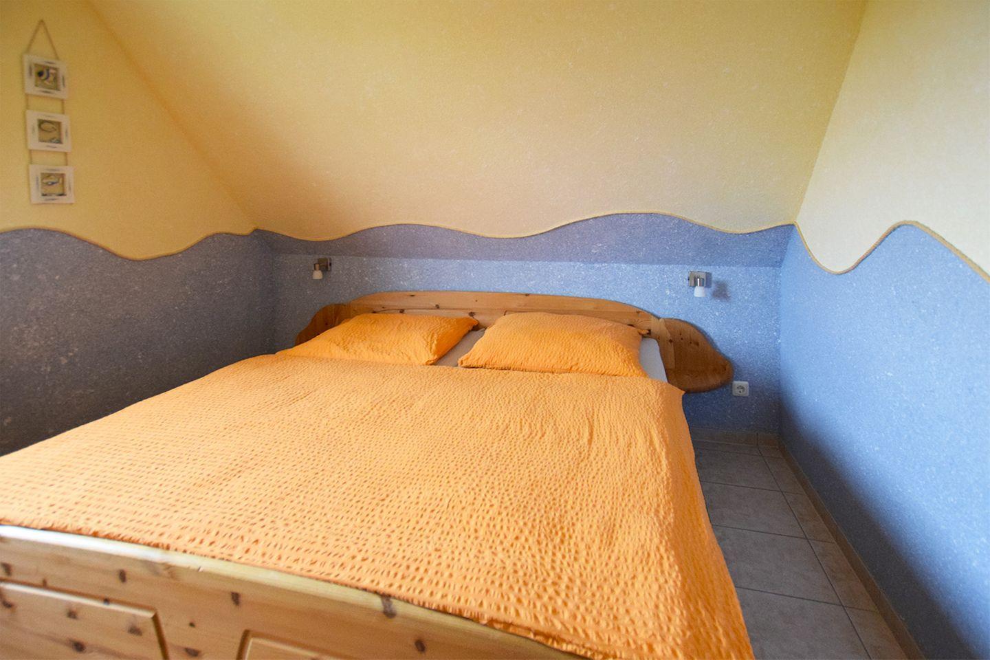 Diese gemütliche Ferienwohnung bietet auf ca. 64 m² Wohnfläche Platz für bis zu 4 Personen. Sie befindet sich im Obergeschoss und verfügt über einen geräumigen Wohnbereich mit Essbereich, einem Flur, einer gut ausgestatteten Küche und einem Bad. Im Obergeschoss finden Sie zudem ein Schlafzimmer mit einem Doppelbett (180 x 200 cm). Im Dachgeschoss befindet sich ein weiteres Schlafzimmer, das mit einem Einzelbett (90 x 200 cm) sowie einem französischen Bett (140 x 200 cm, durchgehende Matratze) ausgestattet ist.