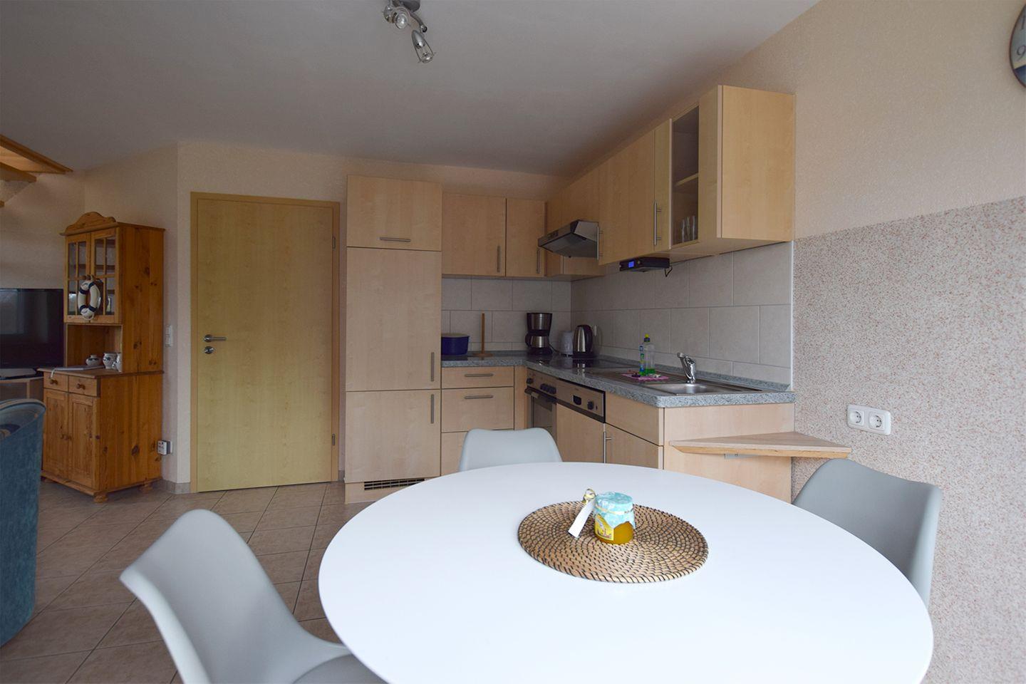 Die moderne Küche ist mit einem Esstisch, einem Backofen, einem Cerankochfeld, einem Geschirrspüler, einer Kaffeemaschine, einem Kühlschrank mit Gefrierfach, Toaster, Wasserkocher und einem Radio ausgestattet. Das Bad verfügt über eine Dusche und WC.