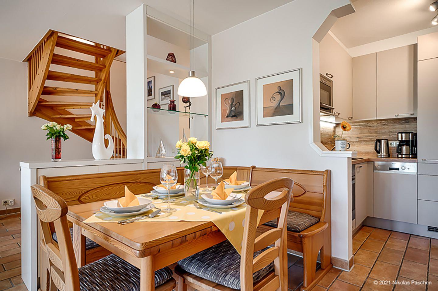 Im Obergeschoss befindet sich das gemütliche Wohnzimmer mit einer Couchgarnitur, einem Sat-TV und einem CD-Player. Direkt angeschlossen ist die gut ausgestattete Einbauküche mit Herd, Backofen, Geschirrspüler, Mikrowelle und Kühlschrank. Der Essbereich mit Esstisch lädt zu gemeinsamen Mahlzeiten ein. Ein Gäste-WC sowie ein Balkon mit Gartenmöbeln runden das Angebot im Obergeschoss ab.