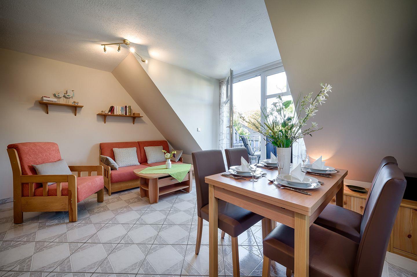 Ferienwohnung im Ortskern von Prerow, geeignet für 4 Personen + Kleinkind (bis 3 Jahre) | ca. 54 m² Wohnfläche | OG und DG | Im OG Wohnbereich mit Sofa, Sessel, Radio und Sat-TV, Essbereich für vier Personen, offene Küche (Kühlschrank m. Gefrierfach, Cerankochfeld, Backofen, Geschirrspüler, Kaffeemaschine, Toaster, Wasserkocher, Mikrowelle), ein Schlafzimmer mit Doppelbett (180 x 200 cm), Duschbad mit WC und Waschbecken, im DG 1 Schlafzimmer mit Doppelbett (180 x 200 cm), Fliegenschutzgitter, Fahrradschuppen, ein PKW-Stellplatz, möblierter Nord-West-Balkon, separate Sauna zur gemeinschaftlichen Nutzung im Haus (Wertmarken; 10 € für ca. 3 Stunden), Bettwäsche kann für 12 € und Handtücher für 8 € pro Person gemietet werden, Nichtraucherwohnung, Haustiere sind nicht gestattet, kostenfreier Internetzugang über HOTSPLOTS, gemeinschaftlicher Grillplatz im Garten