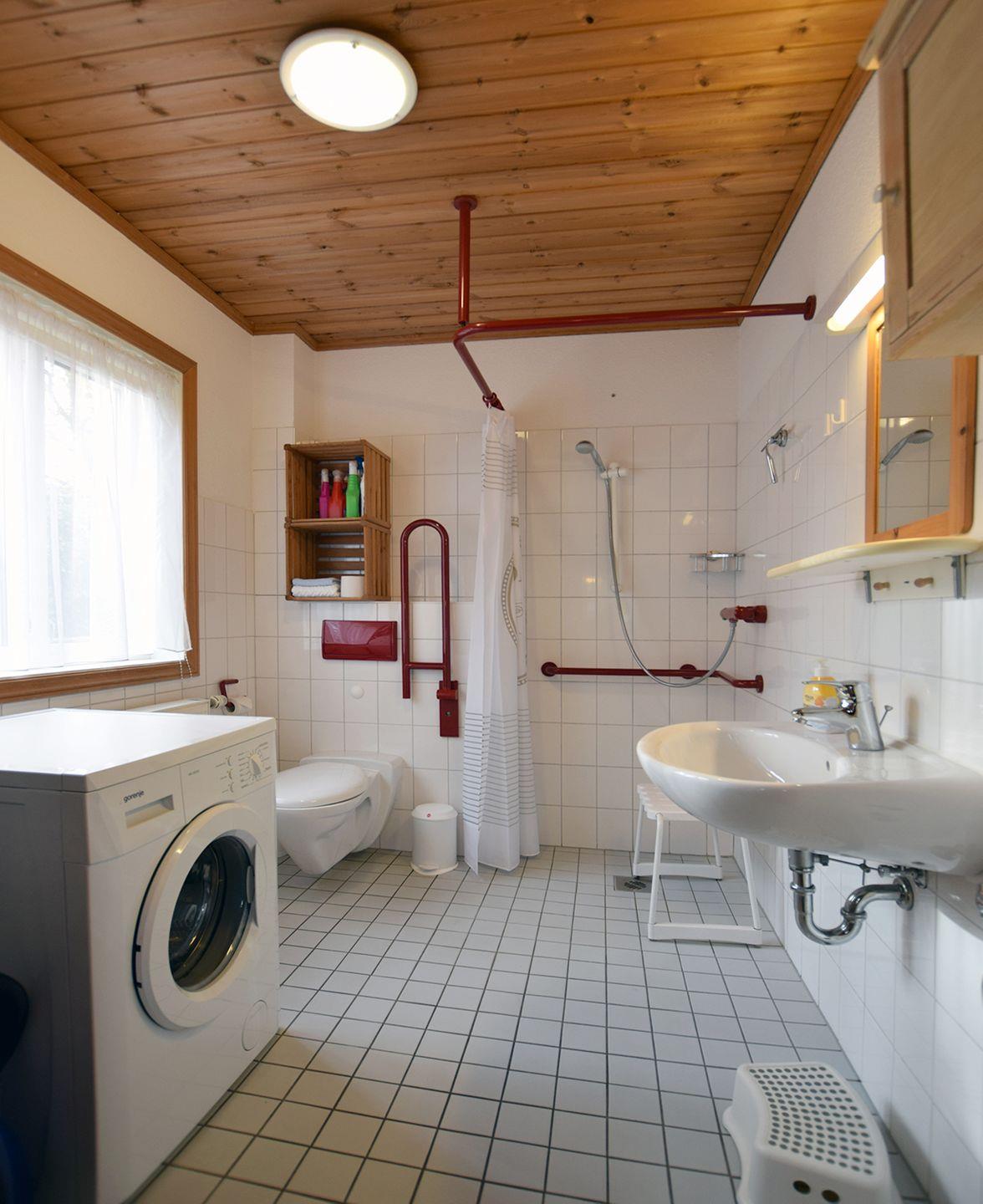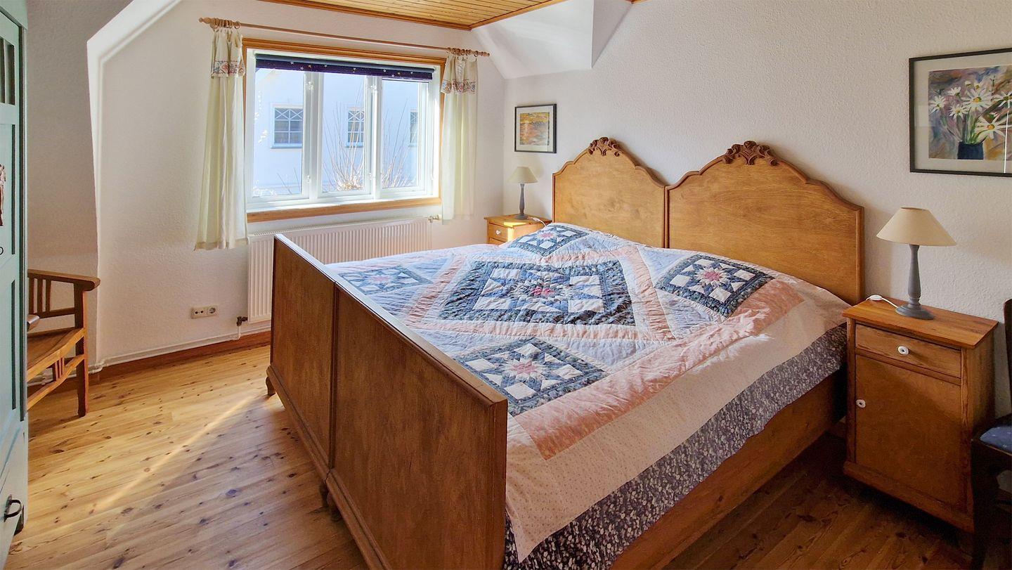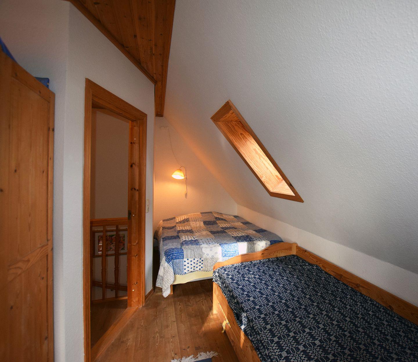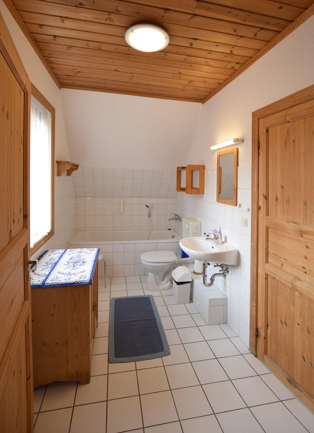Im Obergeschoss befinden sich zwei Schlafzimmer und ein weiteres Bad. Das erste Schlafzimmer ist mit einem Doppelbett (180 x 200 cm) ausgestattet, das zweite Schlafzimmer bietet ein Doppelbett (140 x 200 cm) sowie ein Einzelbett (90 x 200 cm) und ein Kinderbett. Für die jüngsten Gäste gibt es außerdem einen Hochstuhl sowie ein Treppenschutzgitter. Das Badezimmer im OG ist mit einer Badewanne und WC ausgestattet.