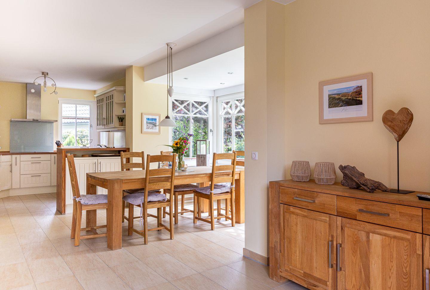 Das familienfreundliche Ferienhaus begeistert mit einem großzügigen Wohn- und Küchenbereich, der zum Entspannen und Zusammensein einlädt. Die offen gestaltete Landhausküche ist bestens ausgestattet und ideal für’s gemeinsame Kochen. Abgerundet wird das Erdgeschoss mit einem Gäste-Bad. Im Obergeschoss befinden sich zwei gemütliche Schlafzimmer, die jeweils mit Verdunklungsvorhängen, Kleiderschrank und TV ausgestattet sind. Besonders hervorzuheben ist das große Spa-Bad mit Badewanne und Erlebnisdusche – perfekt für wohltuende Wellnessmomente.
