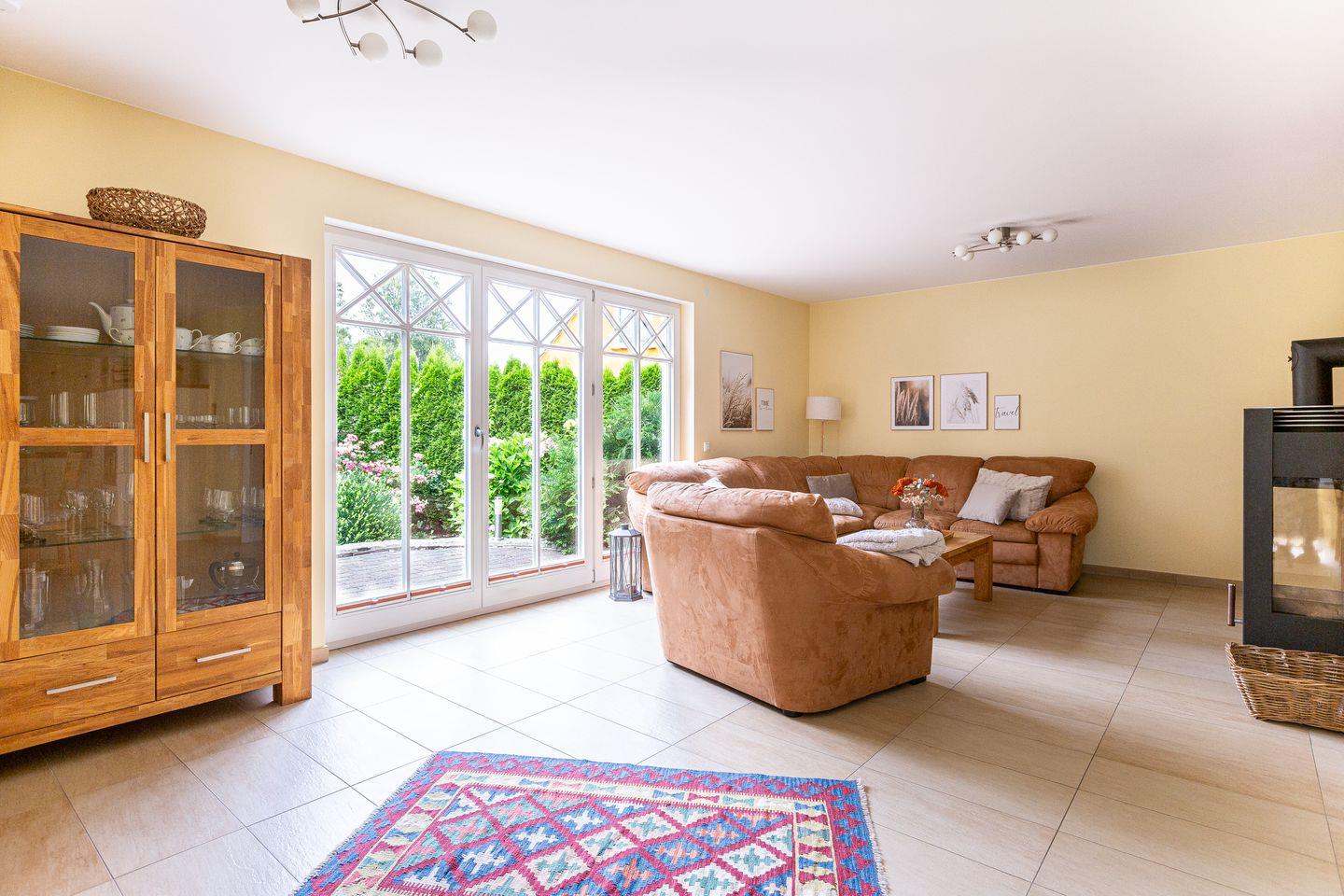 Viel Platz zum Entfalten bietet auch der herrliche Außenbereich mit seiner großen Steinterrasse und dem schön angelegten Garten samt Grillmöglichkeit. Zum Ferienhaus gehören ein Carport und eine zusätzliche Parkmöglichkeit.