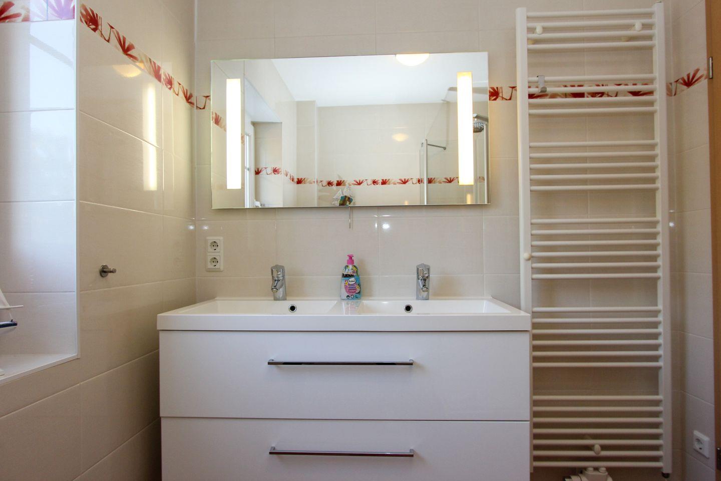 Die Wohnung verfügt über ein einladendes Schlafzimmer mit einem komfortablen Doppelbett und einem praktischen Kleiderschrank, der ausreichend Stauraum für Ihre persönlichen Dinge bietet. Das moderne Duschbad mit Doppelwaschbecken und Tageslicht sorgt für ein angenehmes Ambiente und viel Platz für alle.