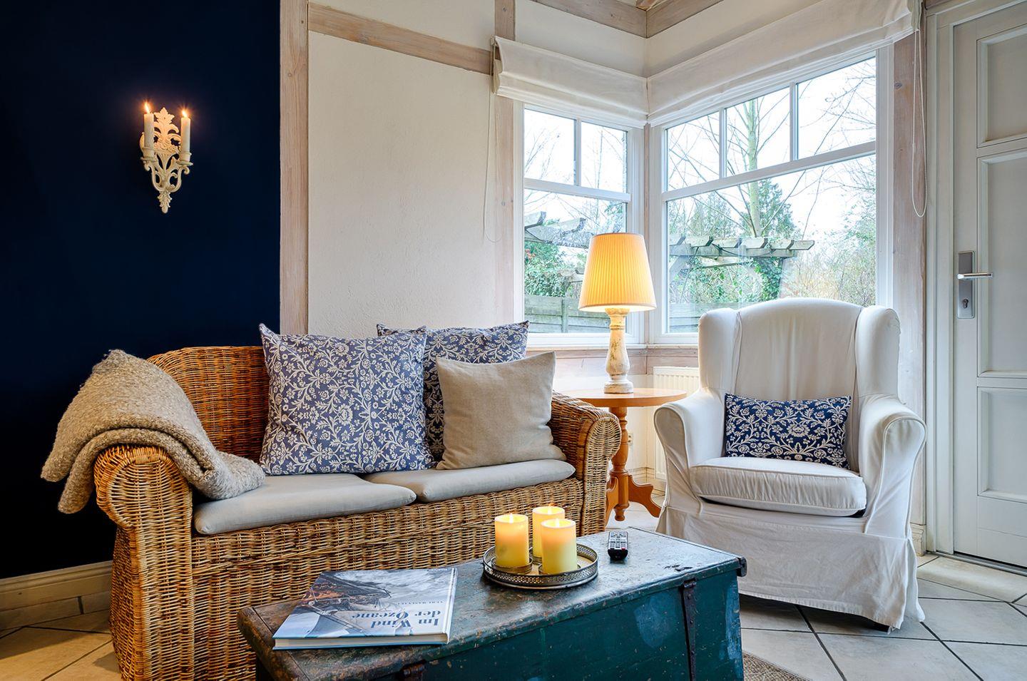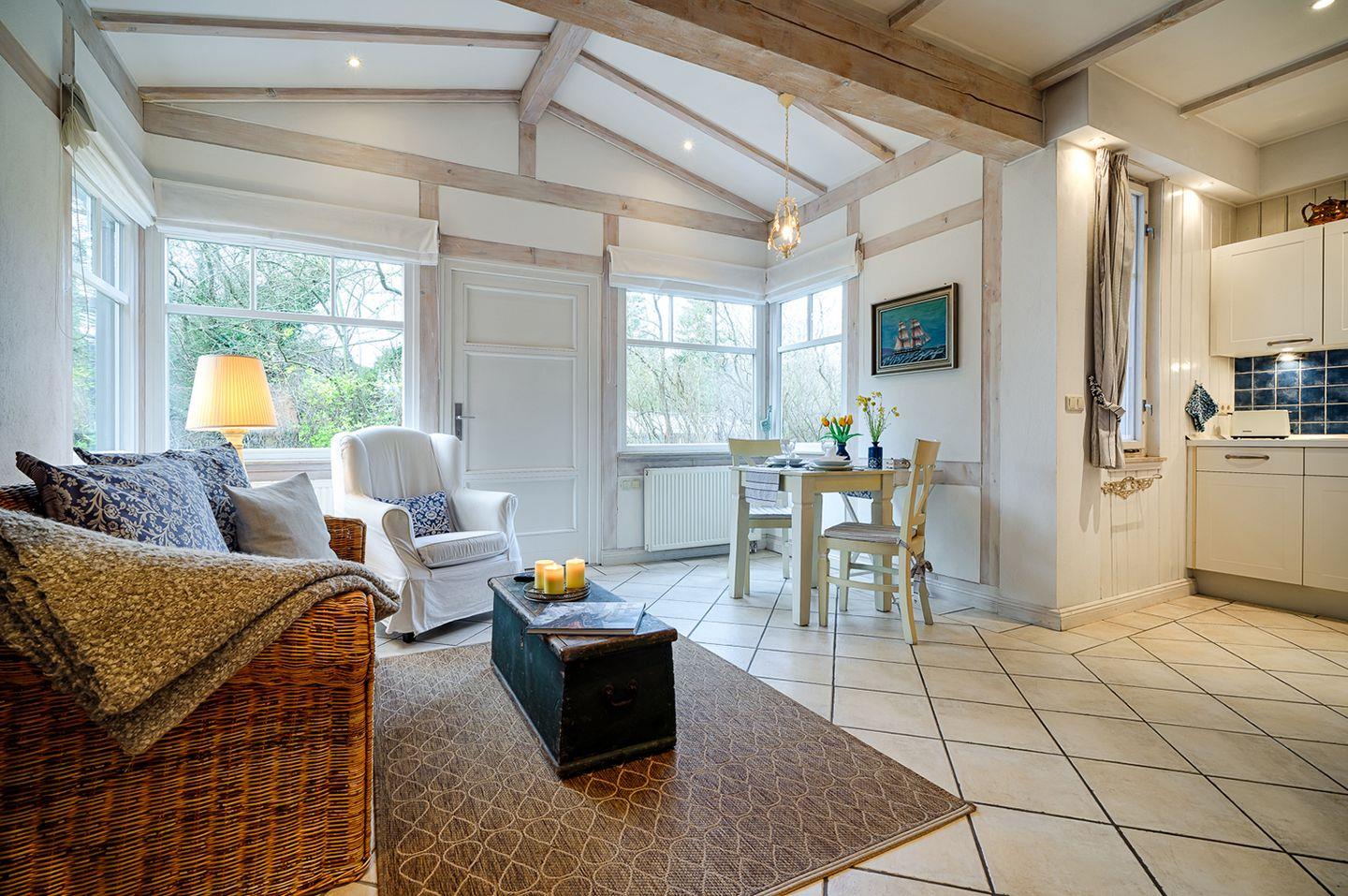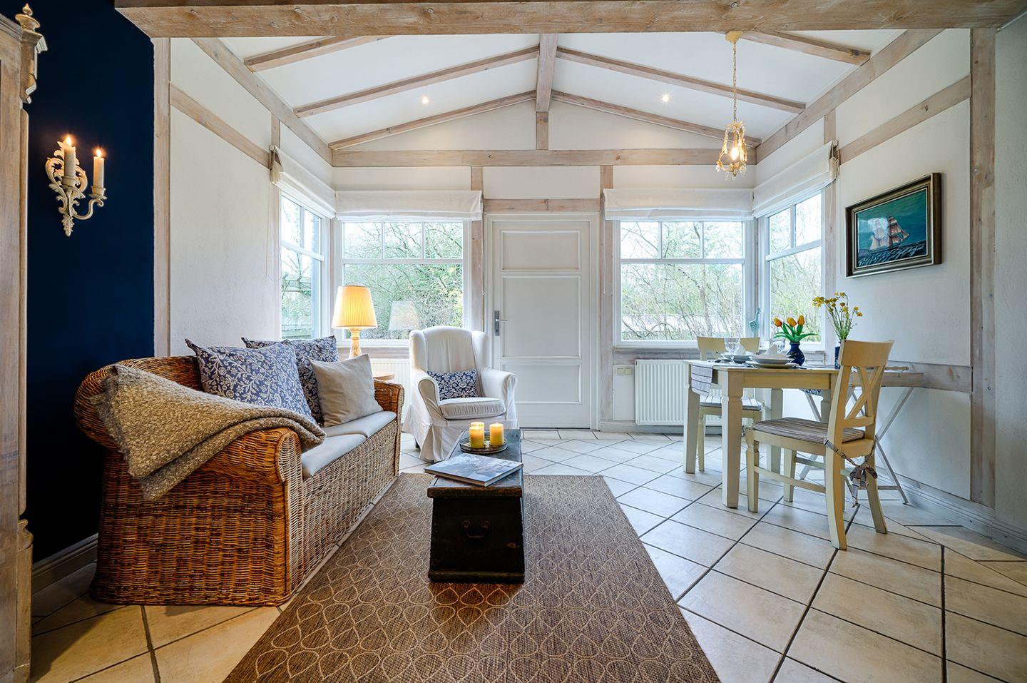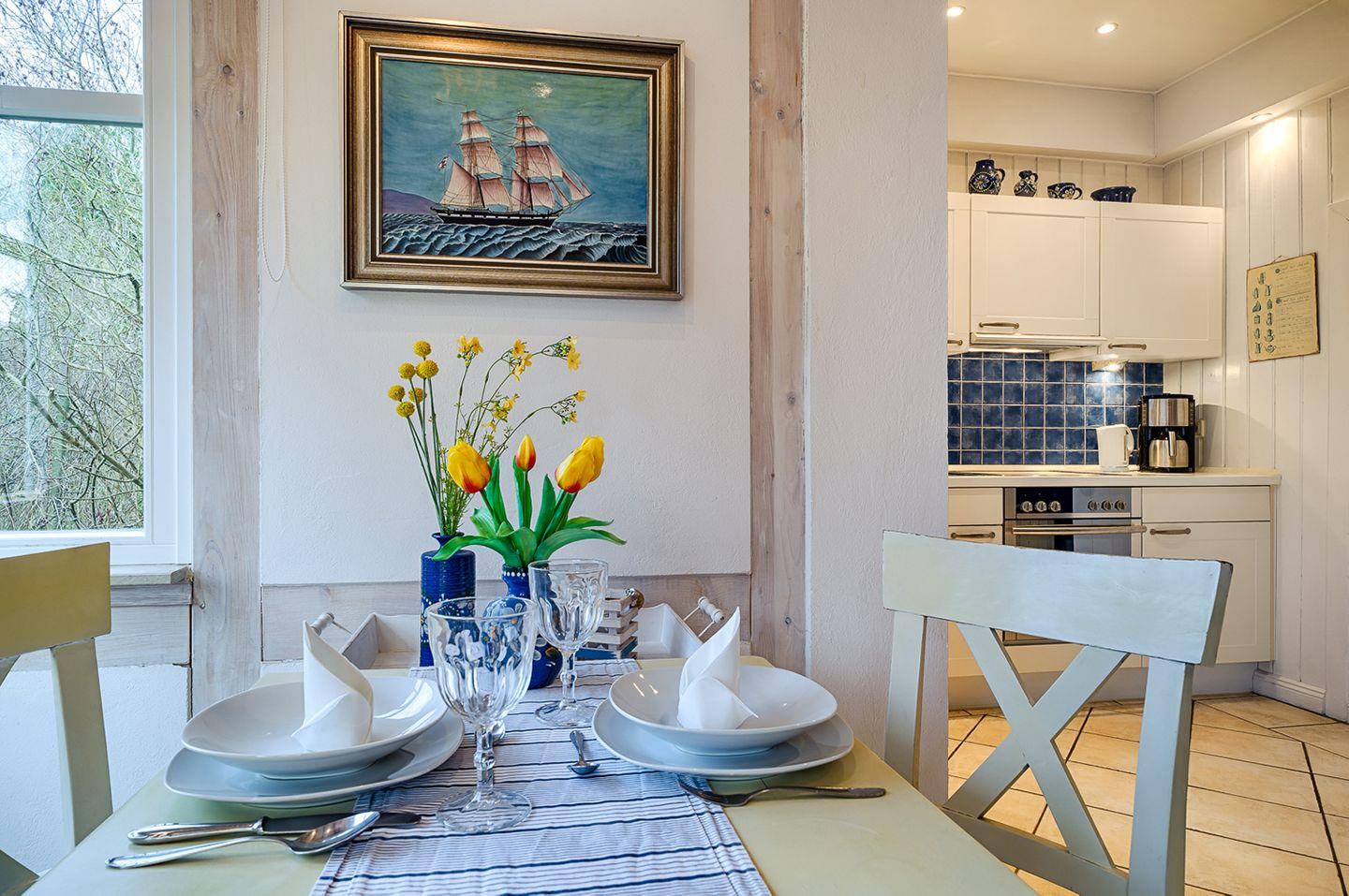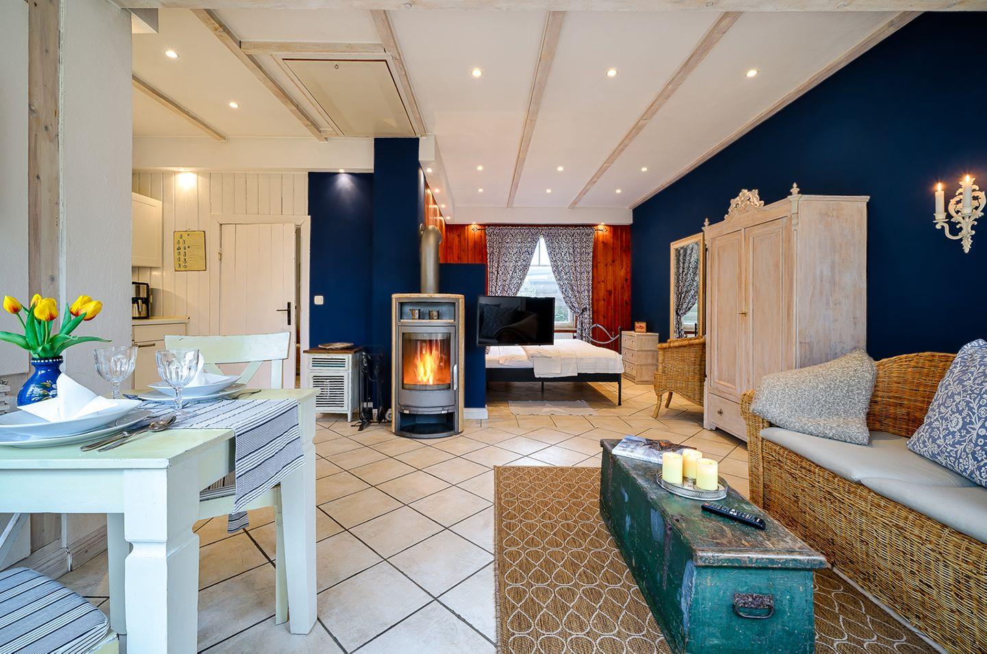 Apartment bis 2 Personen | keine Haustiere | ca. 38 m² Wohnfläche | EG Wohn-/Ess-/Schlafbereich, integrierte Küche, Bad | Terrasse mit Strandkorb, Gartenmöbeln und Sonnenschirm | 1 Parkplatz | Wohn-/Essbereich Esstisch, Sofa mit Sessel, SAT-TV, Kaminofen | Küche Backofen, Geschirrspüler, E-Herd (Cerankochfelder), Kaffeemaschine, Kühlschrank mit Gefrierfach, Toaster, Wasserkocher | Bad mit Dusche, WC | Schlafbereich 1 Doppelbett (180 x 200 cm) | Fahrradschuppen, WLAN kostenfrei | Bettwäsche und Handtücher inklusive