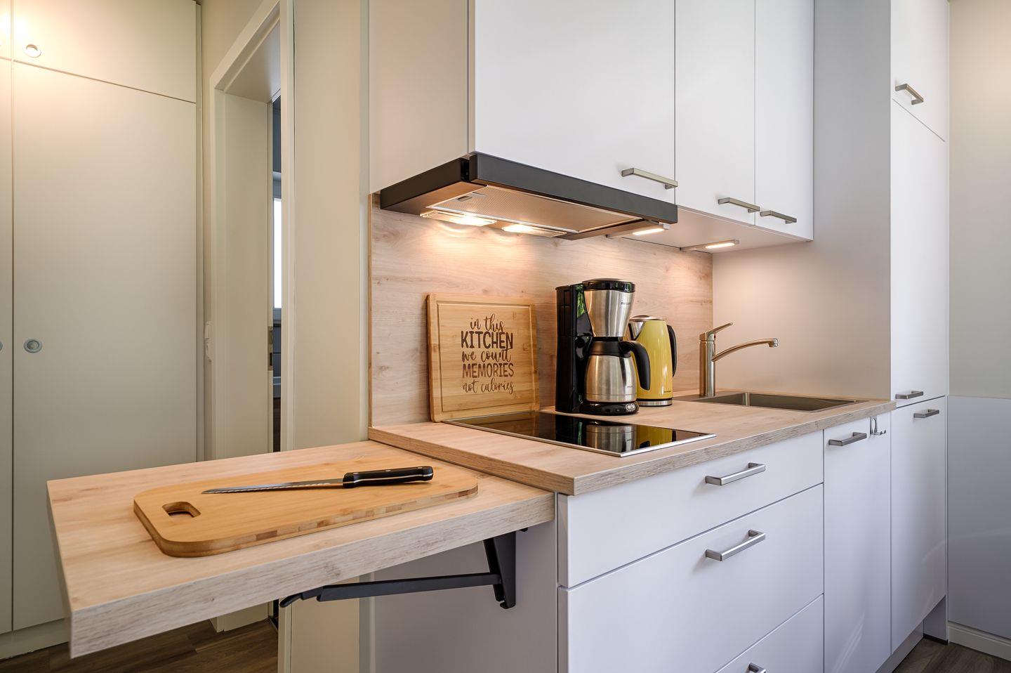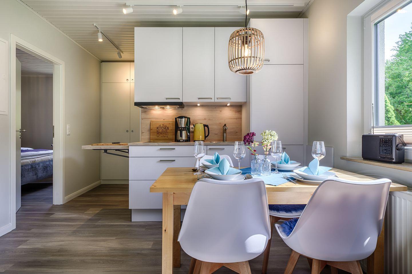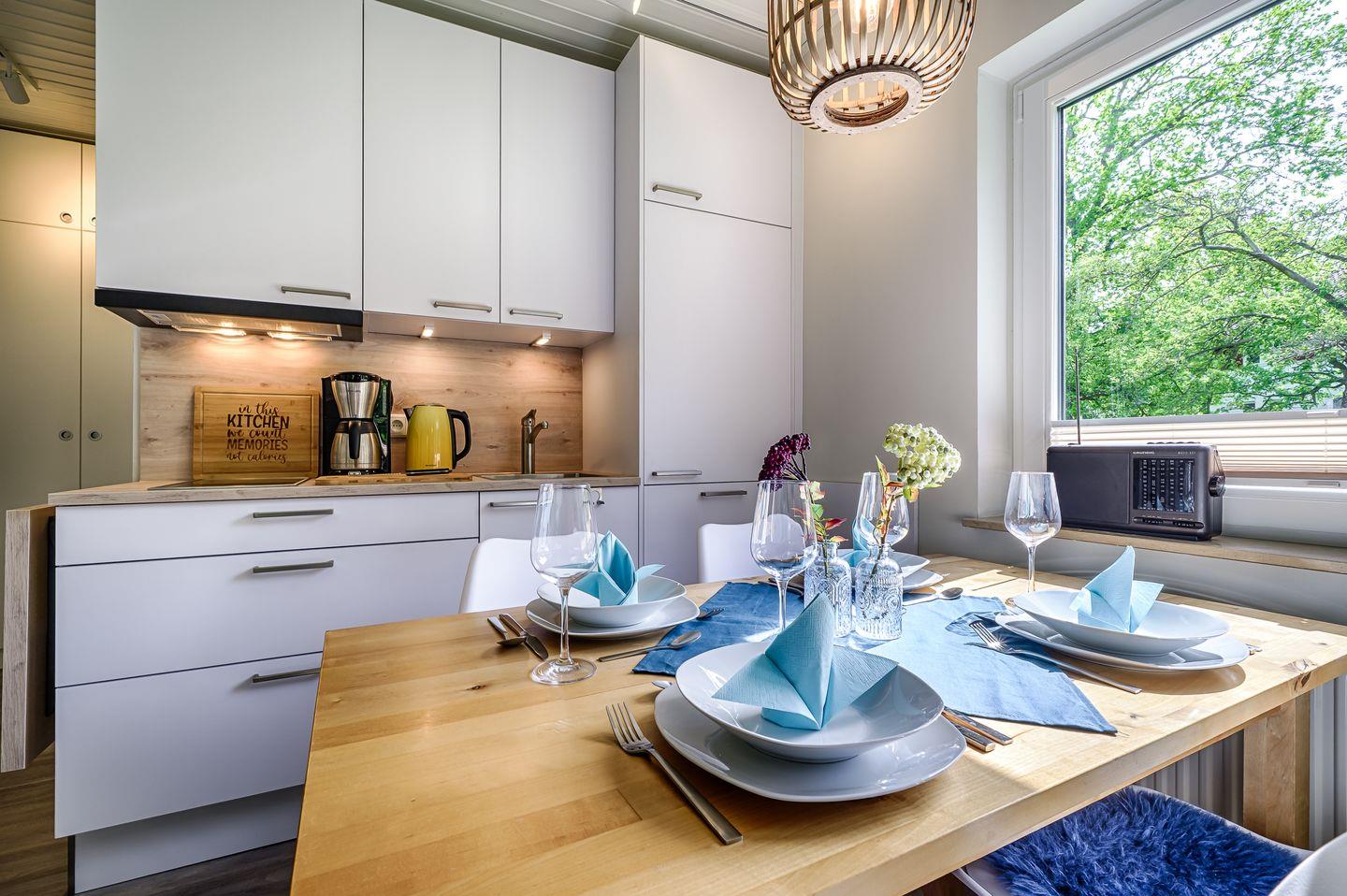 offene Einbauküche mit 2 Platten Induktionsherd und Esstisch für 4 Personen