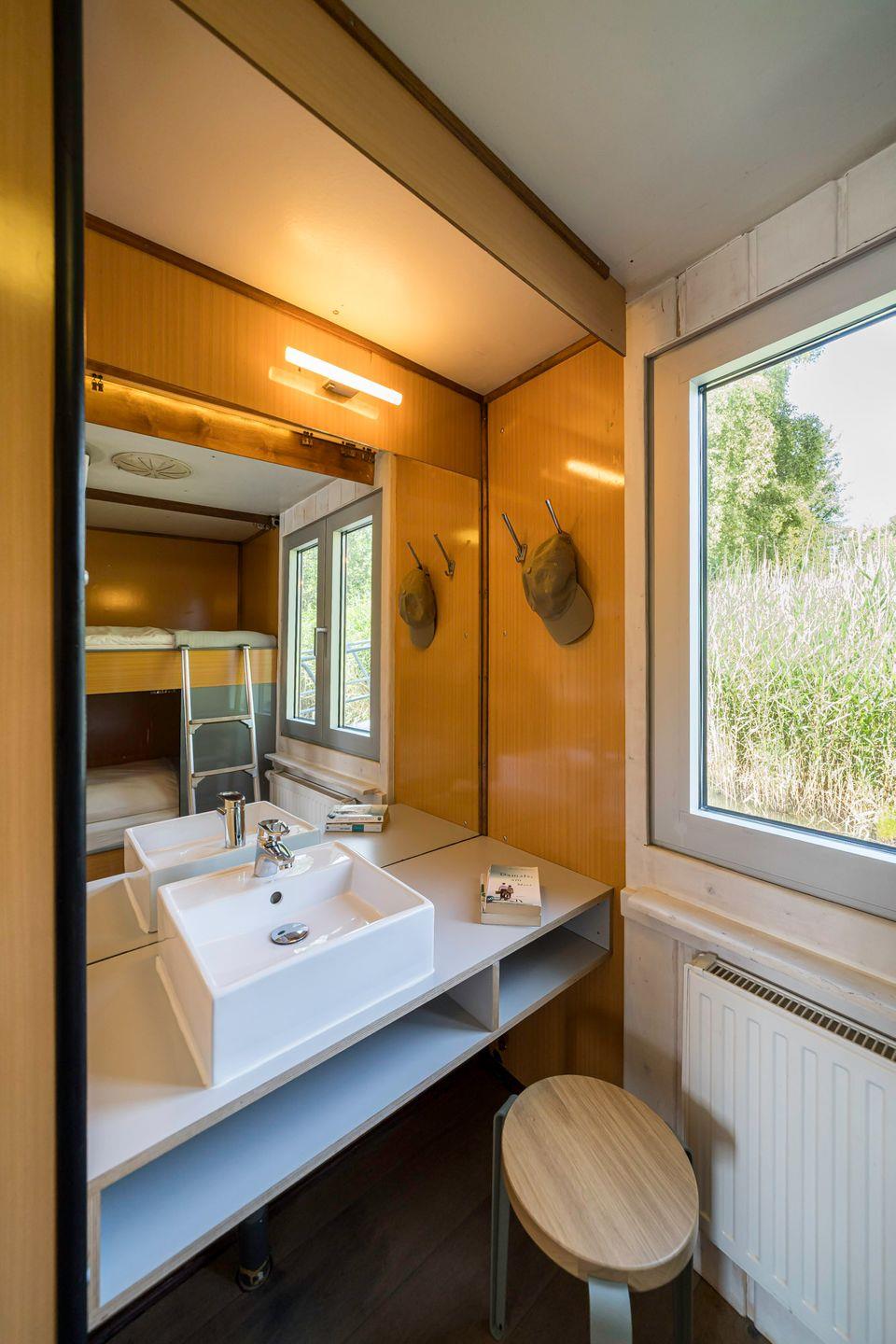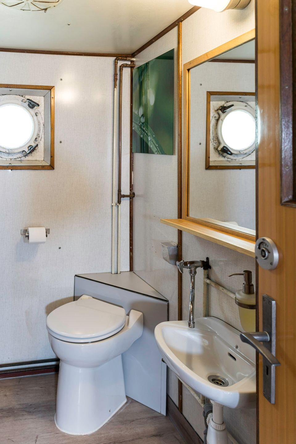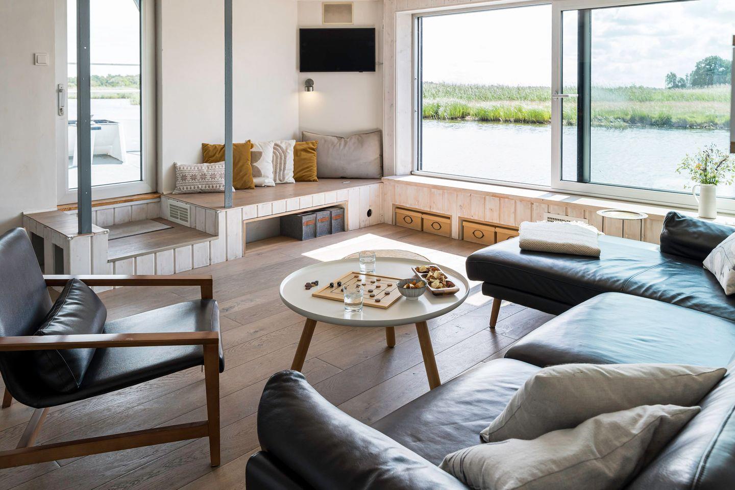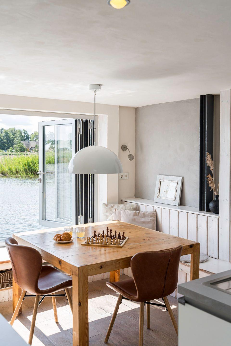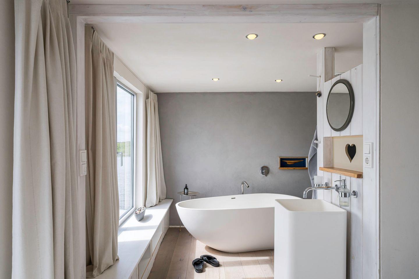 Im Inneren erwartet Sie eine großzügige, lichtdurchflutete Wohnküche mit gemütlichem Essbereich – ideal für gemeinsame Stunden mit Familie oder Freunden. Zwei Schlafzimmer mit komfortablen Doppelbetten bieten viel Platz und Ruhe. Eines dieser Zimmer verfügt über eine freistehende Badewanne mit Blick aufs Wasser sowie ein eigenes WC – ein außergewöhnliches Detail, das den Charakter dieser Unterkunft unterstreicht. Zwei weitere Kabinen mit jeweils zwei Etagenbetten schaffen zusätzliche Schlafplätze und eignen sich besonders für Kinder oder befreundete Paare. Insgesamt stehen drei weitere Badezimmer mit Dusche sowie insgesamt vier WCs zur Verfügung, sodass auch bei voller Belegung mit bis zu acht Gästen ein hoher Wohnkomfort gewährleistet ist. Von allen Räumen eröffnet sich der Blick auf das Wasser und die naturbelassene Umgebung des Prerow Stroms.