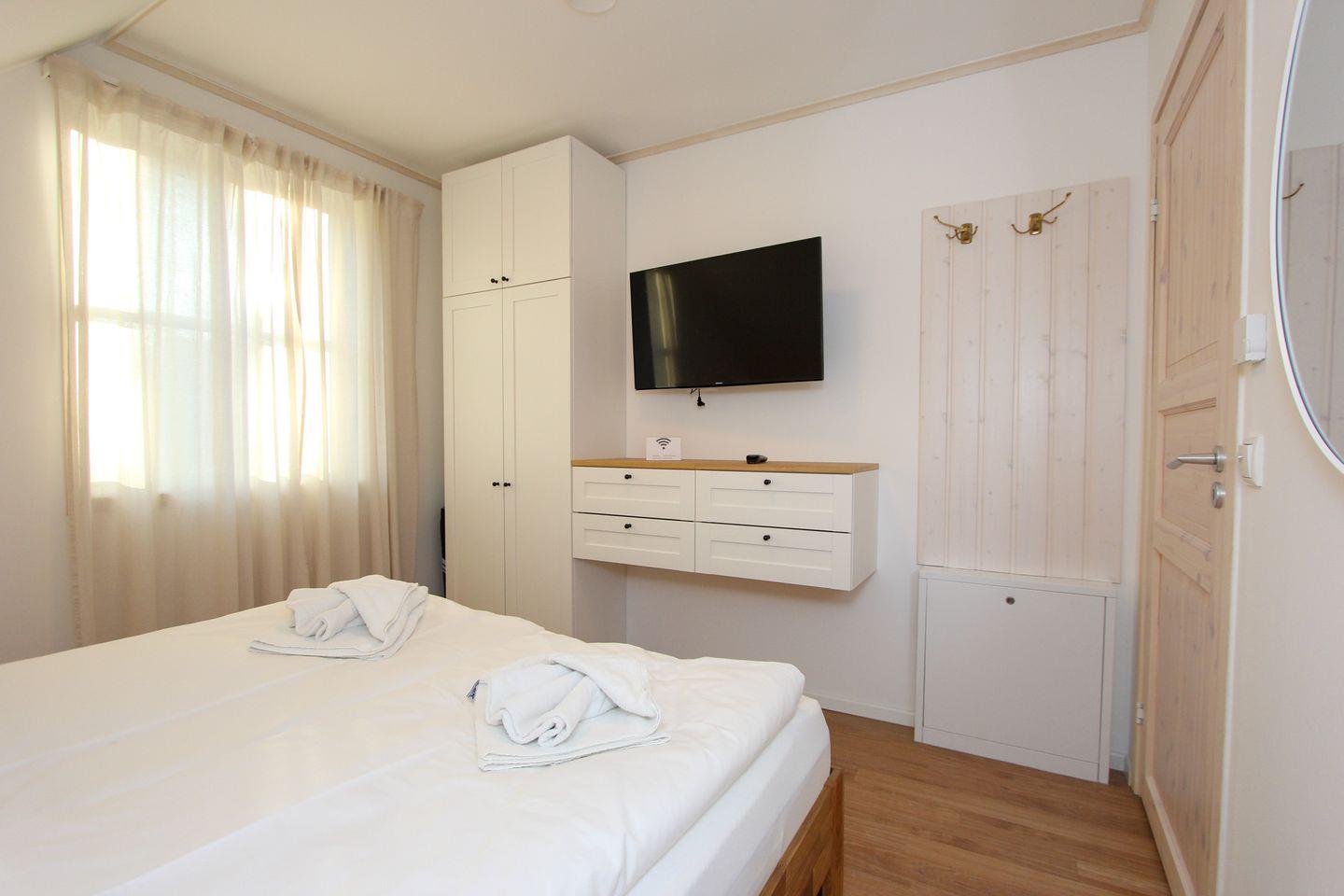 Der Wohnbereich lädt mit einem Kaminofen, Sessel und einem Sofa zur Entspannung ein. Für Unterhaltung sorgen zwei Fernseher und kostenloses WLAN. Bücher stehen ebenso zur Verfügung und bieten Abwechslung für ruhige Momente.