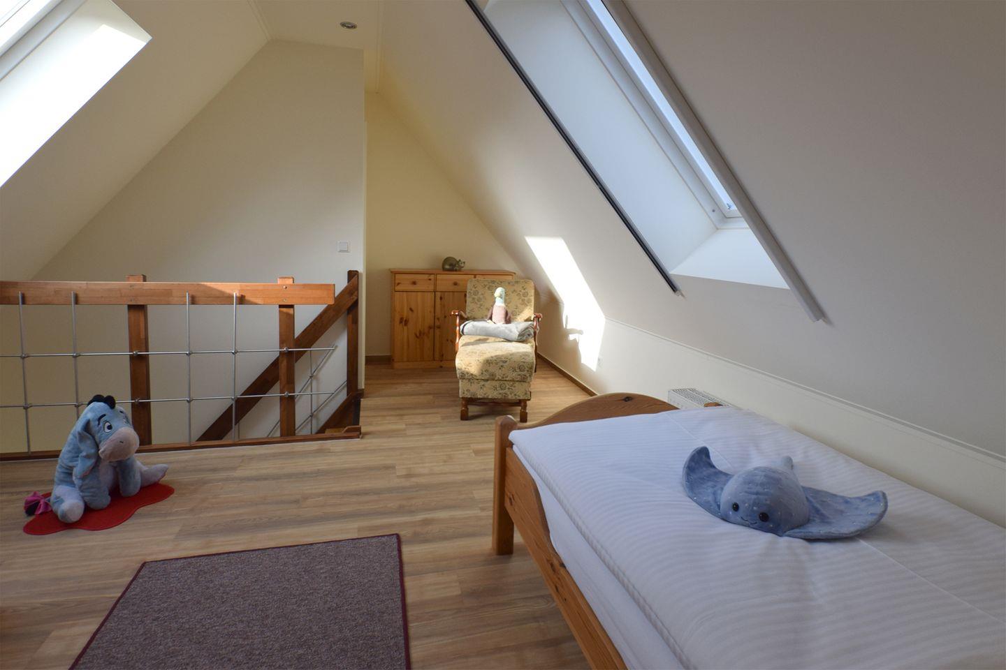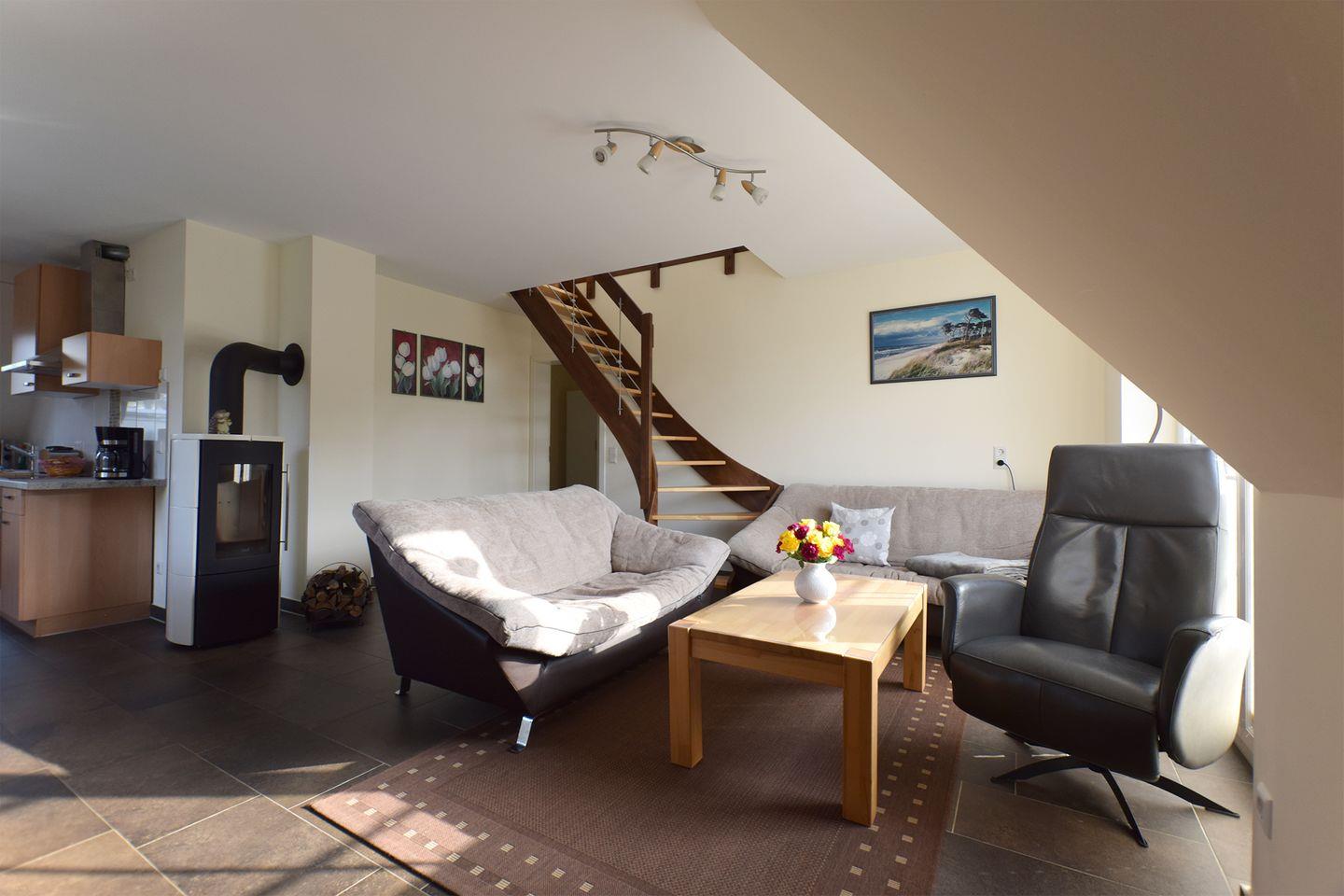 Die modern ausgestattete Ferienwohnung ist ideal auf die Bedürfnisse von Familien und Paaren zugeschnitten. Sie verfügt über zwei Schlafzimmer, wovon sich eines im Obergeschoss befindet und das zweite in der offenen Galerie im Dachgeschoss. Das große, lichtdurchflutete Wohnzimmer schließt eine einladende Sofaecke und einen gemütlichen Sessel ein. Ein Flachbildfernseher mit Satellitenanschluss sowie kostenfreies WLAN sorgen für mediale Unterhaltung und flexible Kommunikation.