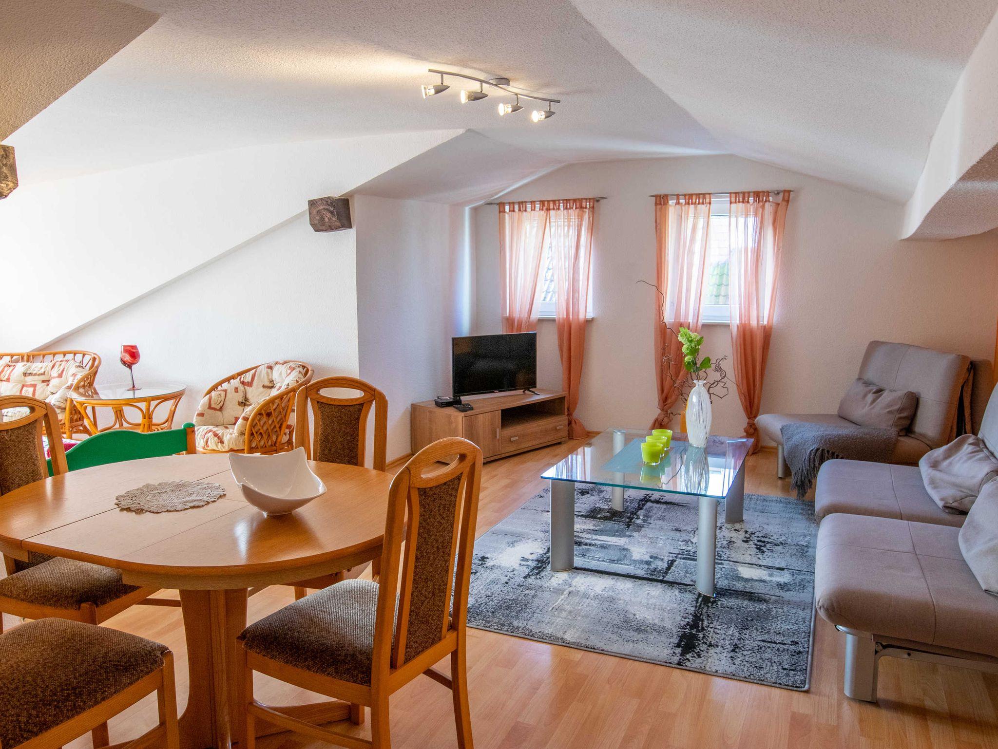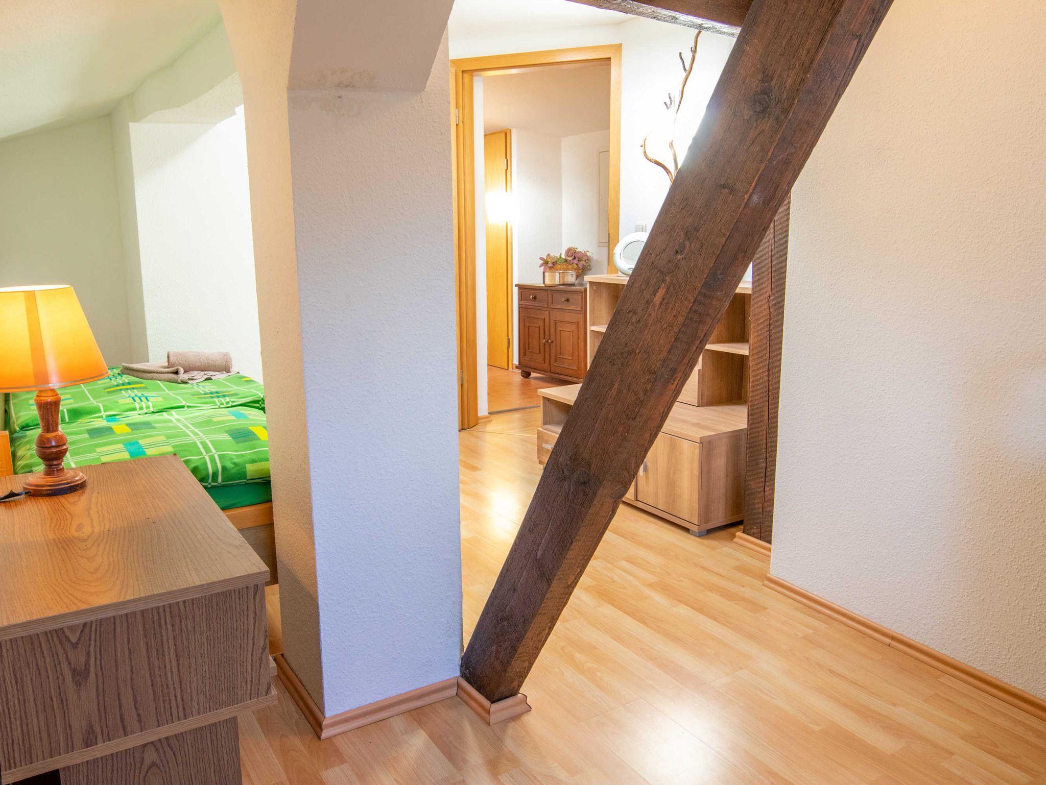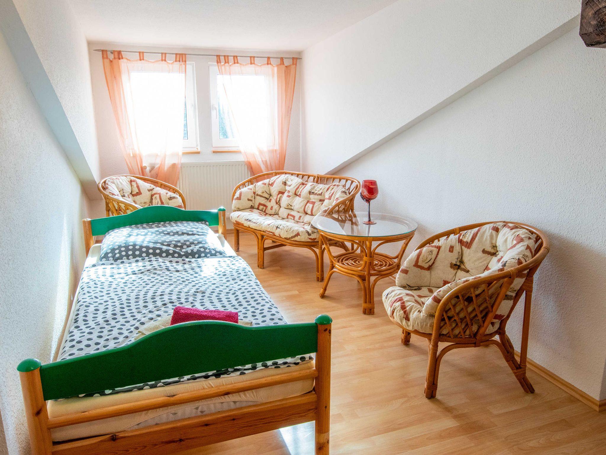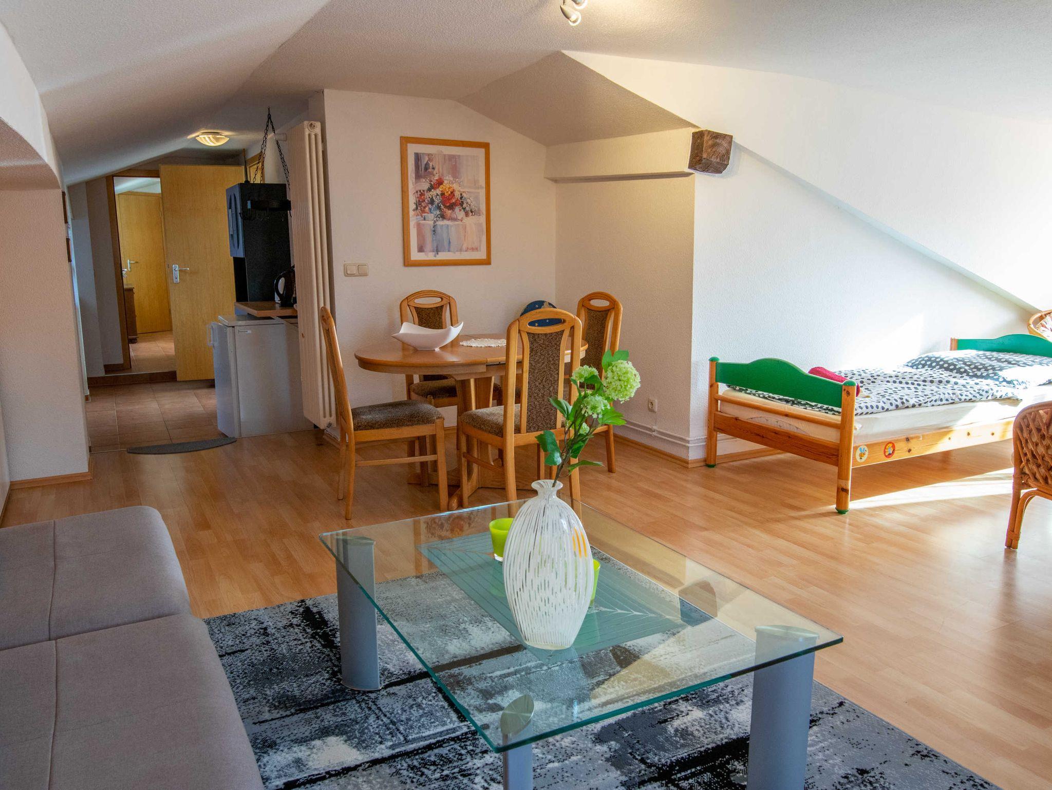 Die 65m² große 3-Raumwohnung für bis zu 5 Personen befindet sich im Dachgeschoss der Pension und ist über 2 Treppen zu erreichen.