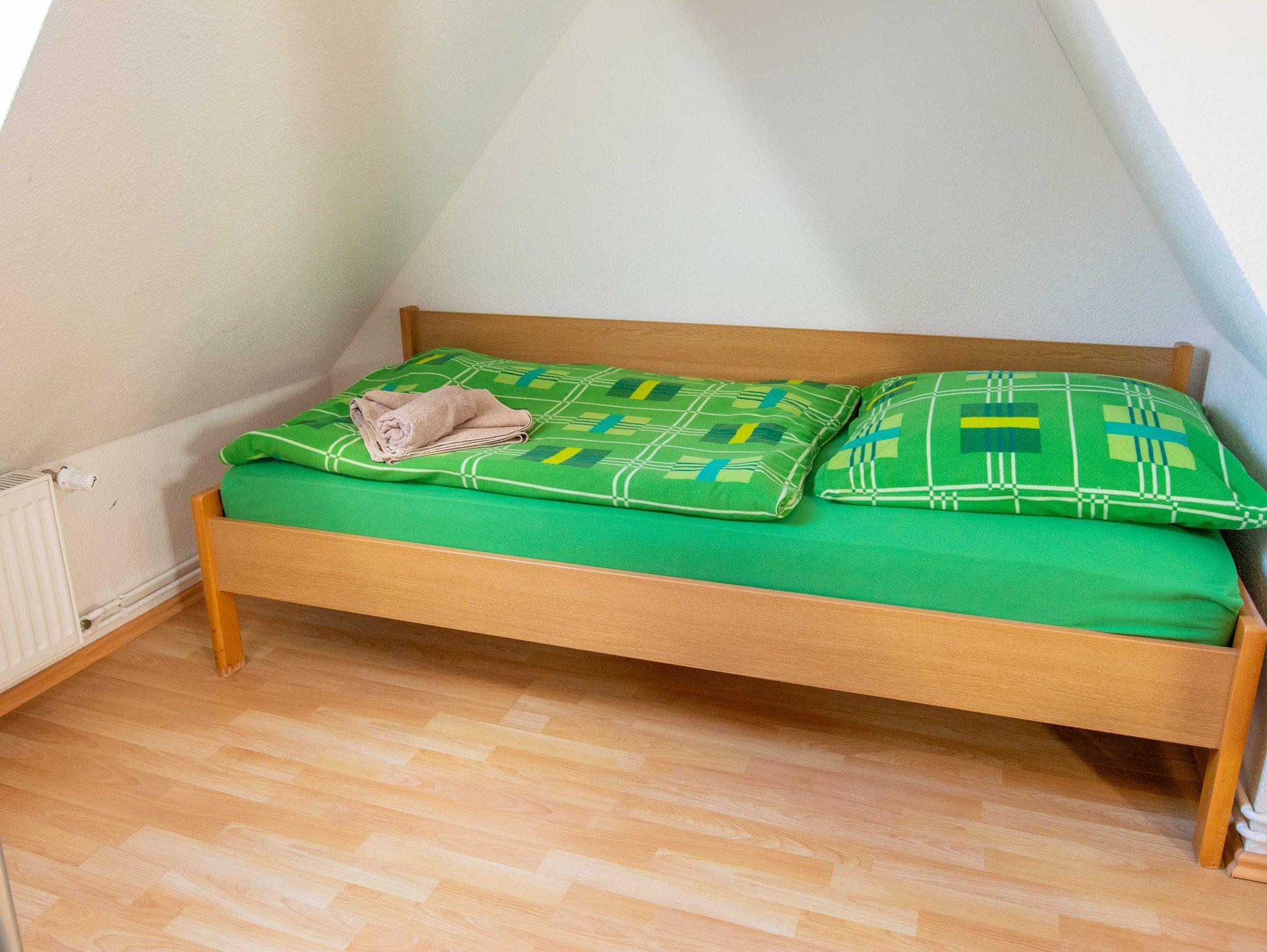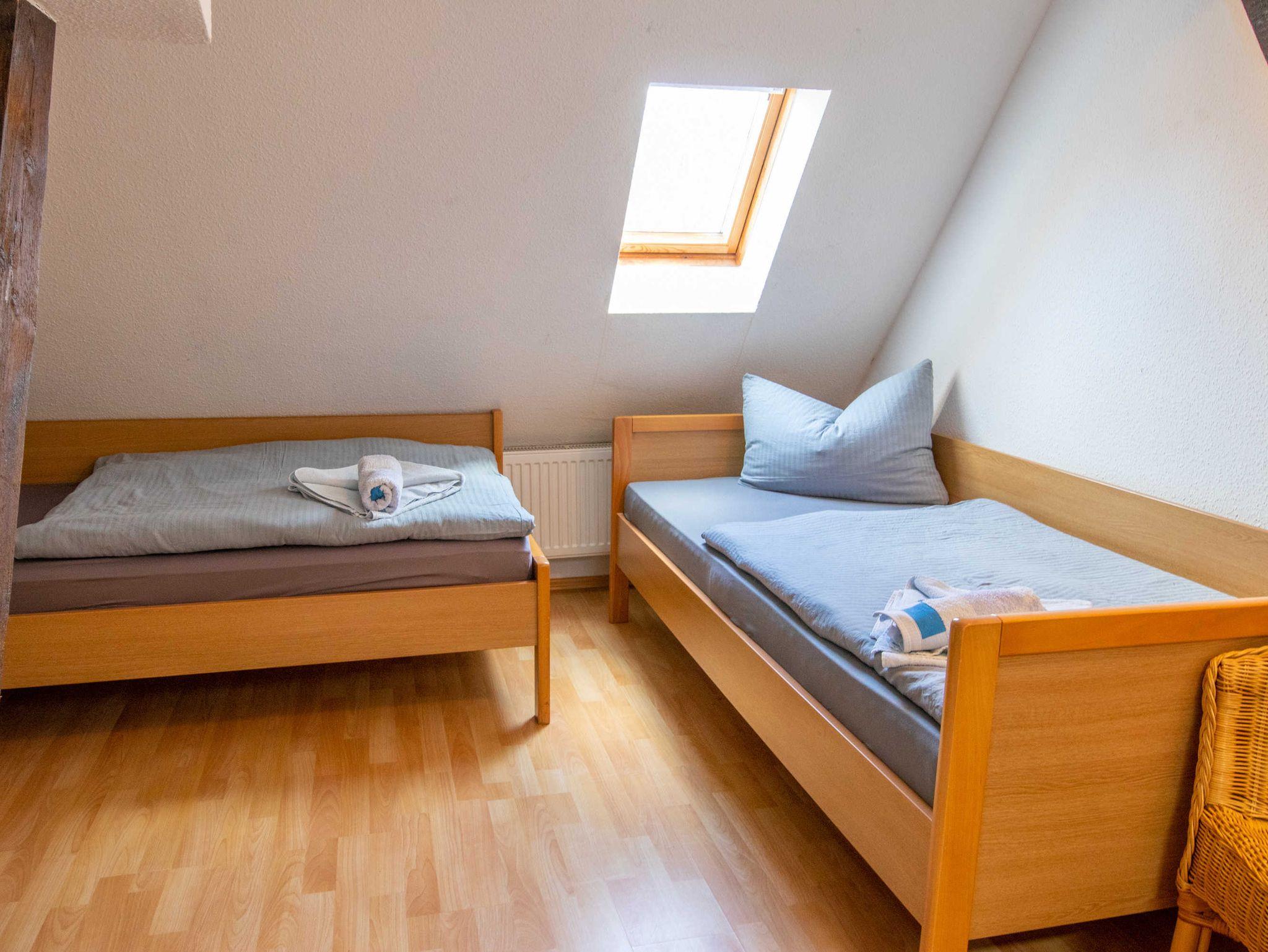 Die Ferienwohnung ist gemütlich eingerichtet - Laminatfußboden und helle, freundliche Farben und Dachschrägen charakterisieren diese Ferienwohnung. Im Wohnzimmer mit offener, voll ausgestattetter Küche und Essbereich, stehen drei Schlafsessel und ein Flachbild-TV, sowie eine weitere Schlafmöglichkeit (Einzelbett, 90x200) zur Verfügung. Vom Flur aus sind die beiden Schlafzimmer mit jeweils zwei Einzelbetten (90x200) zugänglich. Weiterhin gibt es ein kleines helles Bad mit Dusche und WC.