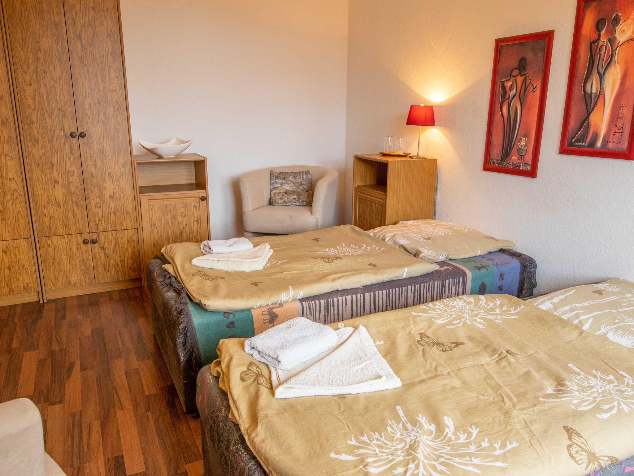 Das Doppelzimmer ist eingerichtet mit 2 Einzelbetten (90x200), außer in Zimmer 19, dort befindet sich ein Doppelbett (180x200), einem TV (teilweise Flachbild-TV), einer Sitzgelegenheit, Kleiderschrank, einem Bad mit Fenster, Dusche und WC sowie einem kleinen Vorflur.