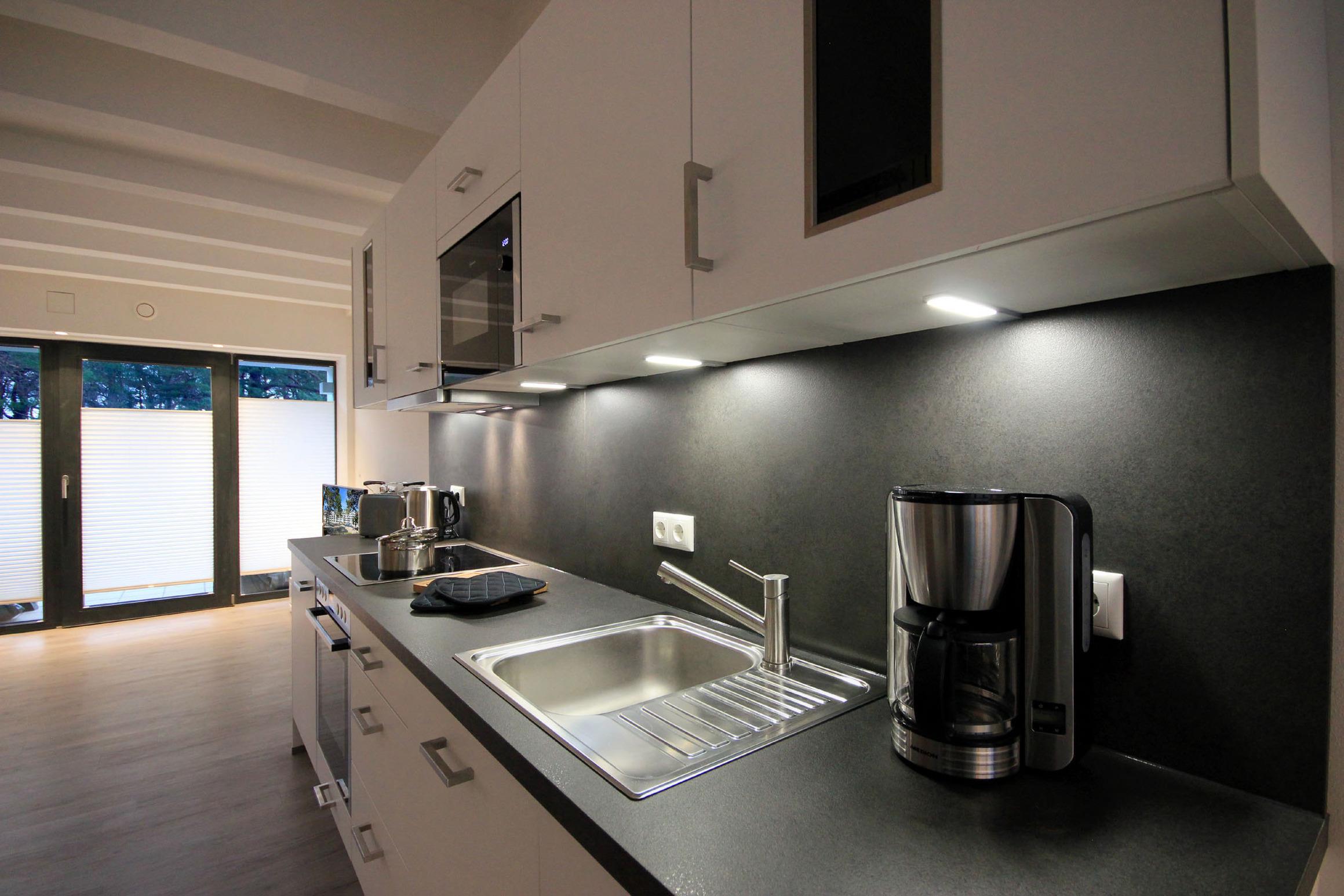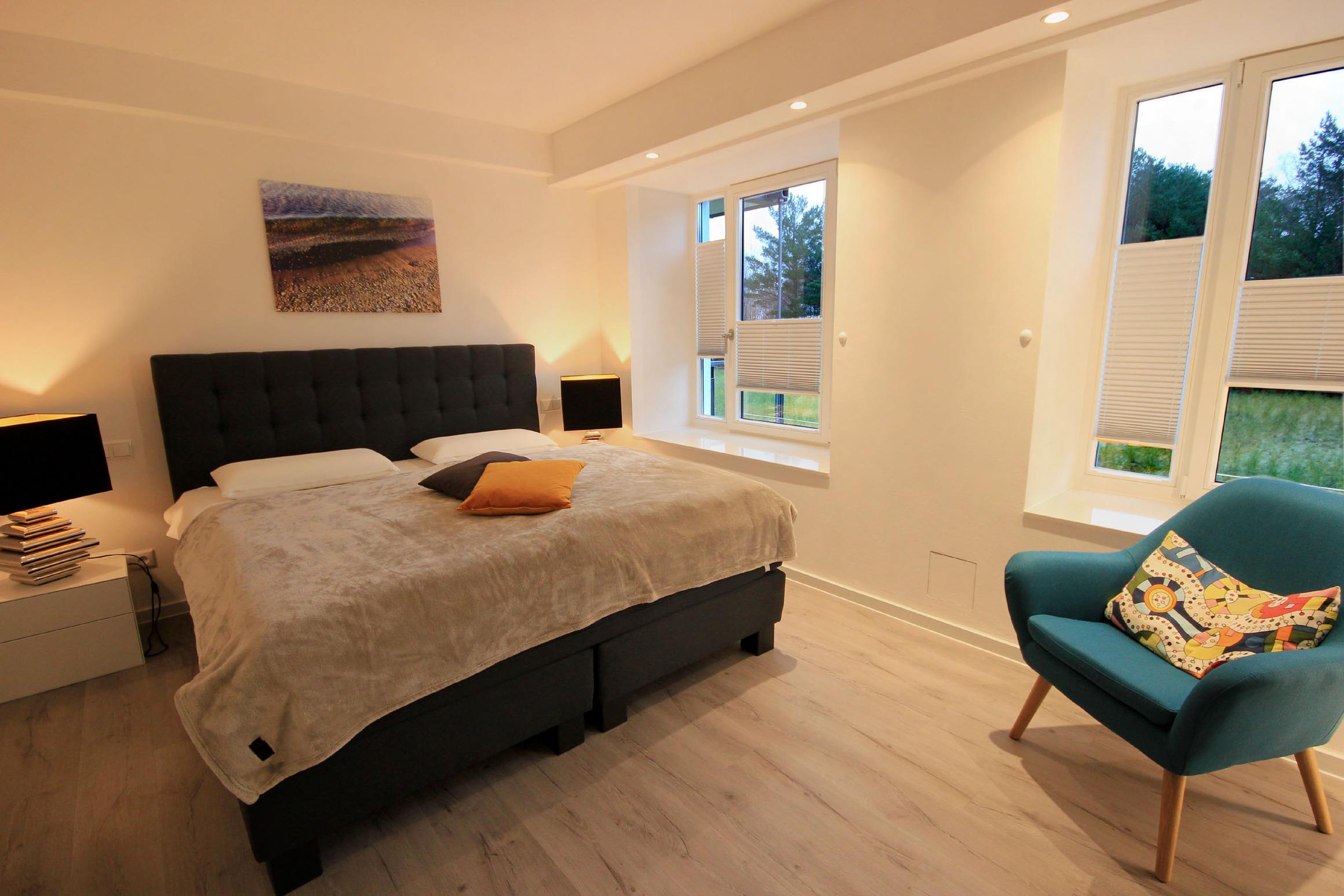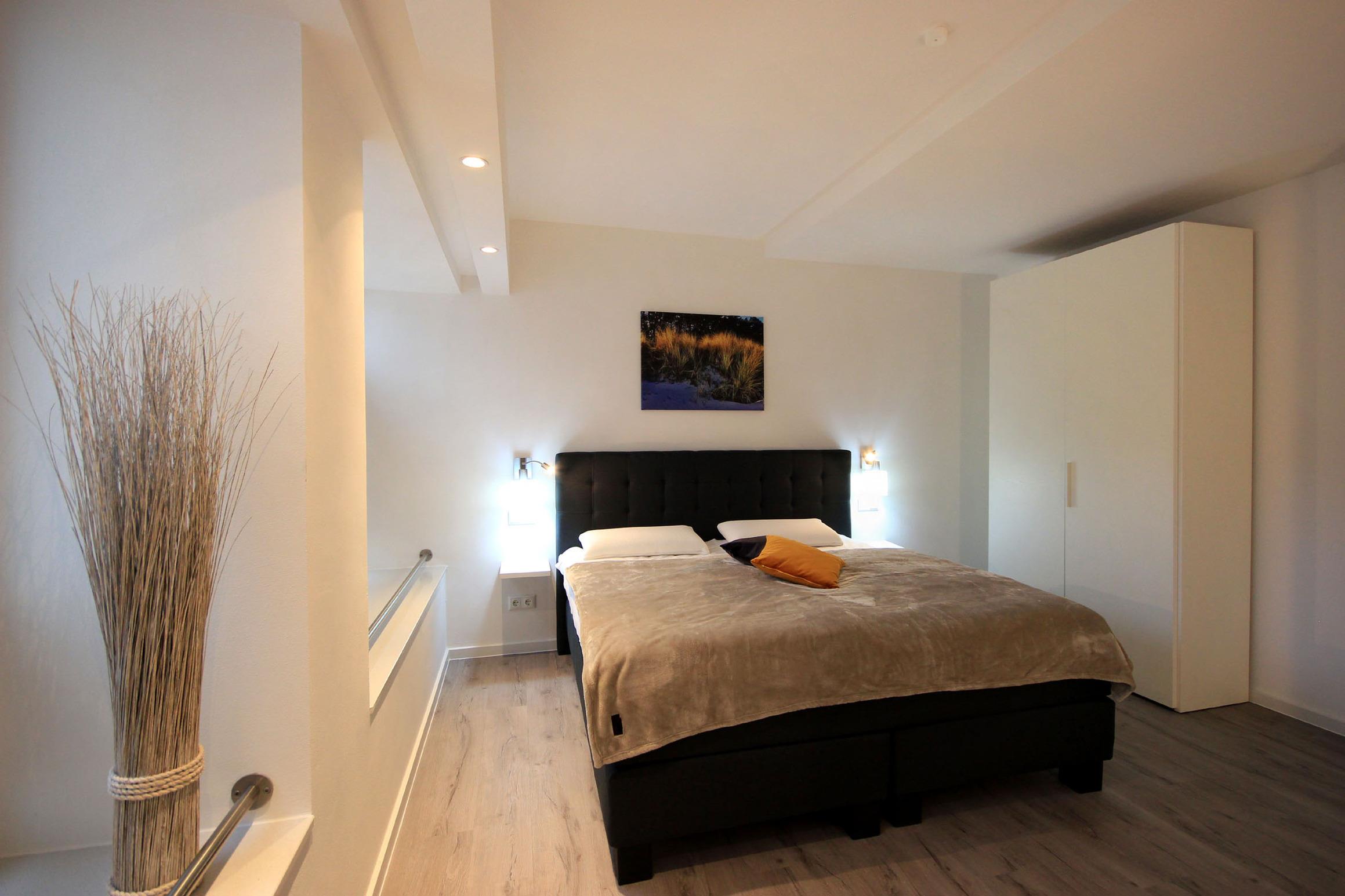 Ihr modernes Appartement besitzt einen vorgelagerten Flur mit Garderobe und Zugang zum Gäste-WC. Weiter geht es in die moderne Wohnküche mit Essplatz und Zugang zur ersten Terrasse samt großen Sonnenschirm. Der großzügige Wohnbereich erwartet Sie mit einer gemütlichen Sitzecke und direktem Zugang zur zweiten Terrasse. Die technische Einrichtung umfasst einen großen Flachbildfernseher, ein Bose SoundTouch Internetradio, einen gebührenfreien WLAN-Zugang sowie für die entspannten Stunden eine kleine Brettspiele- und Büchersammlung. In der attraktiven Küche erwartet Sie unter anderem ein Backofen, Cerankochfeld sowie ein Geschirrspüler, Kühlschrank mit kleinem Gefrierfach, eine Mikrowelle, Kaffeemaschine, Wasserkocher, Toaster sowie weiteres umfangreiches Kücheninventar. Über eine schöne Wendeltreppe erreichen Sie das Obergeschoss, das aus zwei separaten Schlafzimmern und dem Hauptbad mit Dusche, Handtuchtrockner, WC und Fön besteht. Beide Schlafzimmer verfügen jeweils über einen Flachbildfernseher, Kleiderschrank, Kommode und hochwertige Boxspringbetten für einen garantiert angenehmen Schlaf. Rundum eine erstklassig eingerichtete Wohnung zum Abschalten vom Alltag und Genießen des Urlaubes.