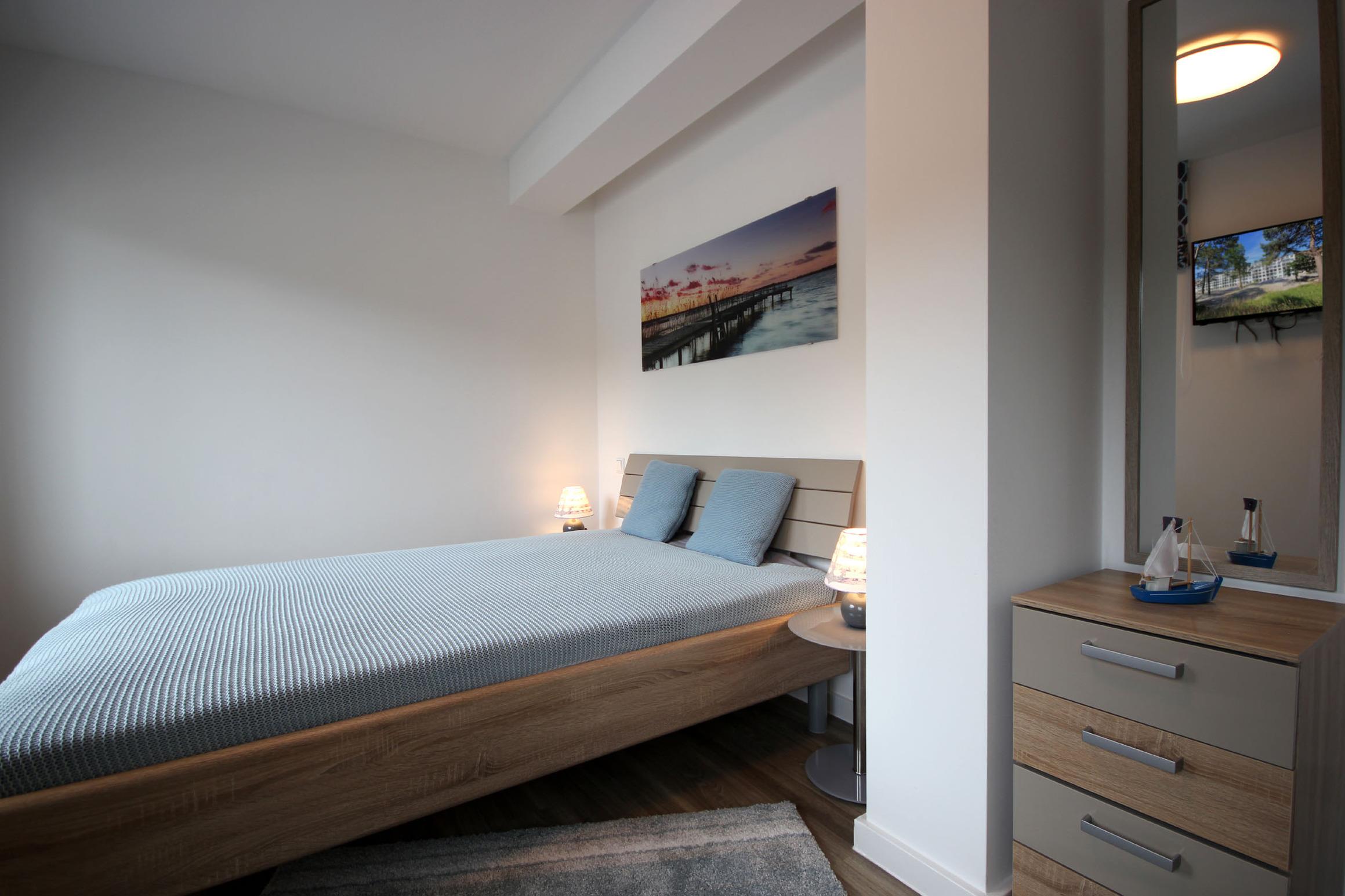 Ihr attraktives Appartement verfügt über einen einladenden Flur mit Garderobe und Zugang zum Gäste-WC mit Fenster. Angrenzend erreichen Sie den sehr gemütlichen Wohnbereich mit Essplatz sowie den erstklassig offenen Küchenbereich. Das geschmackvolle Wohnzimmer, mit Zugang zum Balkon, ist mit einer Sitzecke, Relaxsessel sowie mit einem großen Flachbild-TV und WLAN ausgestattet. In der attraktiven Küche erwartet Sie unter anderem ein Backofen, Cerankochfeld sowie ein Geschirrspüler, Kühlschrank, Tiefkühlschrank, eine Mikrowelle, Kaffeemaschine, Wasserkocher, Toaster sowie weiteres umfangreiches Kücheninventar. Das Hauptschlafzimmer verfügt über ein bequemes Doppelbett, Kleiderschrank, zusätzlichem Flachbild-TV sowie Zugang zum Balkon. Das Hauptbad erwartet Sie mit einer ebenerdigen Regendusche, einem Waschtisch, fest installiertem Fön sowie WC. Im zweiten Schlafbereich befindet sich ein französisches Doppelbett, ein bequemer Schlafsessel für die 5. Person, Flachbild-TV und Kleiderschrank. In beiden Schlafzimmern sorgen zusätzliche Verdunklungsstoffe für einen erholsamen Schlaf. Rundum eine erstklassig eingerichtete Wohnung zum Abschalten vom Alltag und Genießen des Urlaubes.
