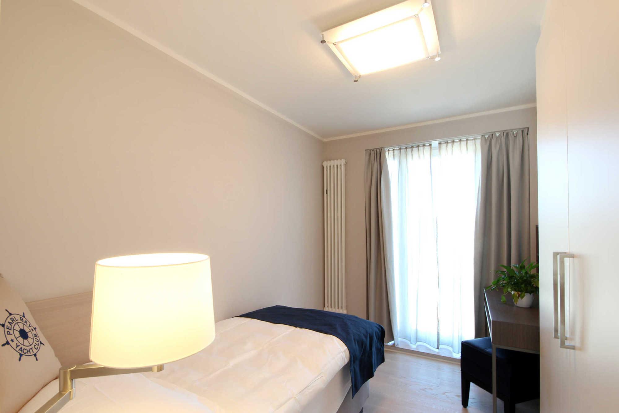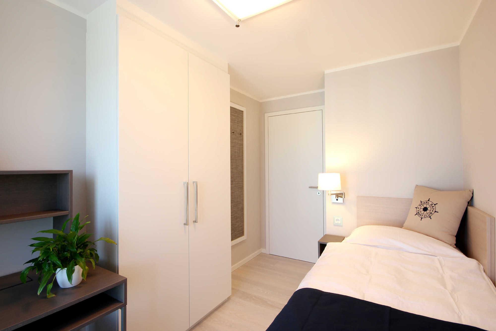Im kleineren Schlafzimmer befindet sich ein Boxspring-Einzelbett (0,9 x 2 m), ein bequemer Sessel, ein Kleiderschrank und ein Schreibtisch.