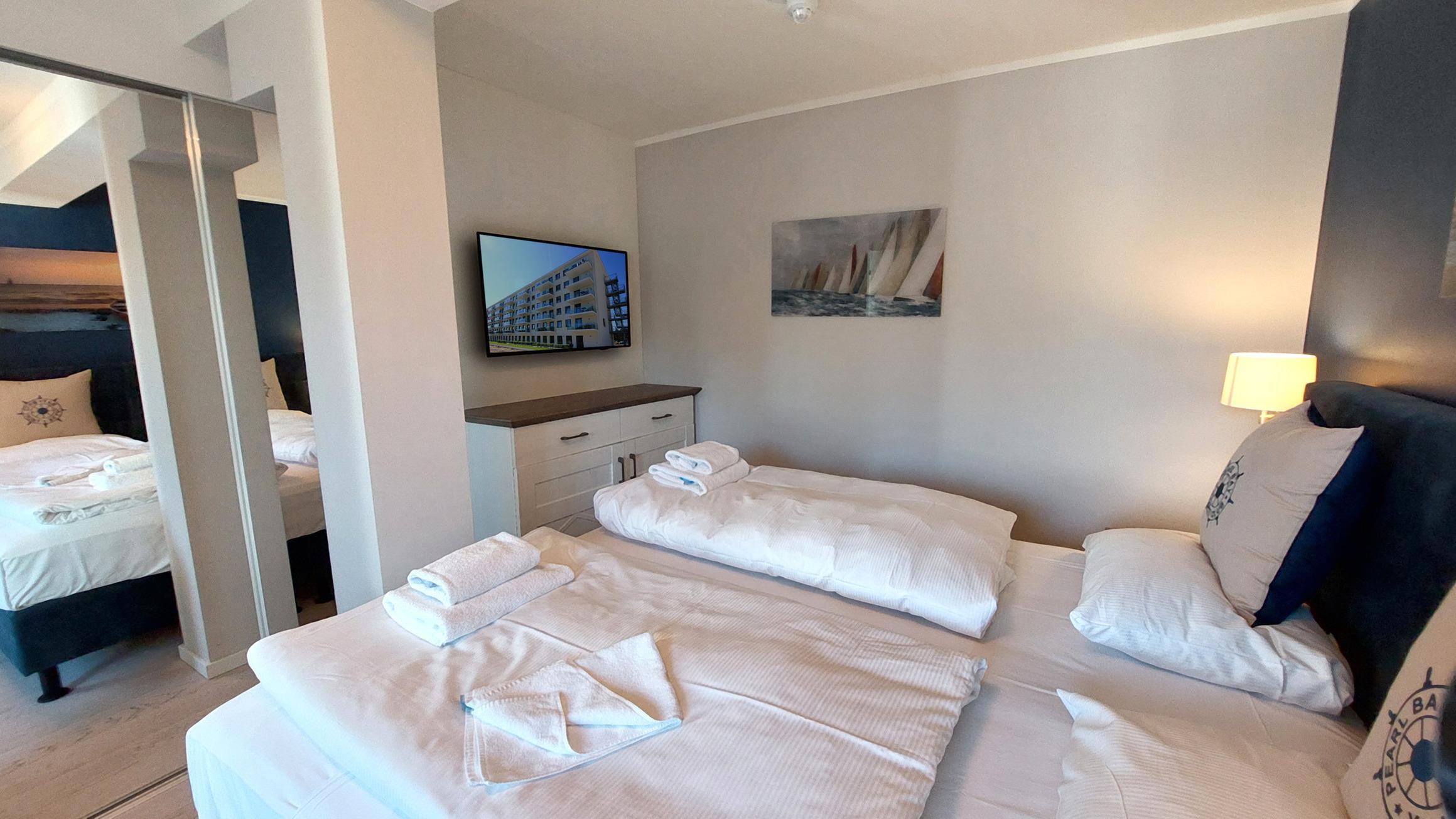Im Schlafzimmer befindet sich ein Doppelbett, ein Kleiderschrank und ein zusätzlicher Flachbild-TV.