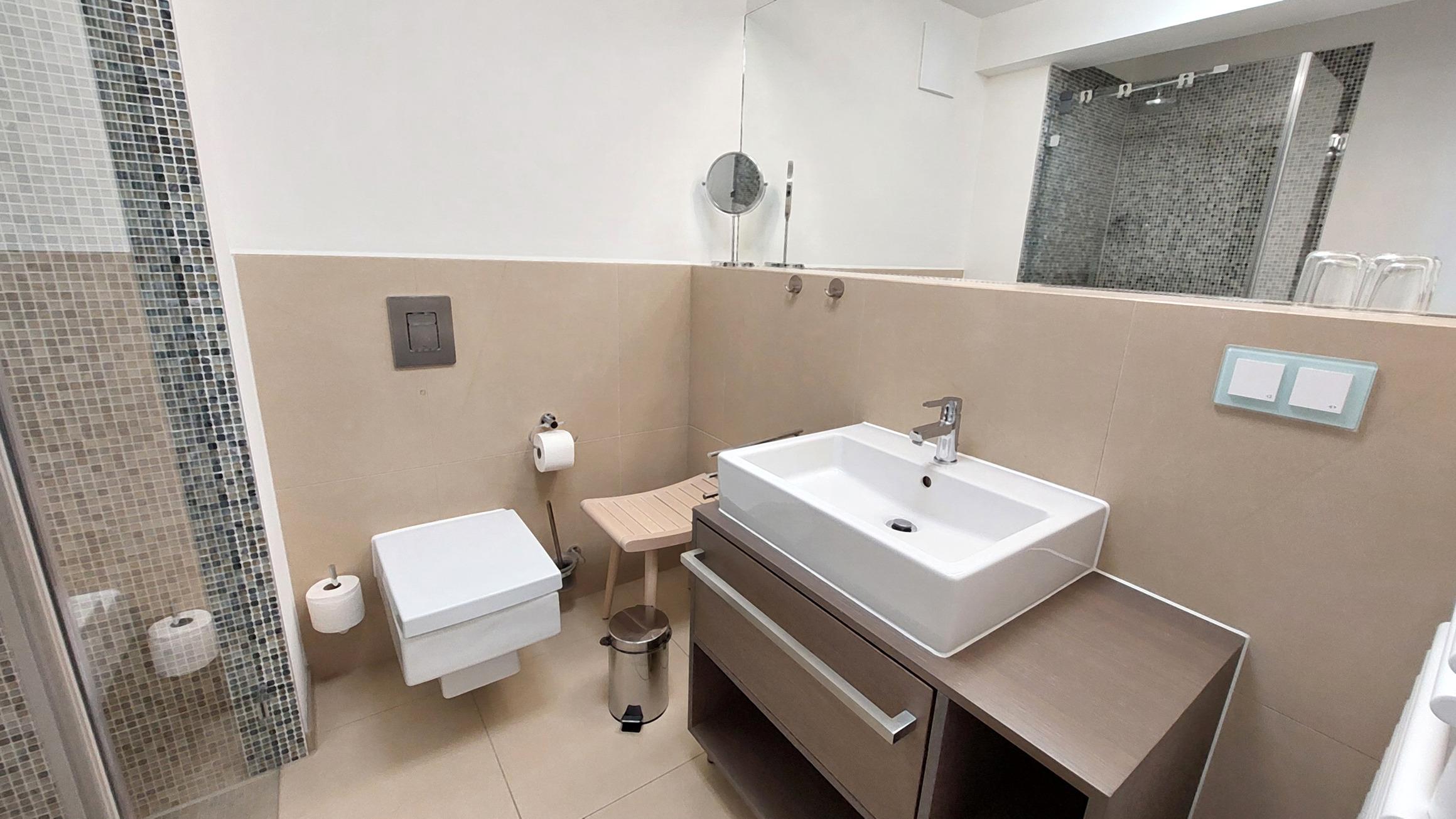 Das Badezimmer verfügt über WC, Waschtisch und großer ebenerdiger Dusche.