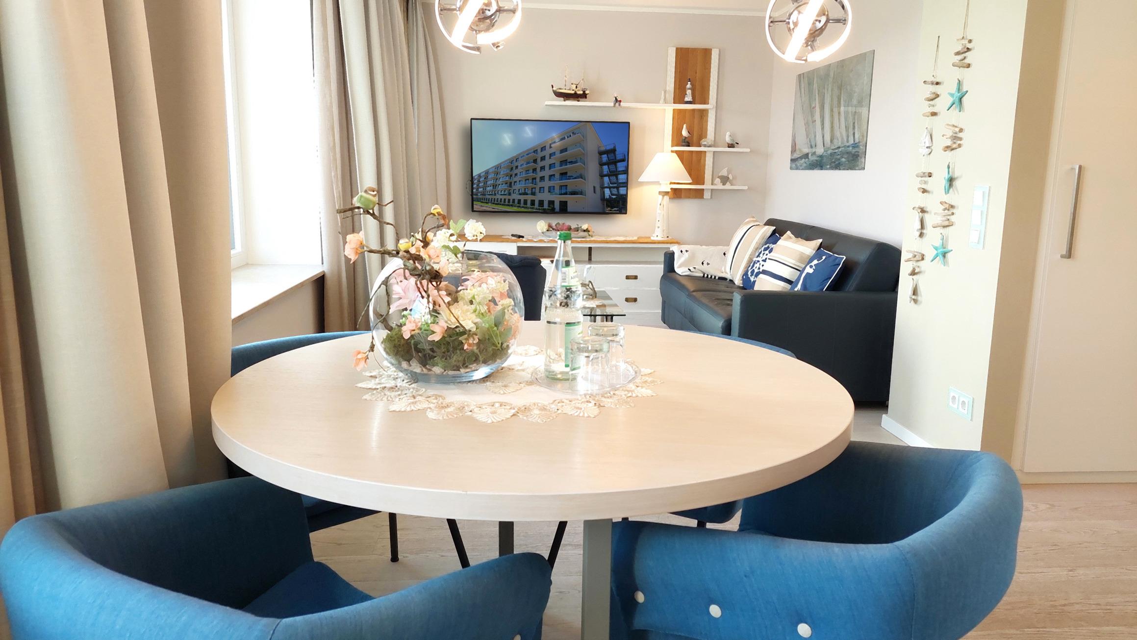 Im offenen Wohn- und Essbereich finden Sie eine moderne Küchenzeile. Dort finden Sie Cerankochfeld, Backofen, Mikrowelle, Geschirrspüler, Kühlschrank (mit Gefrierfach) und viele weitere nützliche Küchenhelfer, welche auch im Urlaub die Möglichkeit der Selbstversorgung bietet. Der Esstisch bietet Sitzgelegenheiten für 4 Personen.