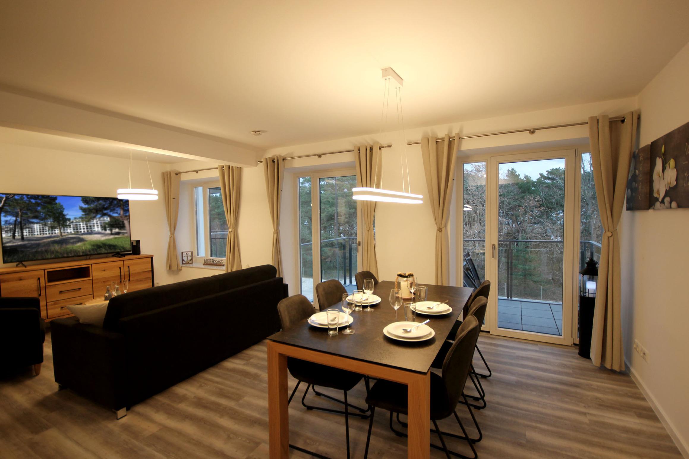 Ihre stilvolle 3-Raumwohnung 112RB332 verfügt über 83 qm2 Wohnfläche und befindet sich in der 3. Etage. Vom Balkon genießen Sie den Blick zum Kiefernwald sowie den Ostseedünen. Die hochwertig und modern eingerichtete Nichtraucherwohnung ist mit bis zu 6 Personen belegbar. Ihr attraktives Appartement verfügt über einen einladenden Flur mit Garderobe und Zugang zum ersten Duschbad. Angrenzend erreichen Sie den sehr gemütlichen Wohnbereich mit Essplatz sowie den erstklassig offenen Küchenbereich. Das geschmackvolle Wohnzimmer, mit Zugang zum Balkon, ist mit einer Sitzecke mit Schlaffunktion, Sessel sowie mit einem großen Flachbild-TV und WLAN ausgestattet. In der attraktiven Küche erwartet Sie unter anderem ein Backofen, Cerankochfeld sowie ein Geschirrspüler, Kühlschrank, Tiefkühlschrank, eine Mikrowelle, Kaffeemaschine sowohl für Bohnen- oder Pulverkaffee, Wasserkocher, Toaster sowie weiteres umfangreiches Kücheninventar. Das Hauptschlafzimmer verfügt über ein bequemes Doppelbett, Kleiderschrank sowie zusätzlichem Flachbild-TV. Der zweite Schlafbereich erwartete Sie ebenso mit einem Doppelbett, Flachbild-TV, Kleiderschrank und als Highlight ein Bad en Suite mit Dusche. In beiden Schlafzimmern sorgen zusätzliche Verdunklungsstoffe für einen erholsamen Schlaf. Rundum eine erstklassig eingerichtete Wohnung zum Abschalten vom Alltag und Genießen des Urlaubes.