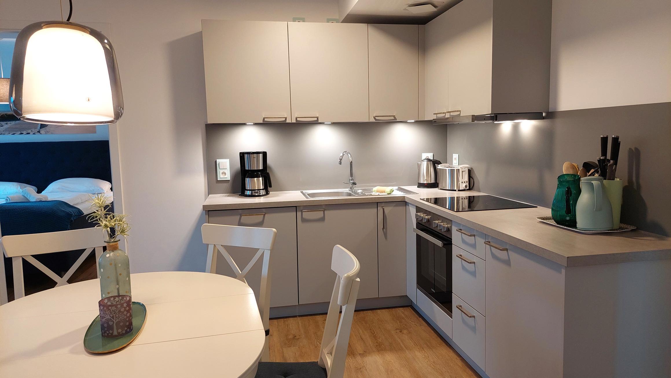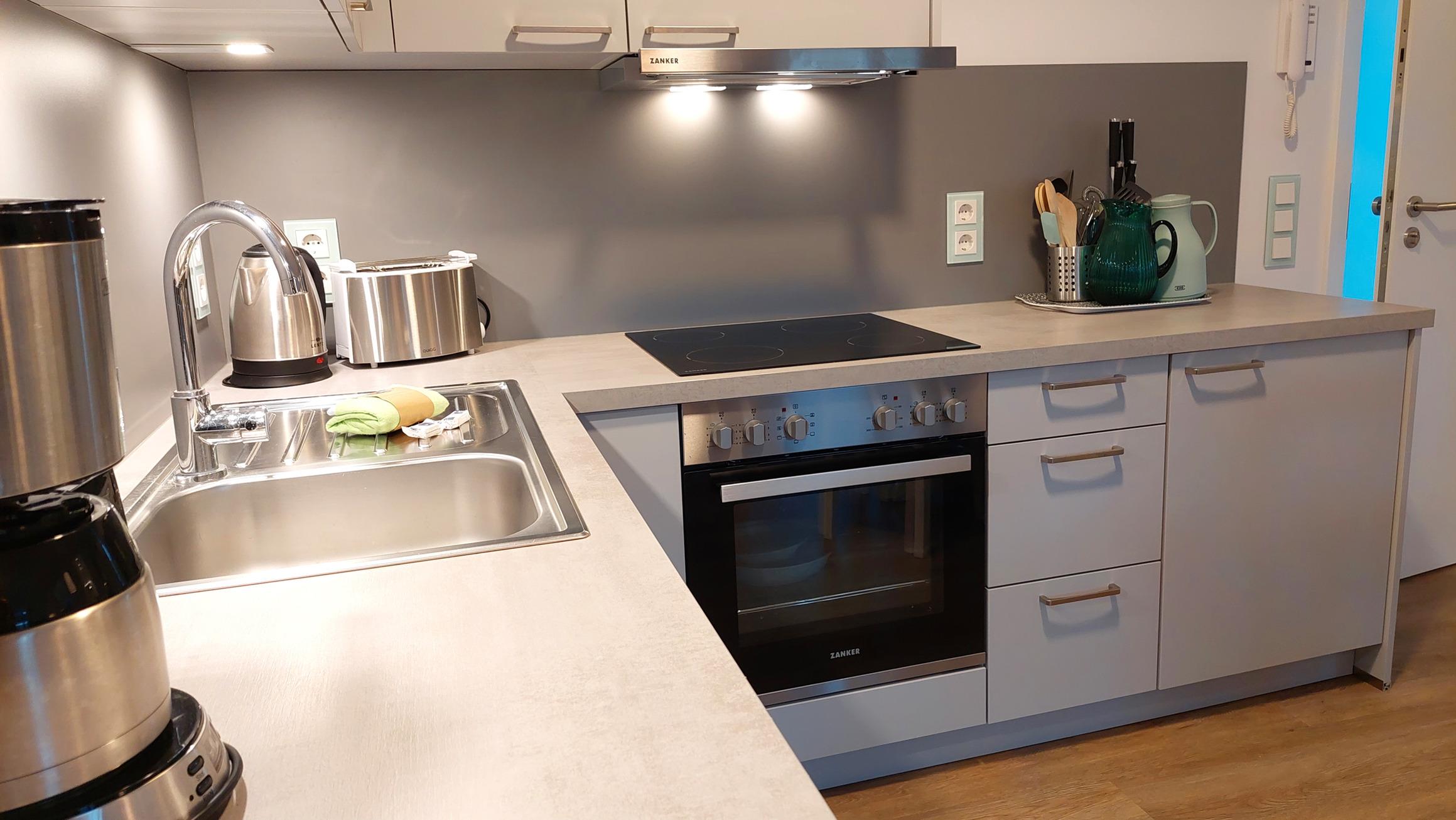 Die moderne Einbauküche ist komplett ausgestattet mit einem Geschirrspüler, einem Kühlschrank mit Gefrierfach, einem Cerankochfeld, einem Toaster, einer Kaffeemaschine und einem Wasserkocher.