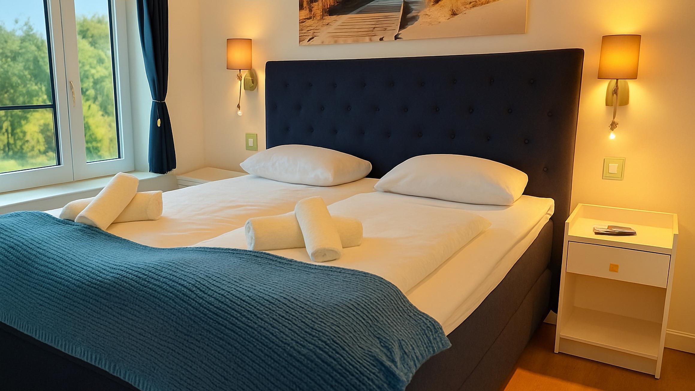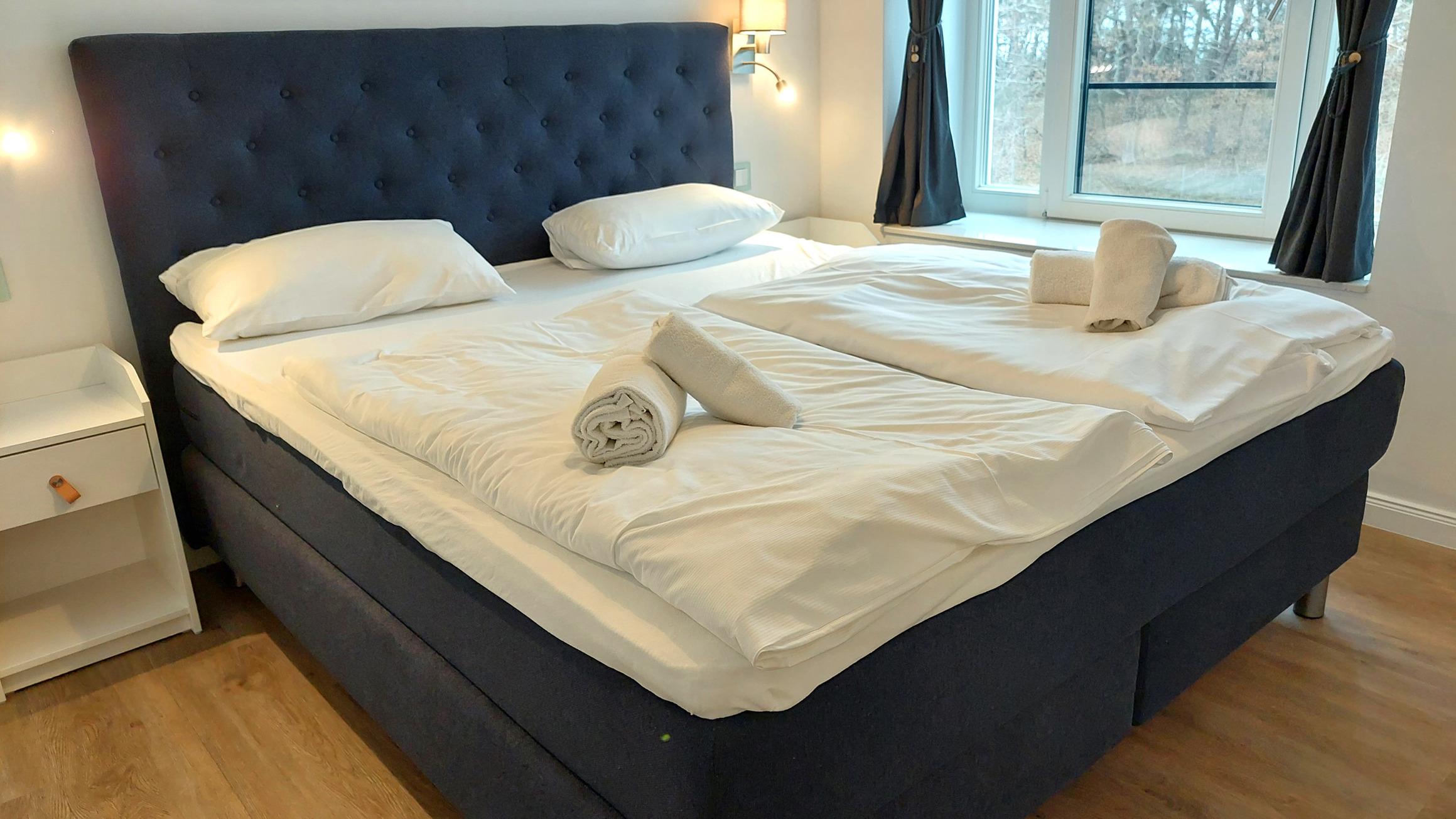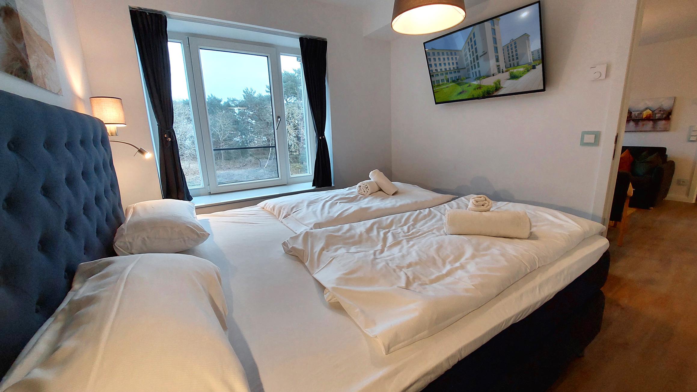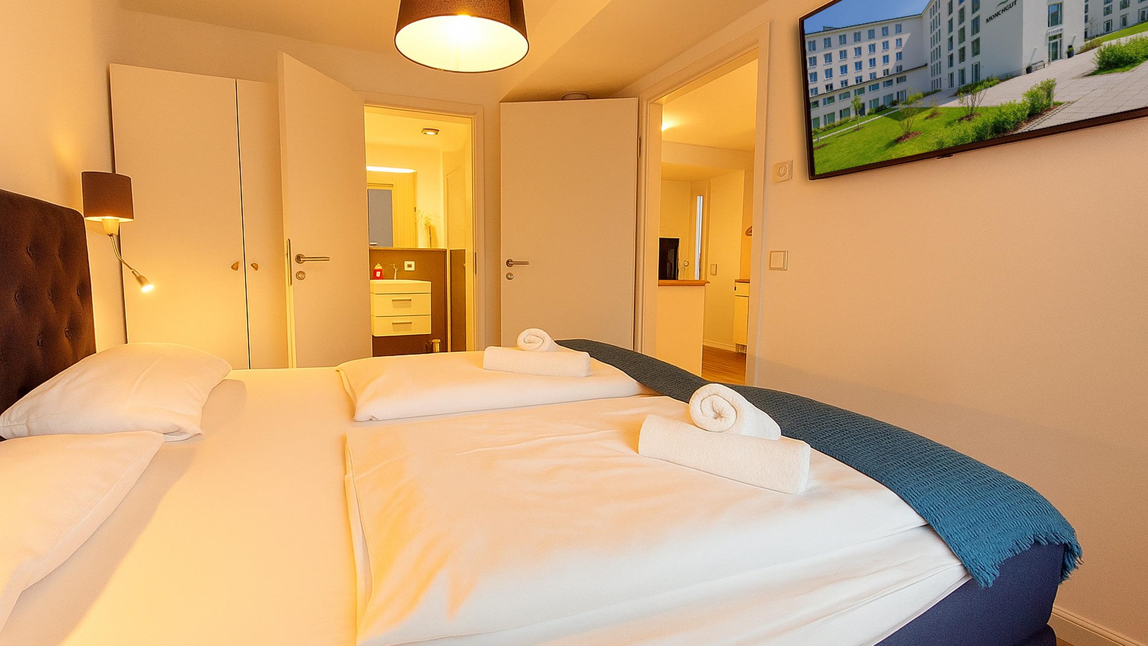 Die Wohnung verfügt über 2 vollwertige Schlafzimmer, jeweils mit einem Doppelbett, Kleiderschrank und eigenem Fernseher. Eines der Schlafzimmer hat außerdem ein eigenes Badezimmer ("Bad en Suite"). Das zweite Badezimmer ist ebenfalls ausgestattet mit WC, Waschtisch und ebenerdiger Dusche.