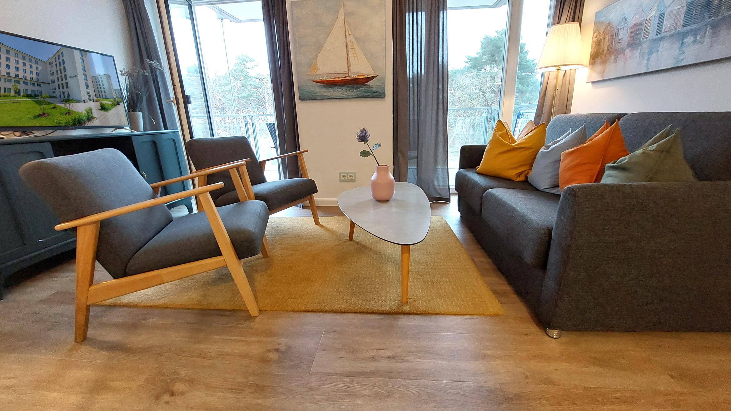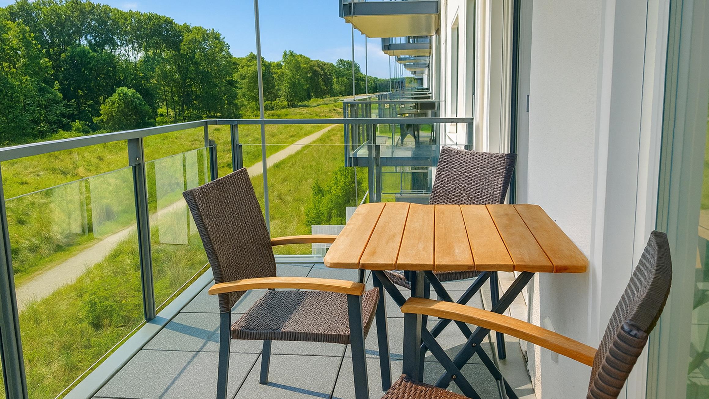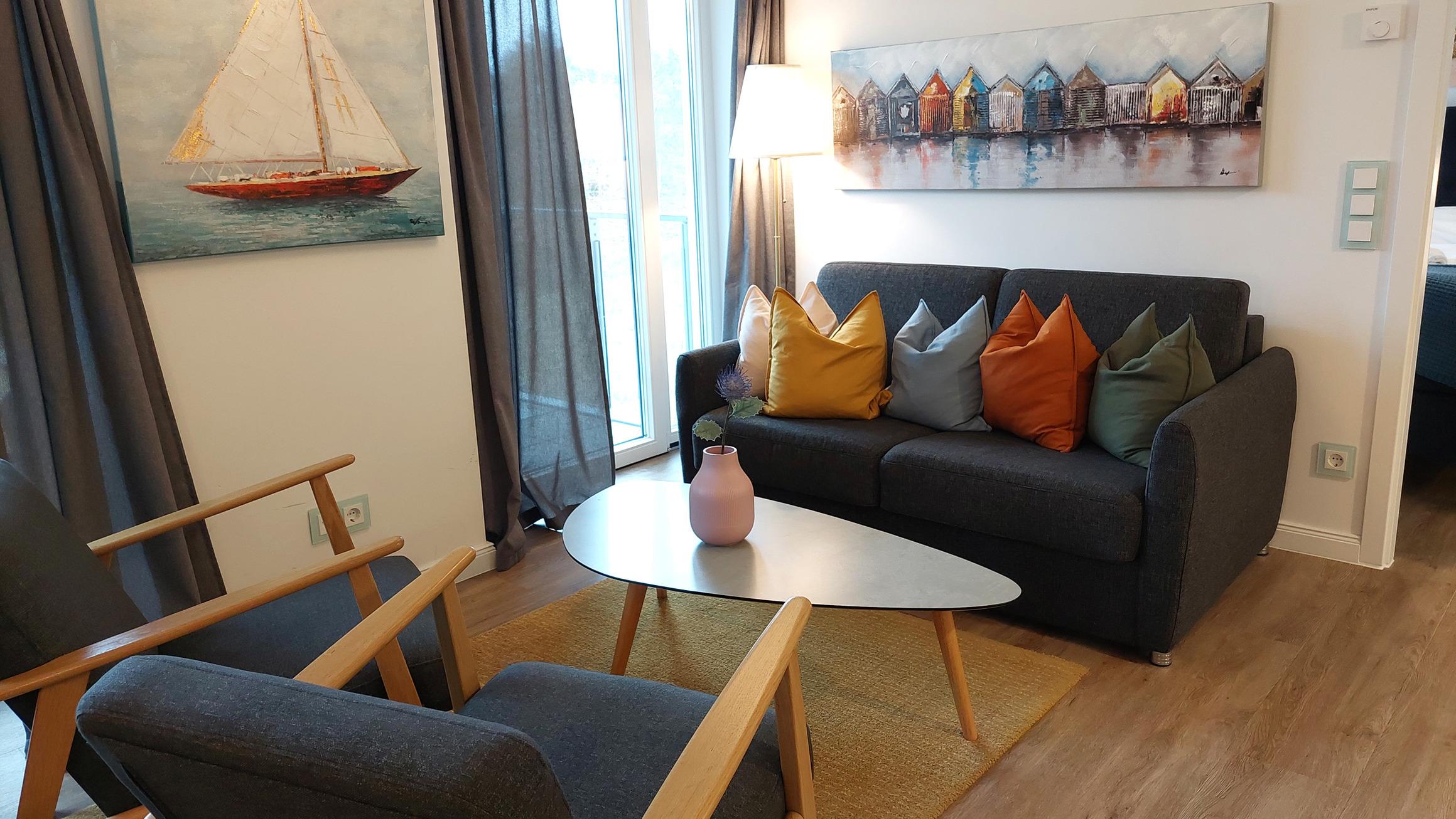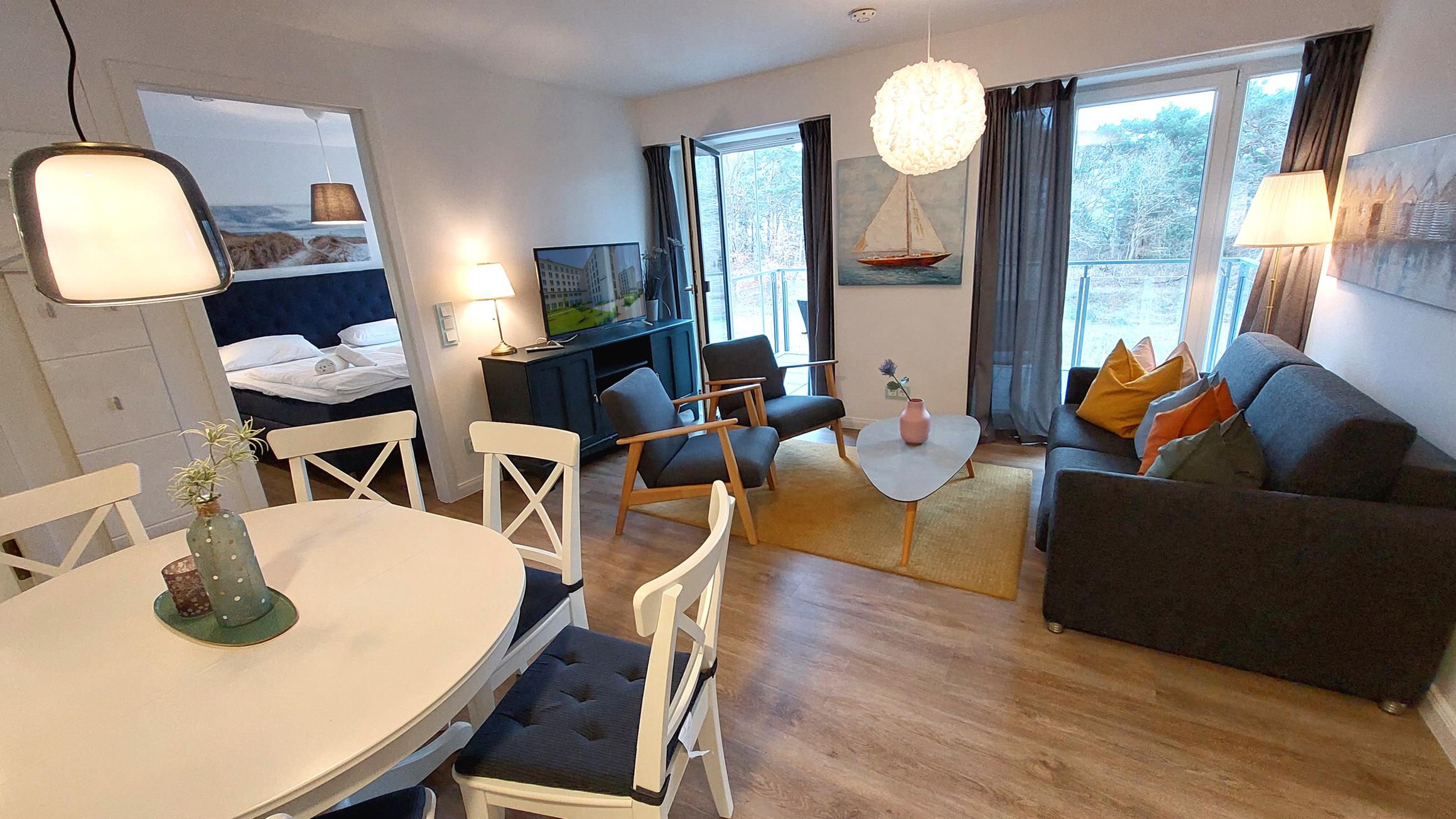 Das Wohn- und Esszimmer ist das Zentrum der Wohnung und lädt mit einer ausklappbaren Sofalandschaft zum Entspannen ein. Für Unterhaltung bei jedem Wetter gibt es einen Smart-TV und kostenfreies WLAN. Der Essbereich bietet Platz für 6 Personen und vom möblierten und überdachten Balkon aus hat man einen Blick auf den angrenzenden Küstenwald und die Ostseedünen.