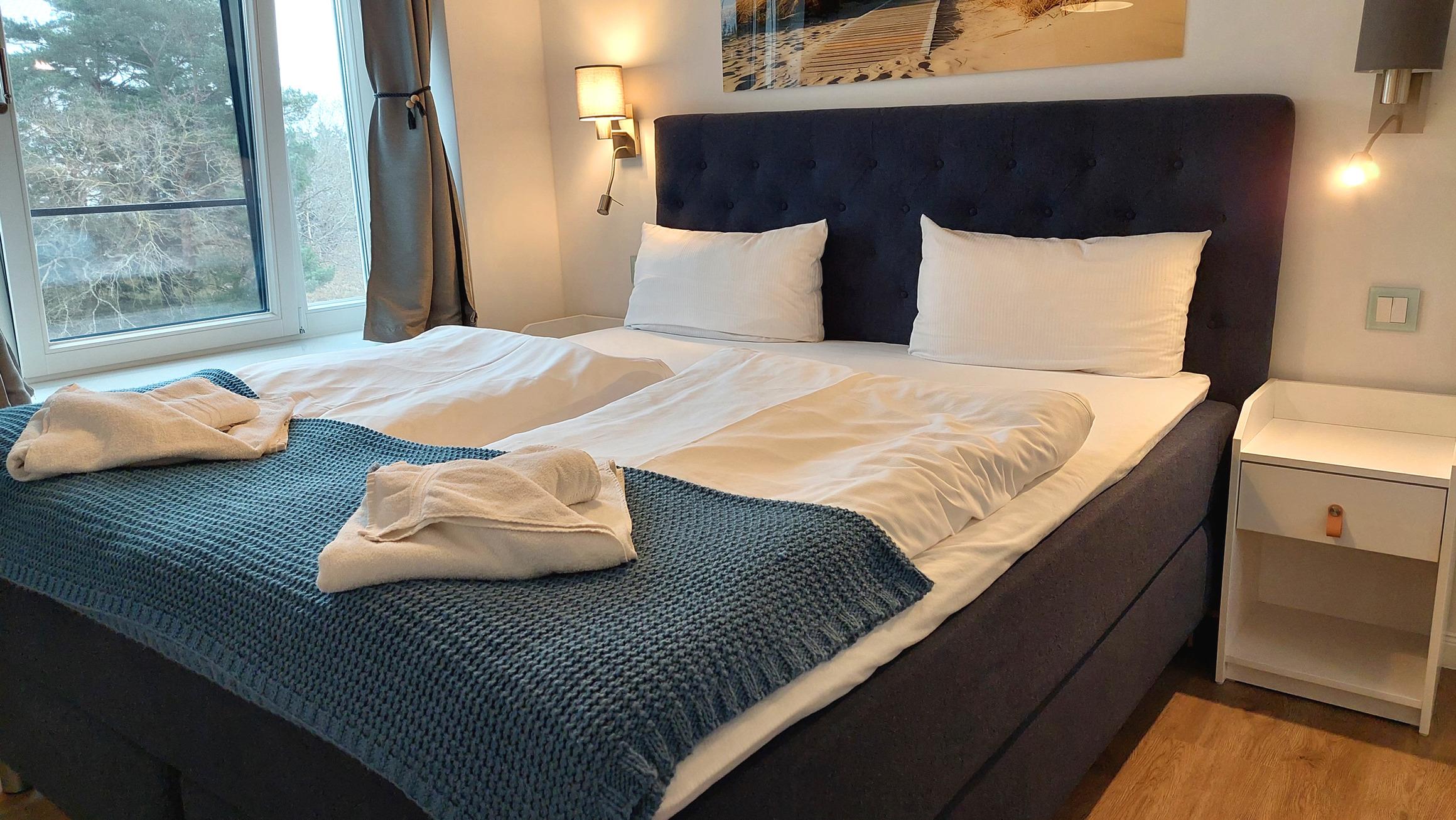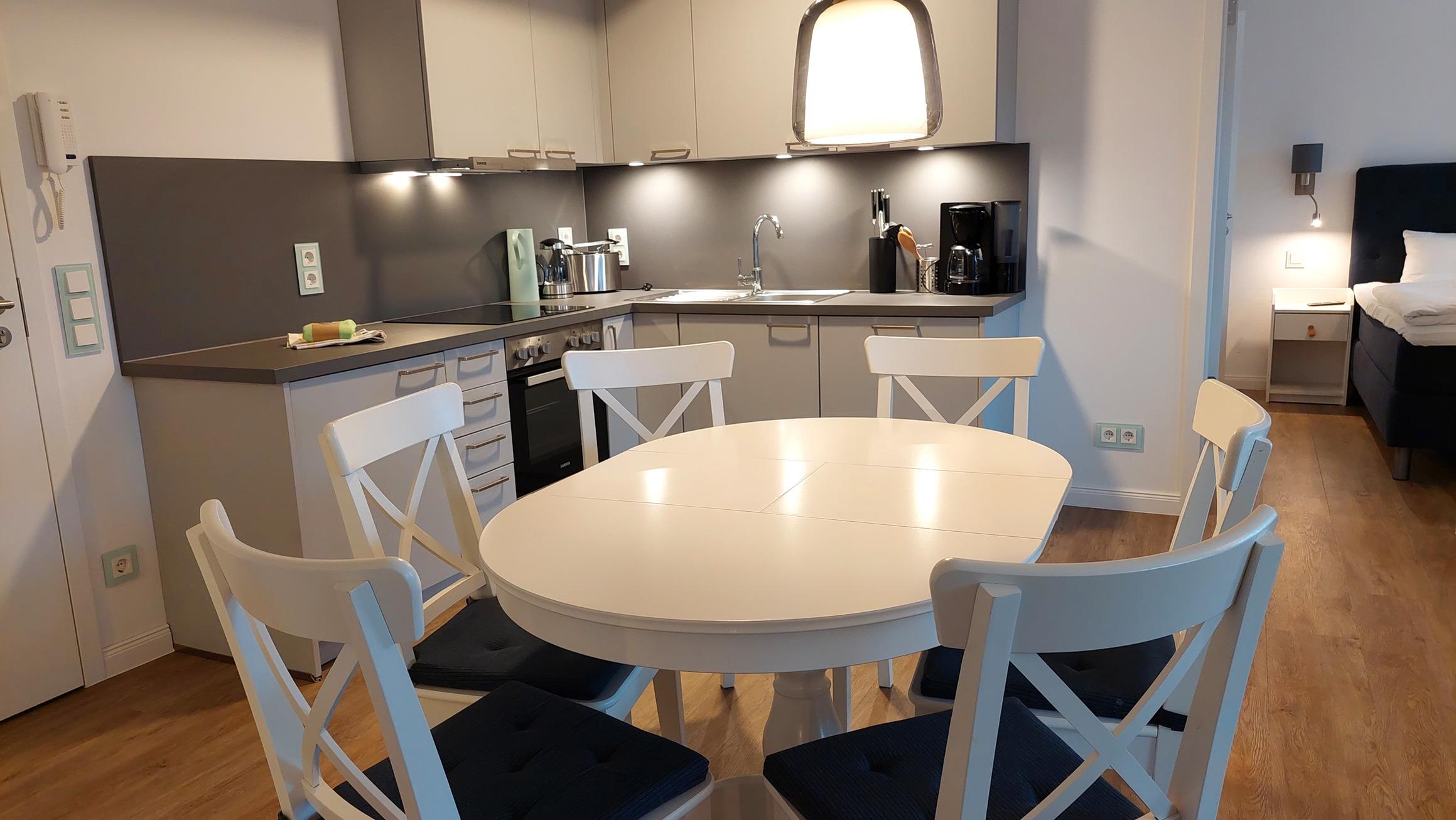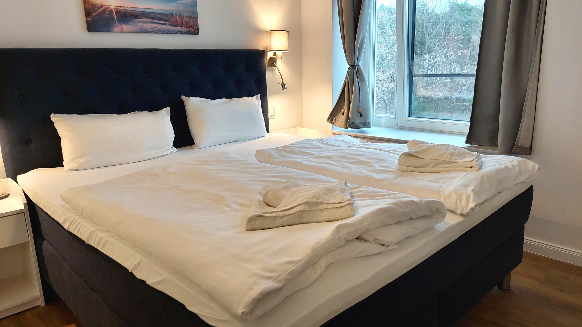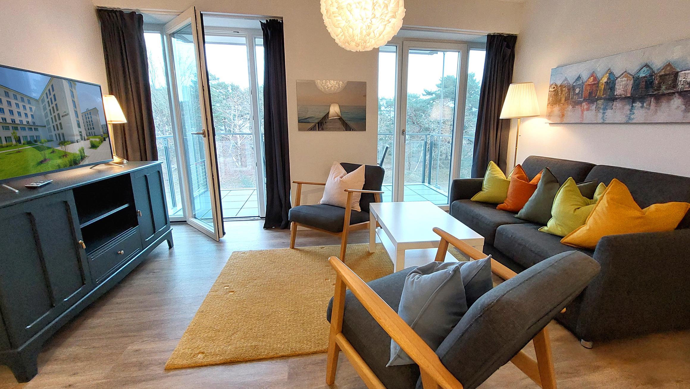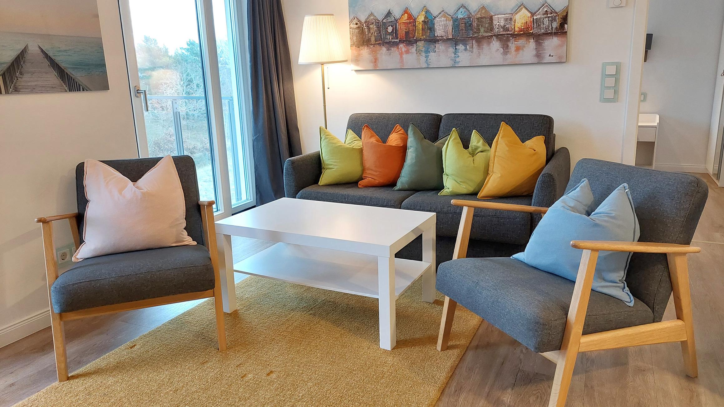 Das Wohn- und Esszimmer ist das Zentrum der Wohnung und lädt mit einer ausklappbaren Sofalandschaft zum Entspannen ein. Für Unterhaltung bei jedem Wetter gibt es einen Smart-TV und kostenfreies WLAN. Der Essbereich bietet Platz für 6 Personen und vom möblierten und überdachten Balkon aus hat man einen Blick auf den angrenzenden Küstenwald und die Ostseedünen.