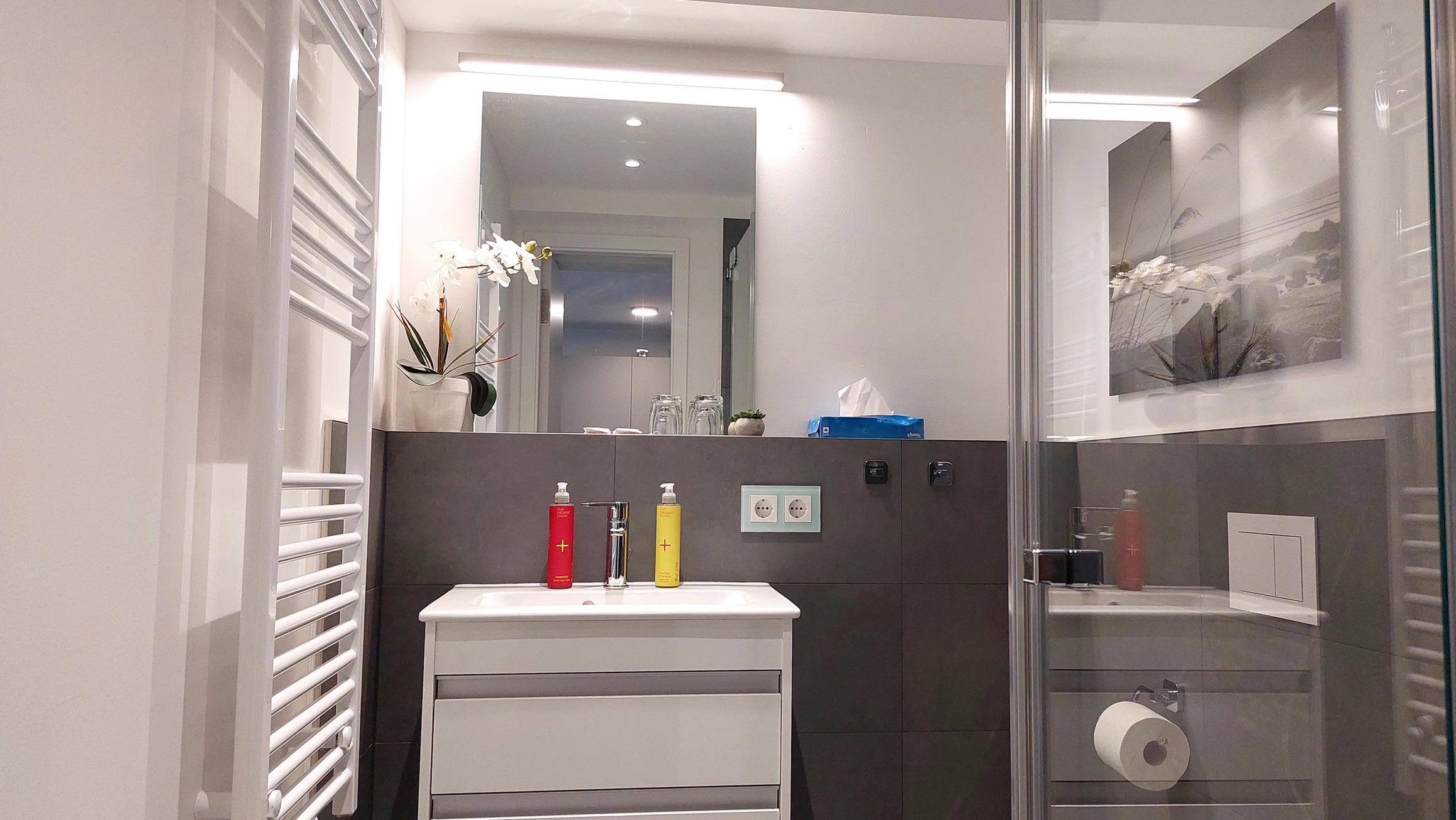 Die Wohnung verfügt über 2 vollwertige Schlafzimmer, jeweils mit einem Doppelbett, Kleiderschrank und eigenem Fernseher. Eines der Schlafzimmer hat außerdem ein eigenes Badezimmer ("Bad en Suite"). Das zweite Badezimmer ist ebenfalls ausgestattet mit WC, Waschtisch und ebenerdiger Dusche.