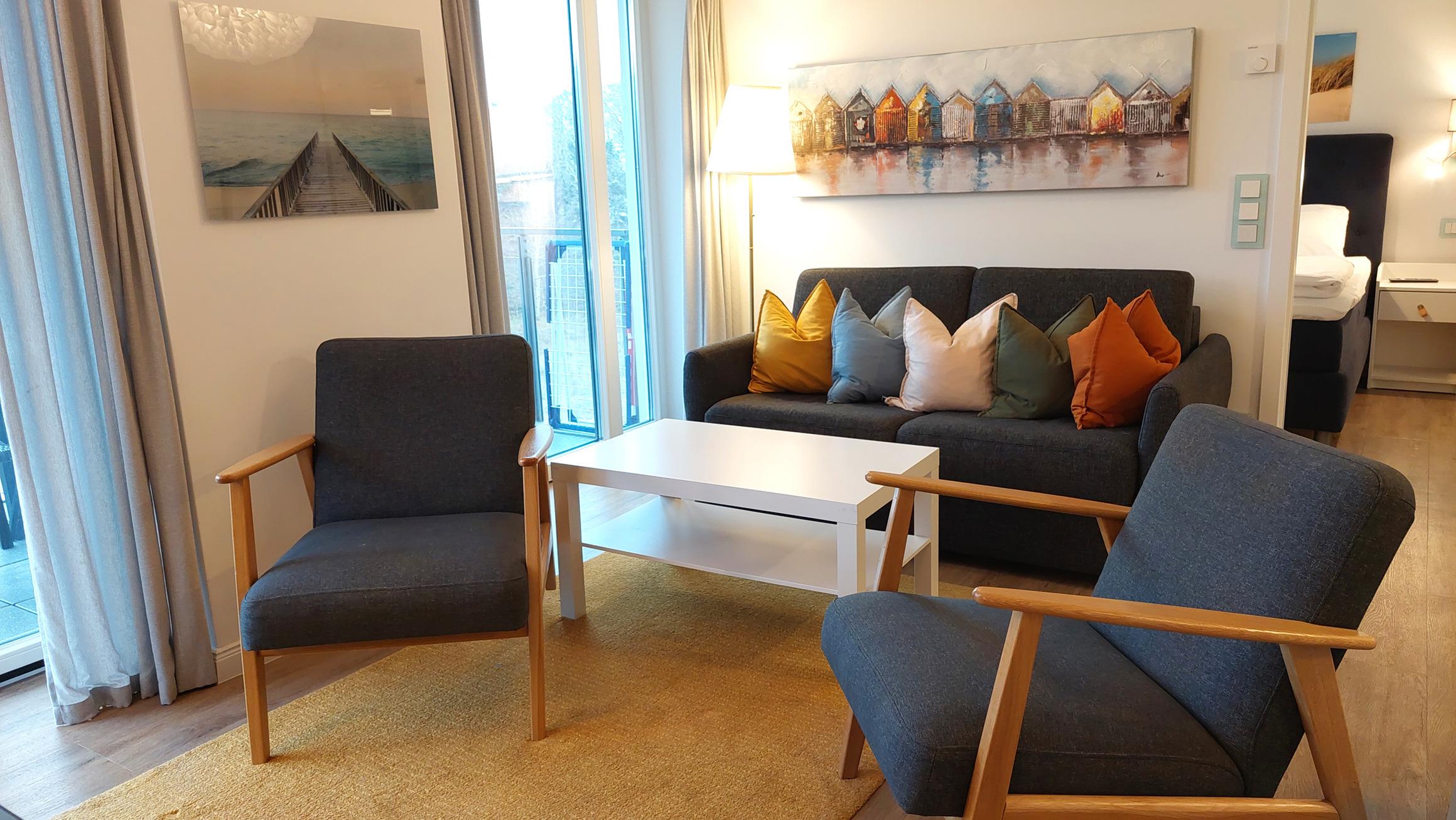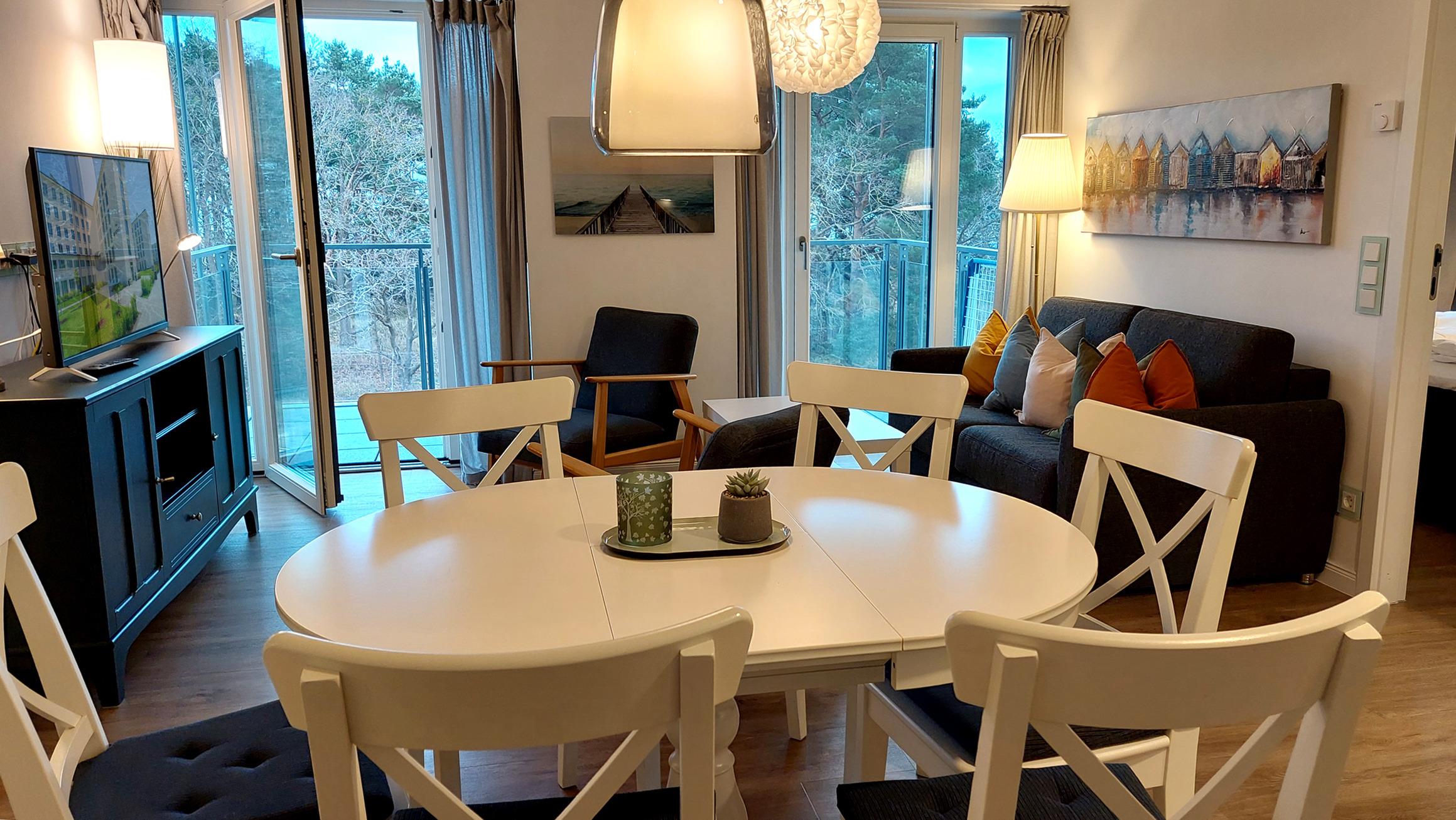 Das Wohn- und Esszimmer ist das Zentrum der Wohnung und lädt mit einer ausklappbaren Sofalandschaft zum Entspannen ein. Für Unterhaltung bei jedem Wetter gibt es einen Smart-TV und kostenfreies WLAN. Der Essbereich bietet Platz für 6 Personen und vom möblierten und überdachten Balkon aus hat man einen Blick auf den angrenzenden Küstenwald und die Ostseedünen.