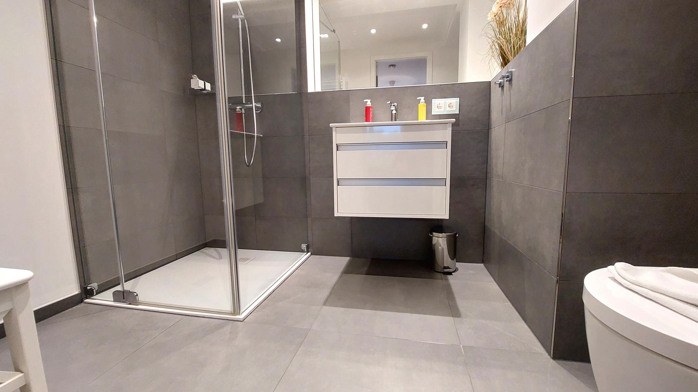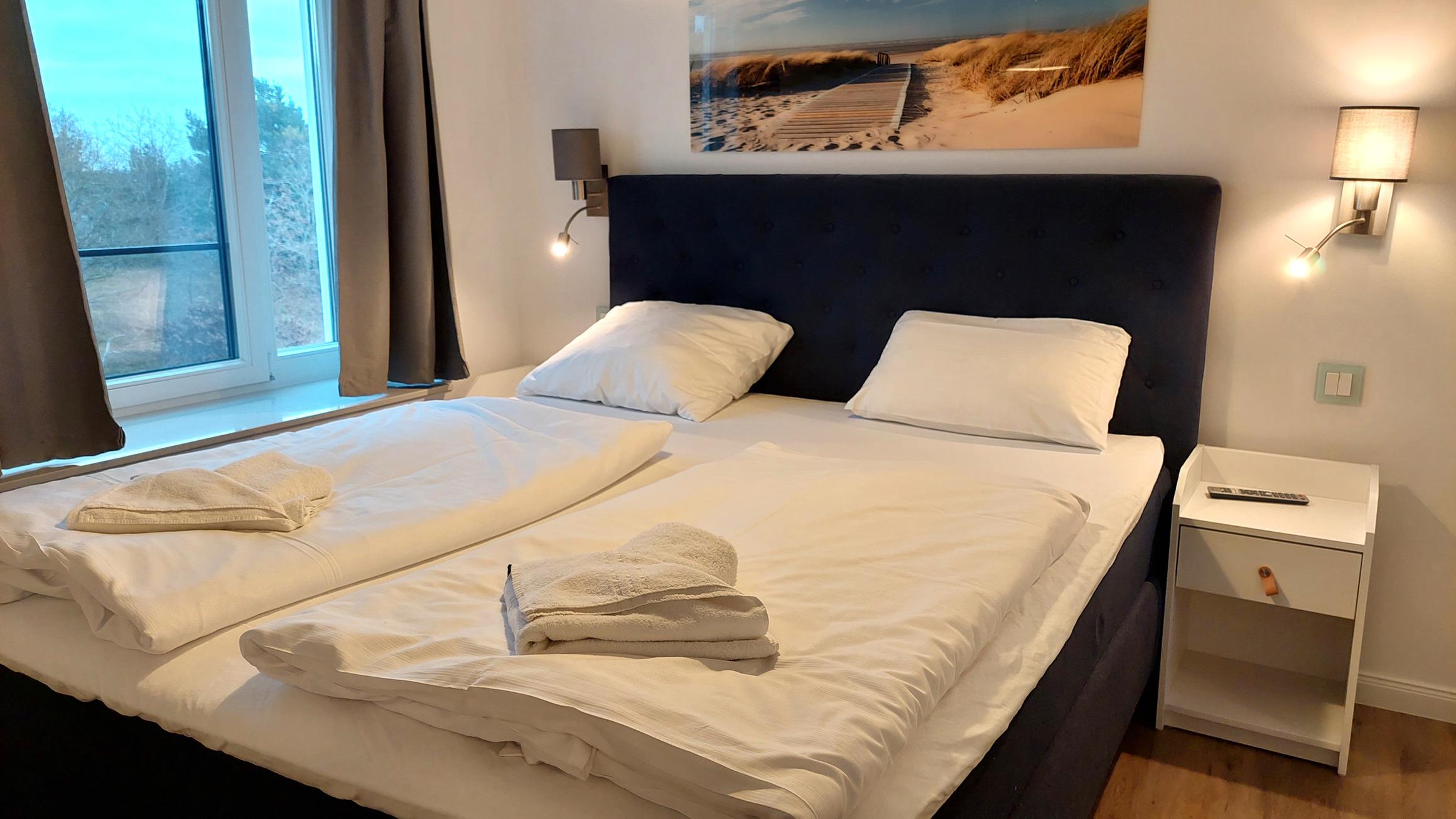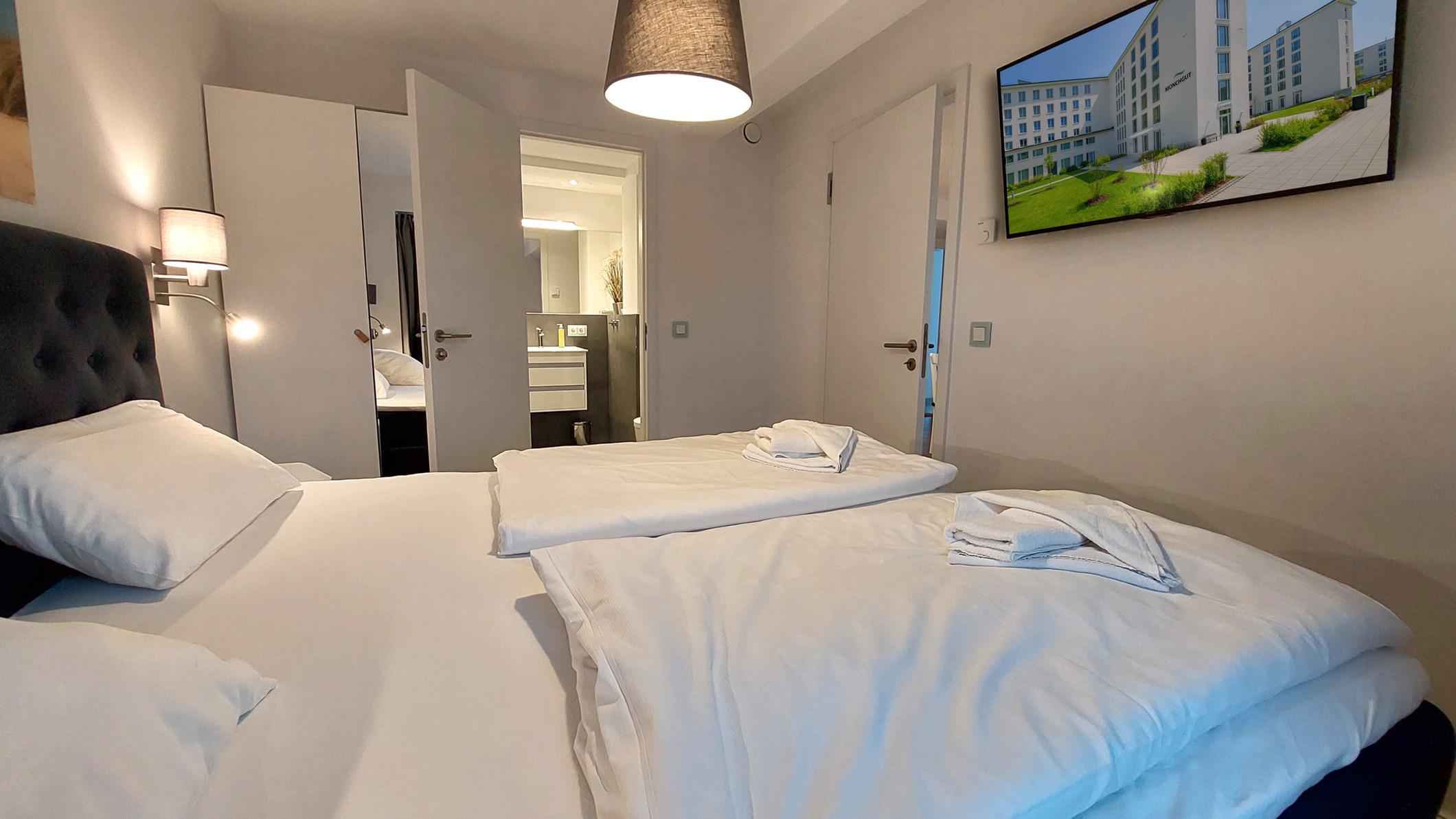 Die Wohnung verfügt über 2 vollwertige Schlafzimmer, jeweils mit einem Doppelbett, Kleiderschrank und eigenem Fernseher. Eines der Schlafzimmer hat außerdem ein eigenes Badezimmer ("Bad en Suite"). Das zweite Badezimmer ist ebenfalls ausgestattet mit WC, Waschtisch und ebenerdiger Dusche.