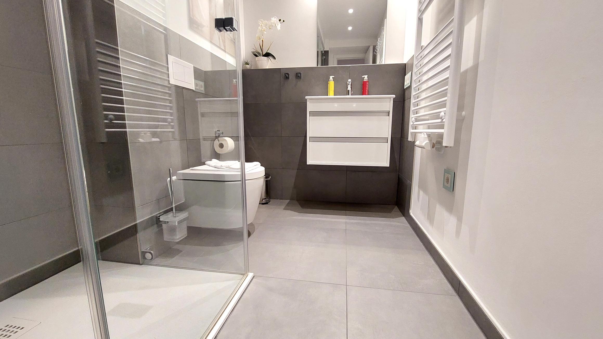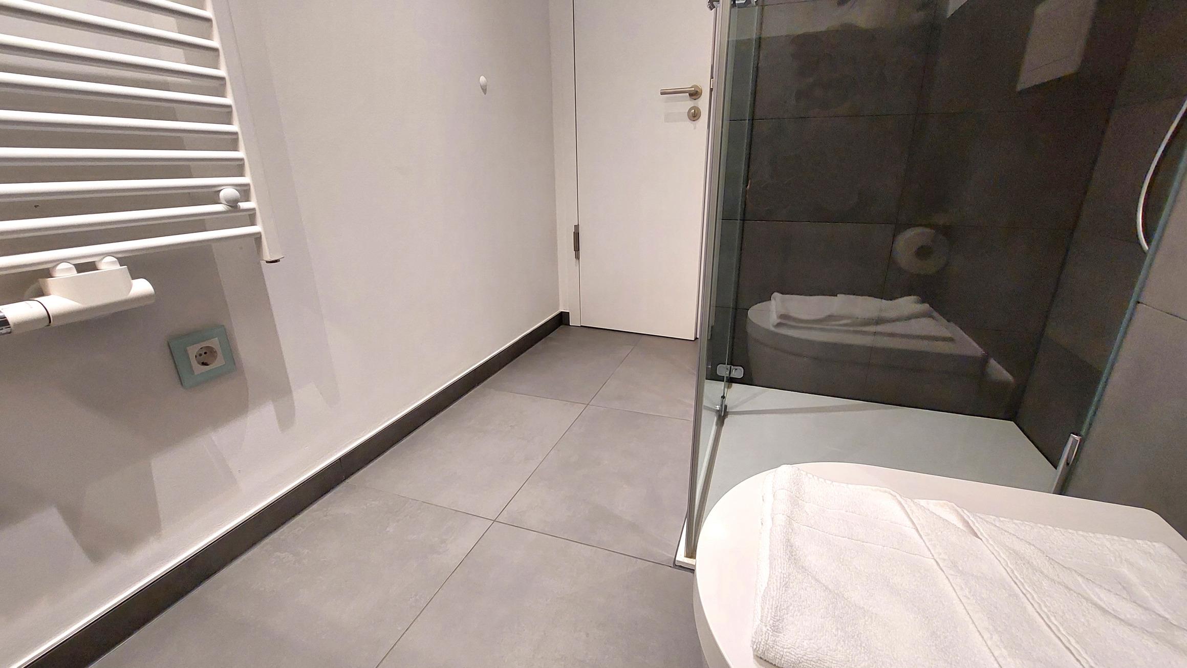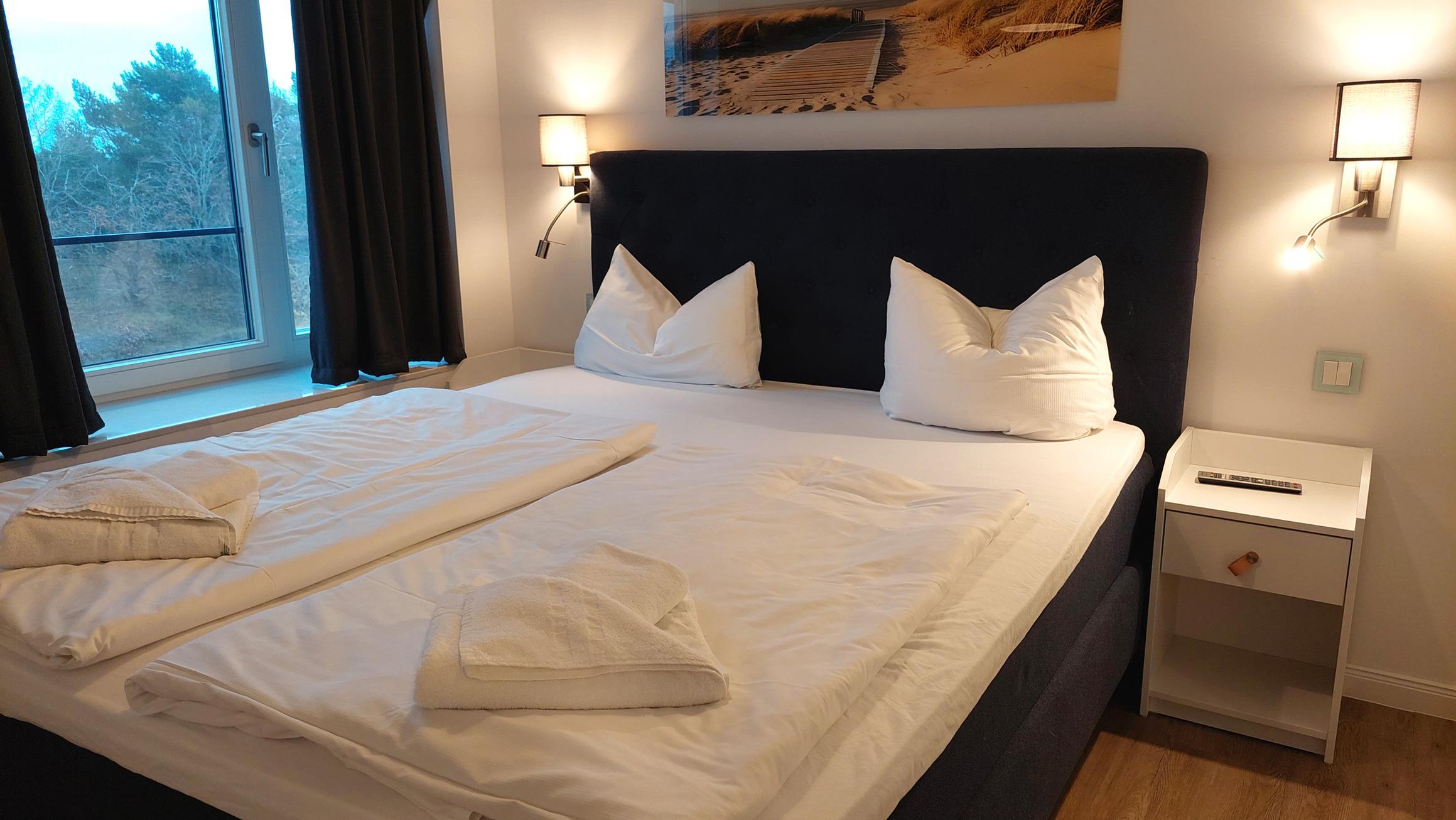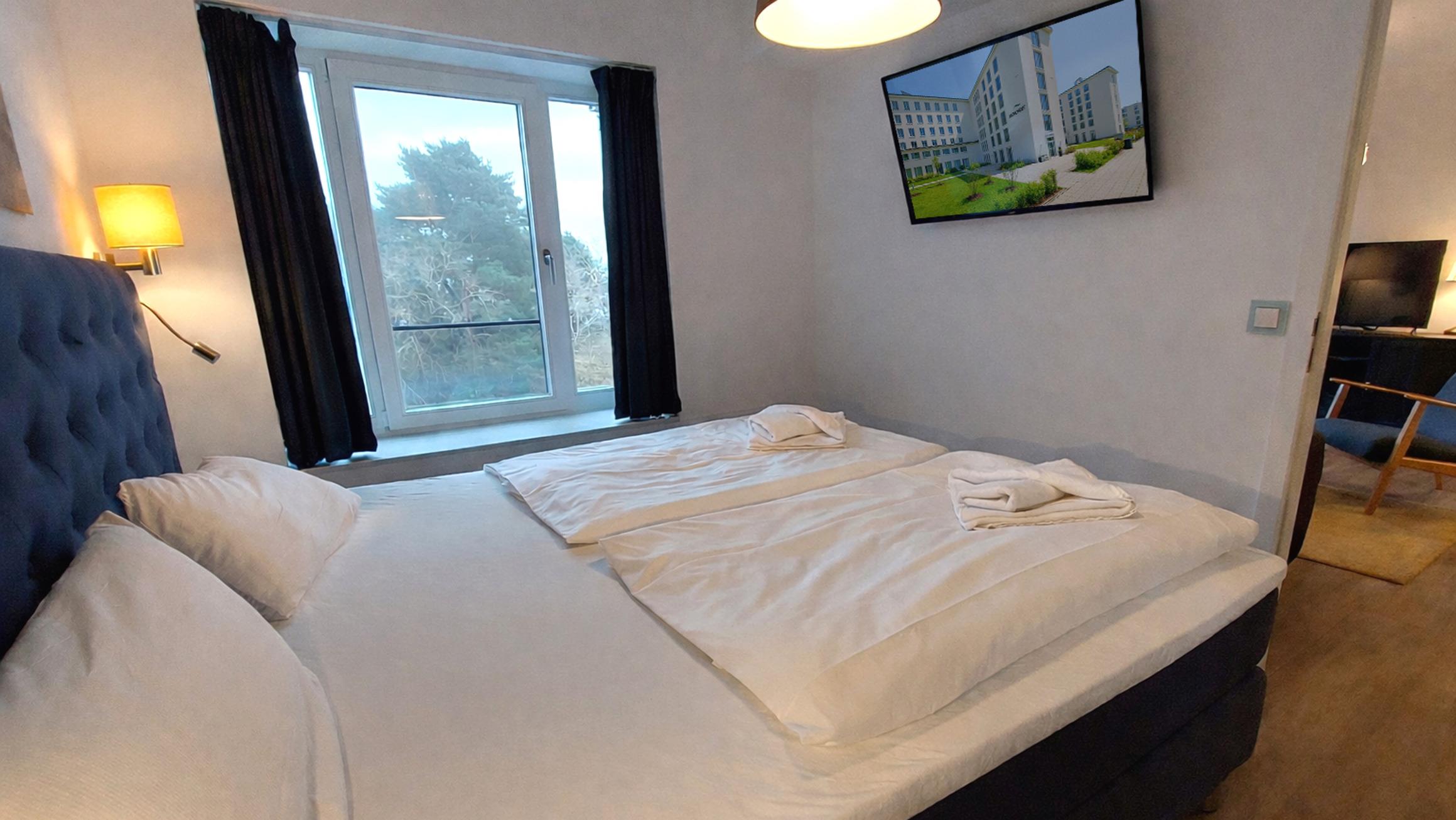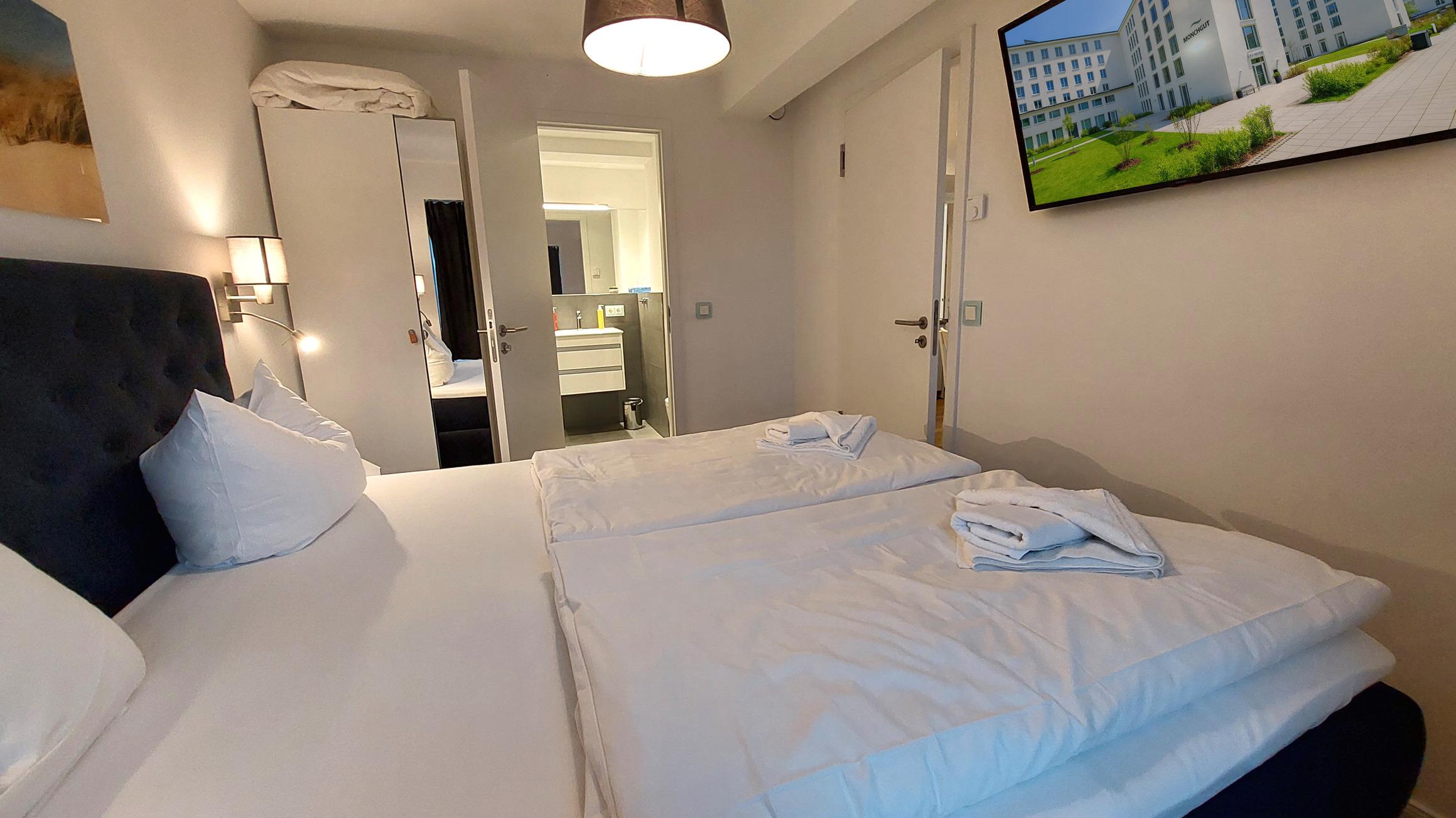 Die Wohnung verfügt über 2 vollwertige Schlafzimmer, jeweils mit einem Doppelbett, Kleiderschrank und eigenem Fernseher. Eines der Schlafzimmer hat außerdem ein eigenes Badezimmer ("Bad en Suite"). Das zweite Badezimmer ist ebenfalls ausgestattet mit WC, Waschtisch und ebenerdiger Dusche.